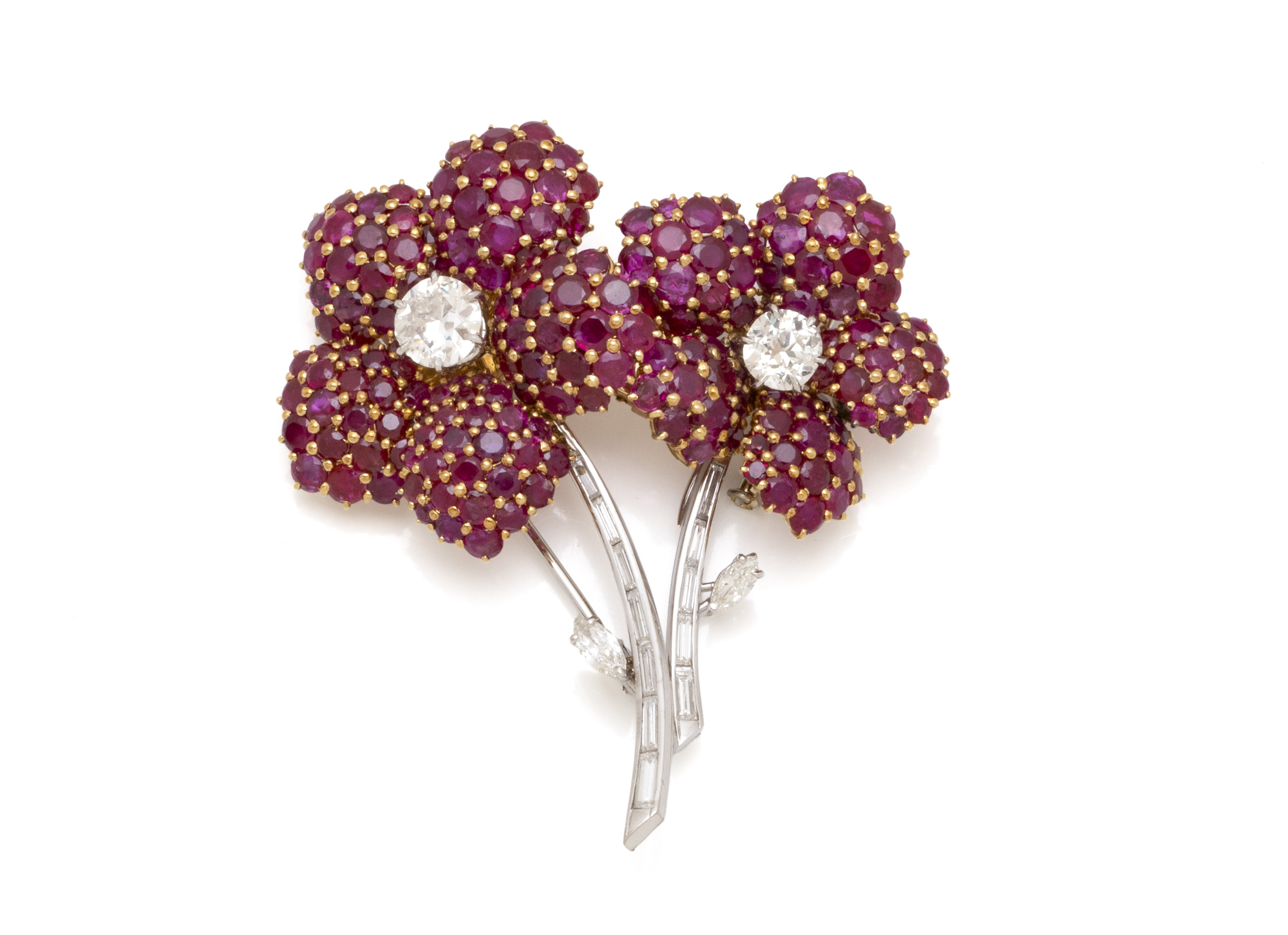 Lot n°NV2001Broche en 2 tons d'or 750 millièmes stylisant deux fleurs, centrées de diamant taille ancienne en serti griffe, les pétales habillés de rubis. Les tiges ornées de diamants taille baguette et navette. Travail français.
