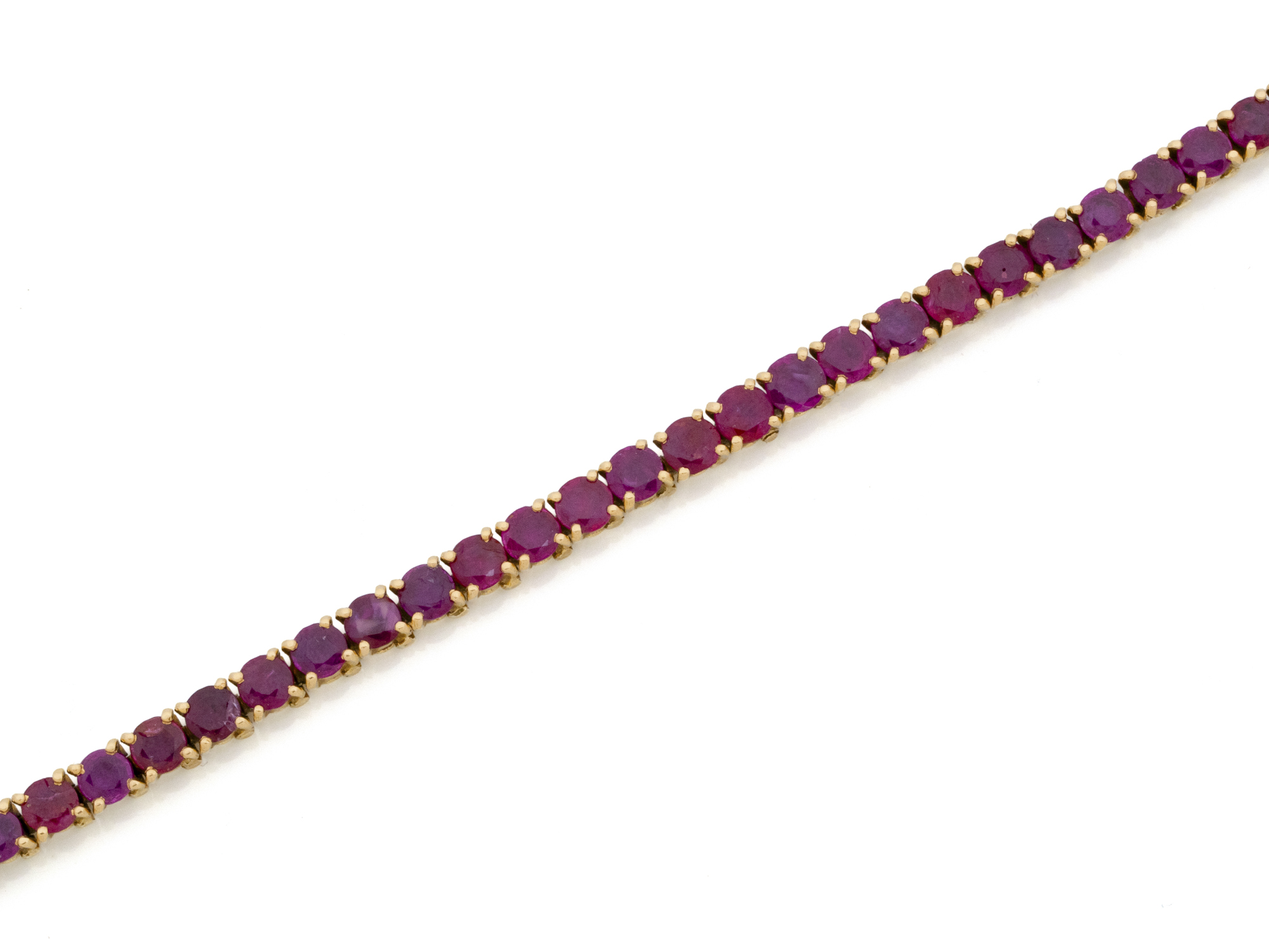 Lot n°NV2004Bracelet en or 750 millièmes orné d'une ligne de rubis ronds facettés en serti griffe, agrémenté d'un fermoir à cliquet sécurisé. Travail français.