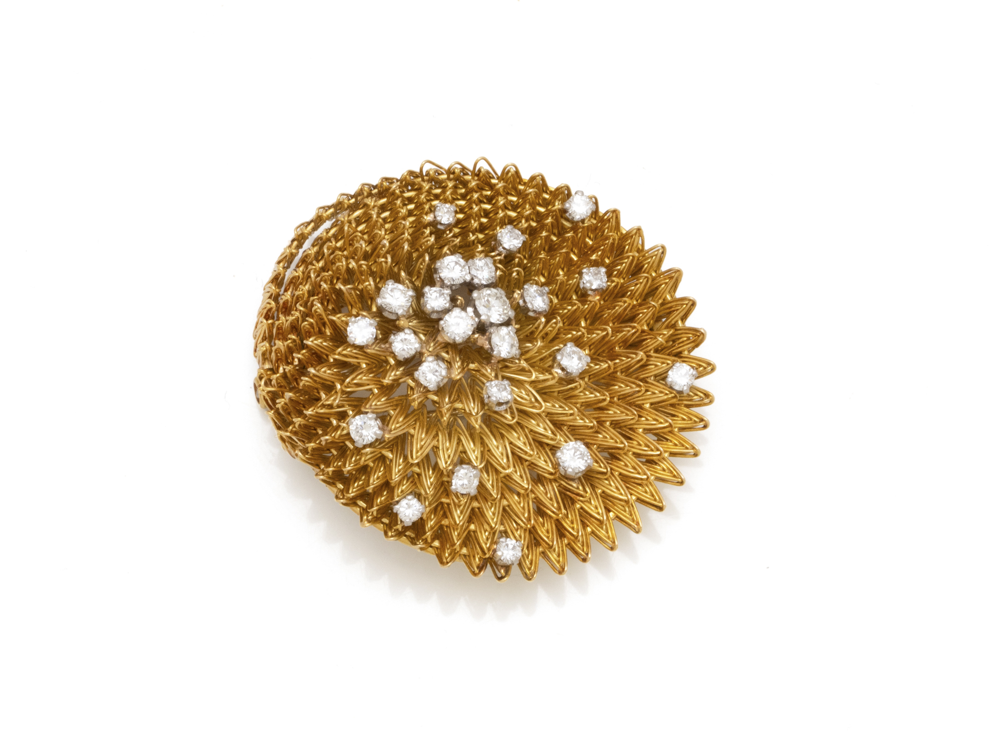 Broche en or 750 et platine 850 millièmes, diamants brillantés. Travail français, signé, numéroté.