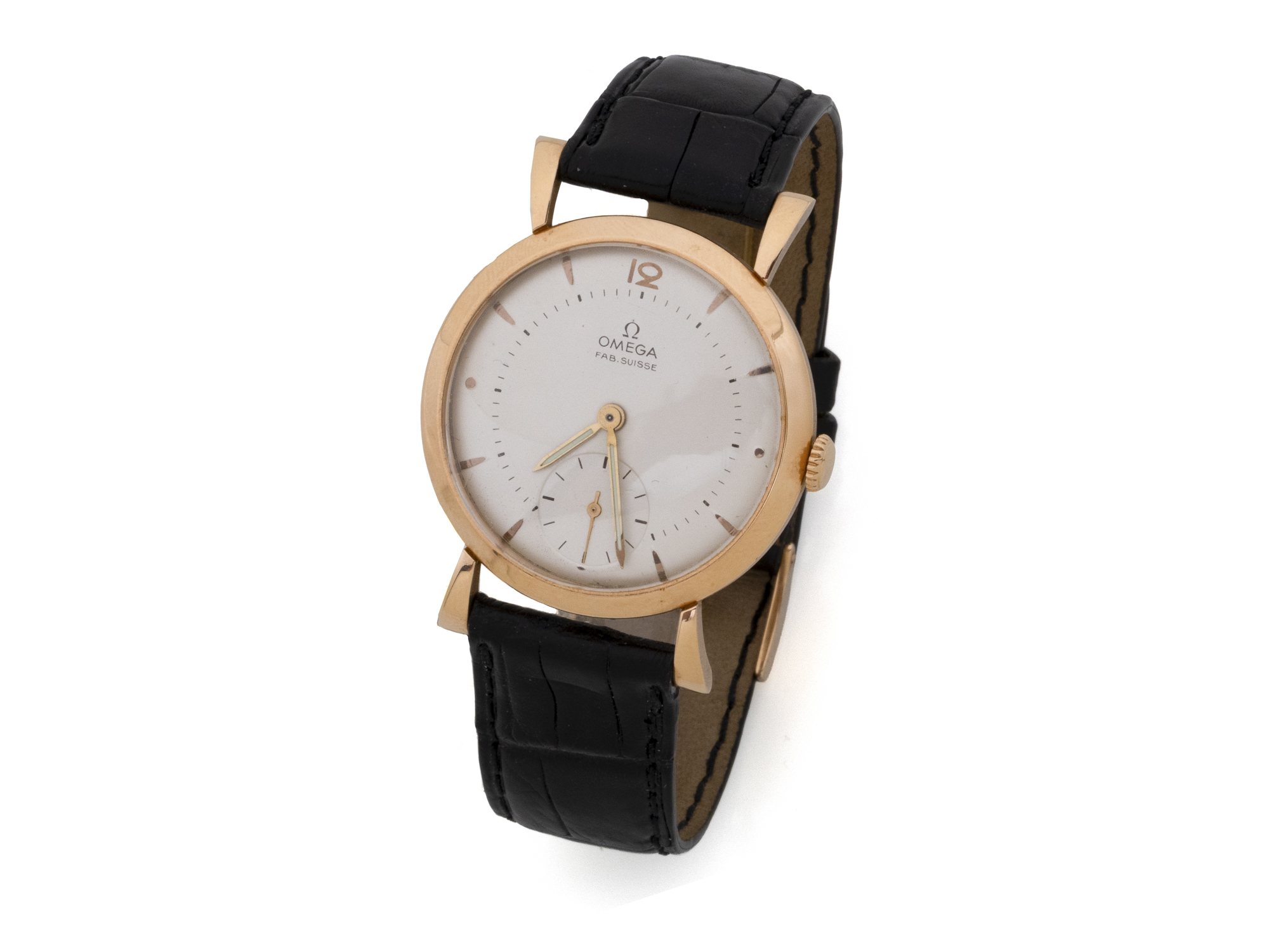 Montre bracelet d'homme en or 750 millièmes, boîtier de forme ronde, cadran ivoire satiné ? avec index épis, clous et chiffres arabes appliqués, compteur pour les secondes à 6 heures. Mouvement quartz rapporté. Bracelet cuir d'alligator avec boucle ardillon en or 750 millièmes, siglée.