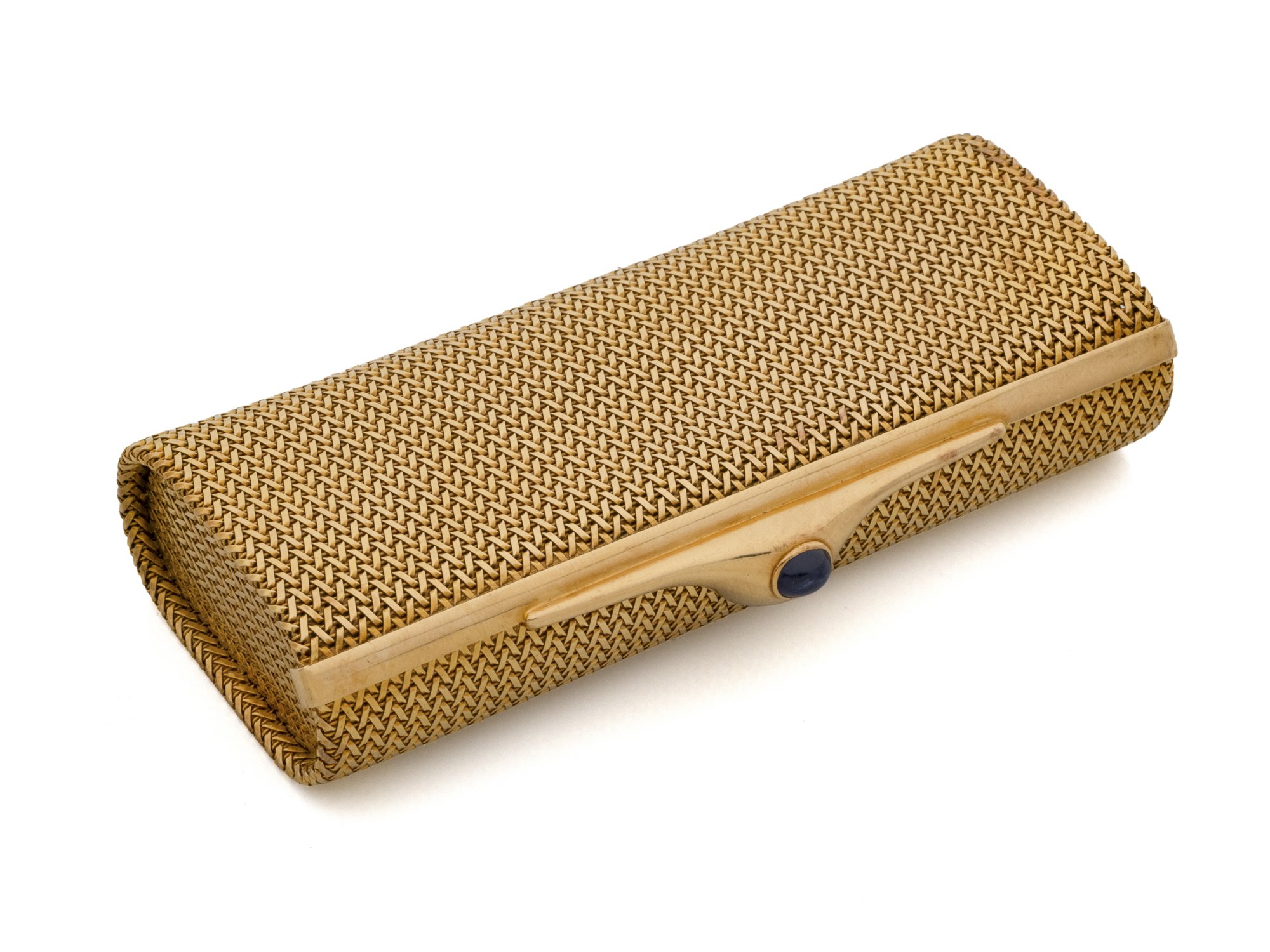 Étui à cigarettes en or 750 millièmes, mailles tressées, cabochon de saphir ?. Travail français, signé, numéroté. Il est accompagné de son écrin signé.
