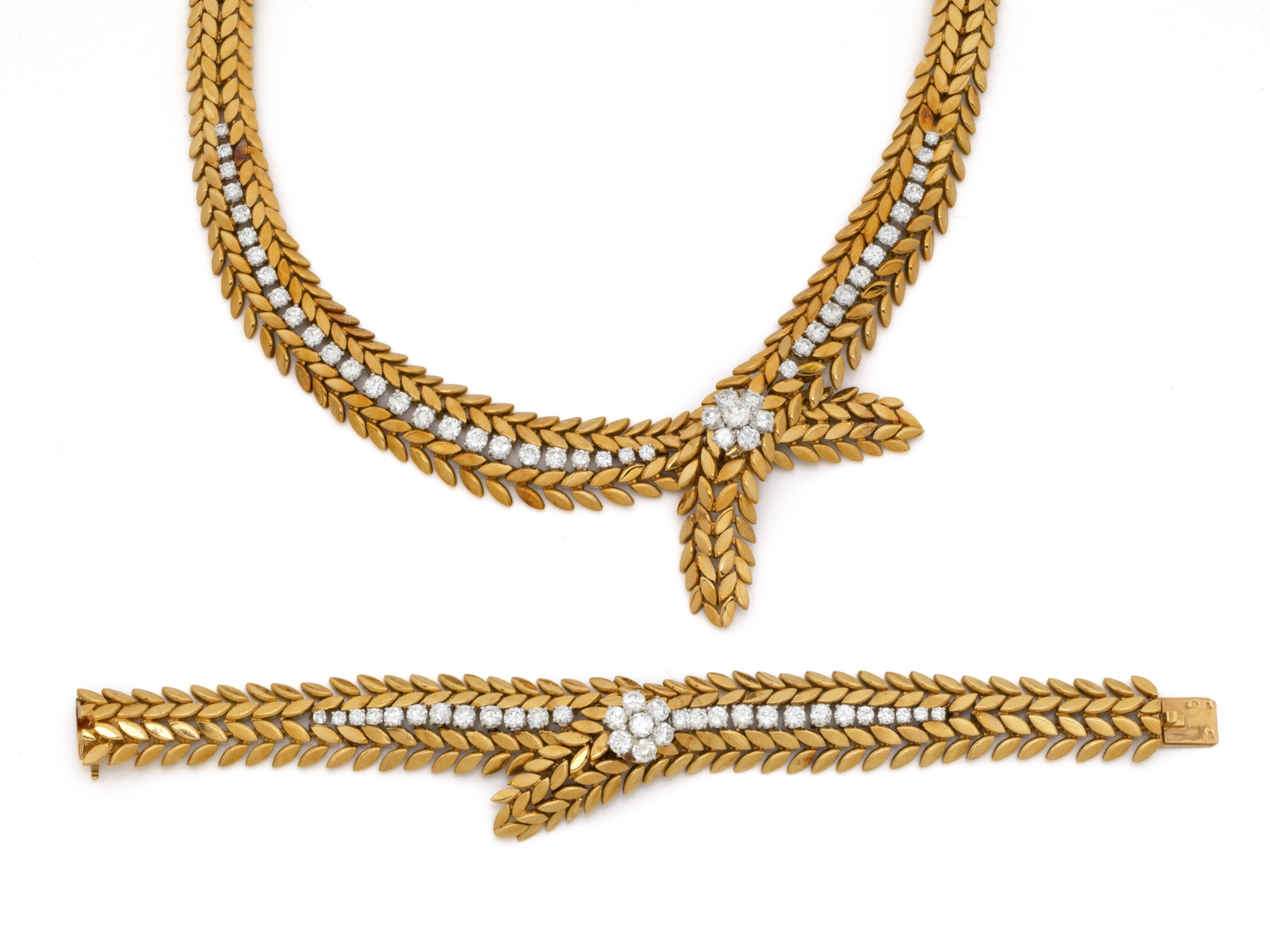 Demi parure en or 750 millièmes et platines 850 millièmes, diamants comprenant un collier et un bracelet. Vers 1950/1960.