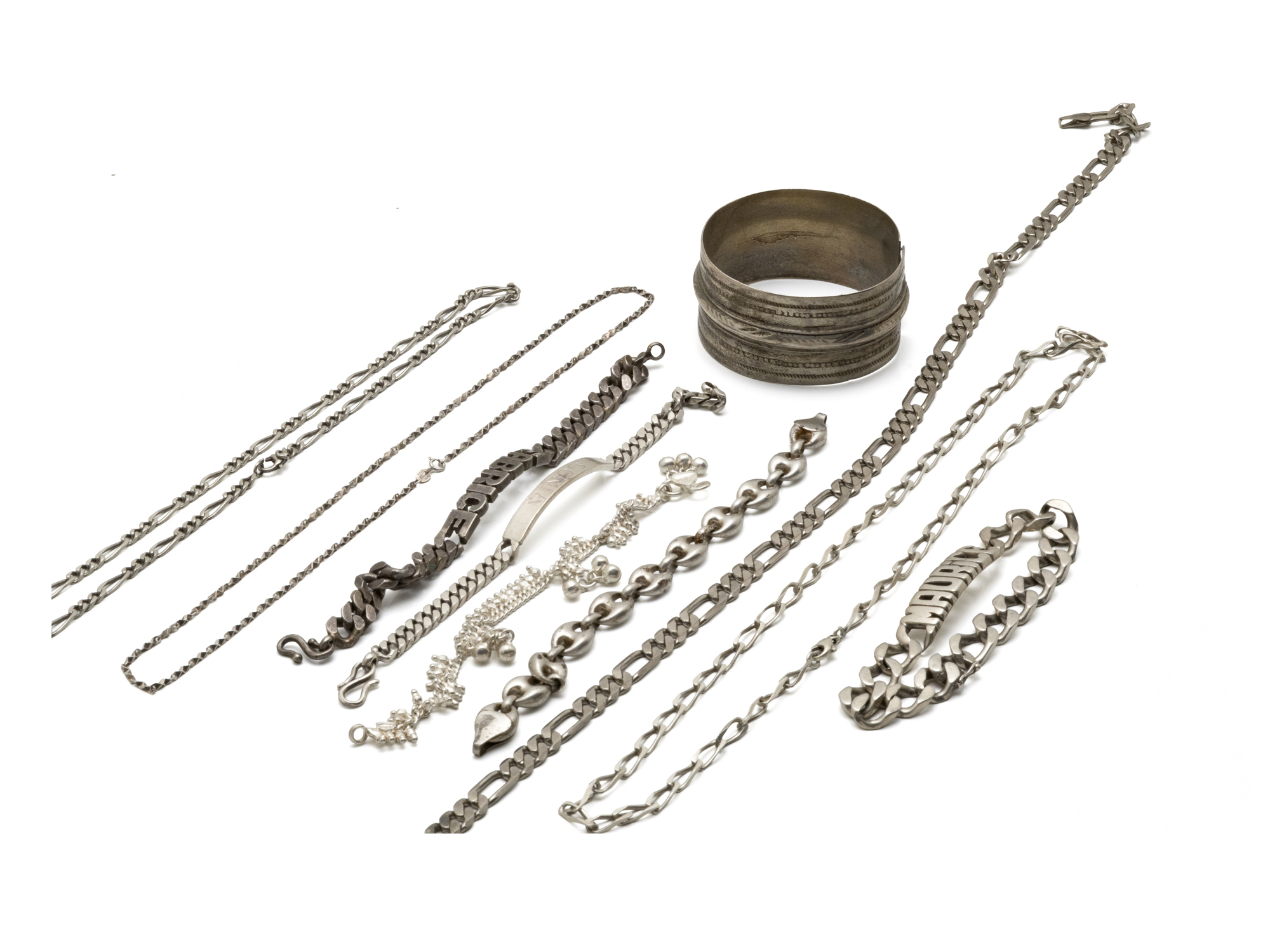 Lot n°57NV9001Lot en argent 800 millièmes composé de 4 chaînes, 5 bracelets articulés dont 3 gourmettes et un bracelet jonc ouvert.