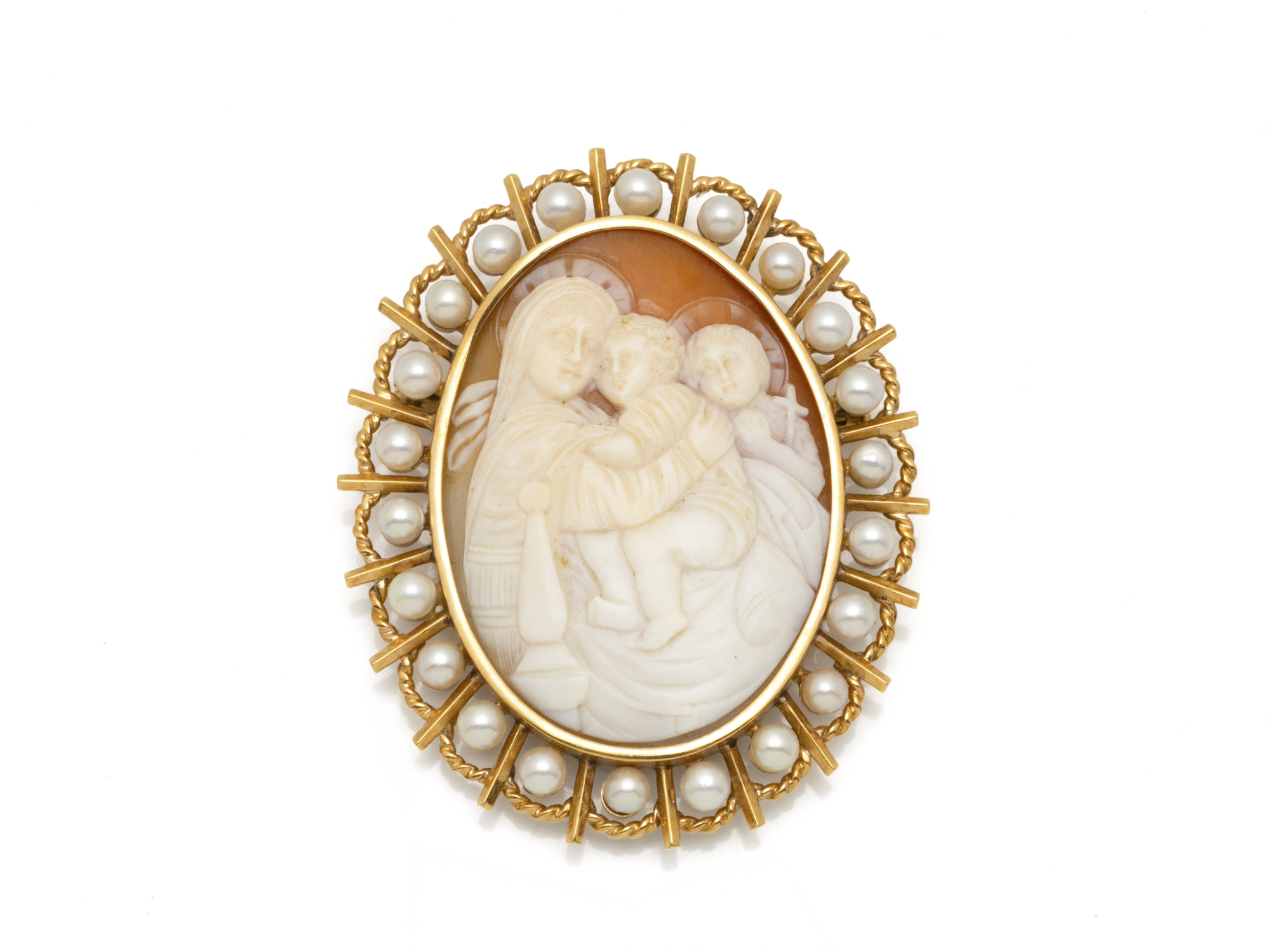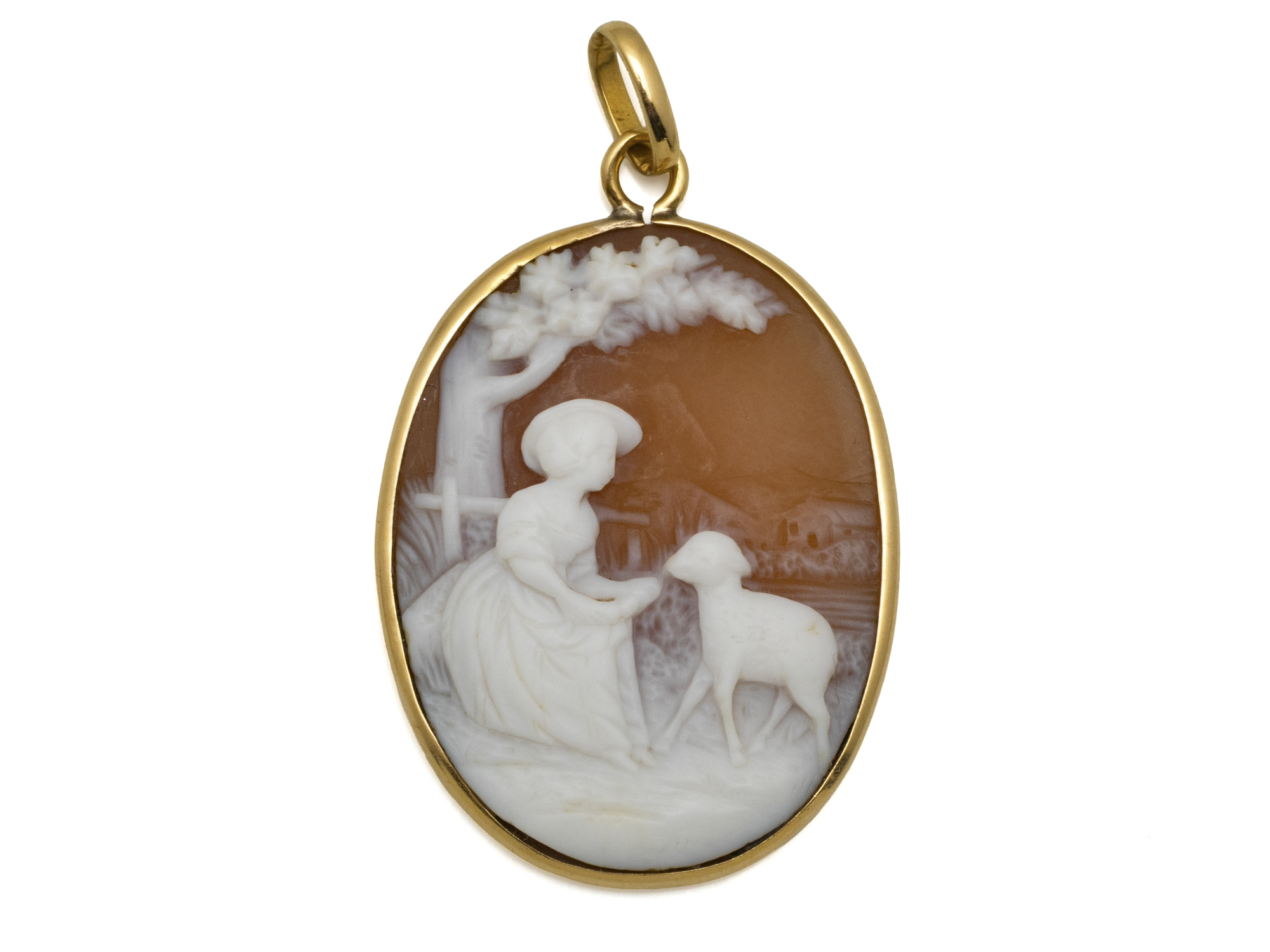 Lot n°25NV9185Belle broche en or 750 millièmes retenant un camée coquille en serti clos à décor symboliste. Elle est agrémentée d'une épingle et d'une chaînette de sécurité. Travail de la fin du XIX°siècle.