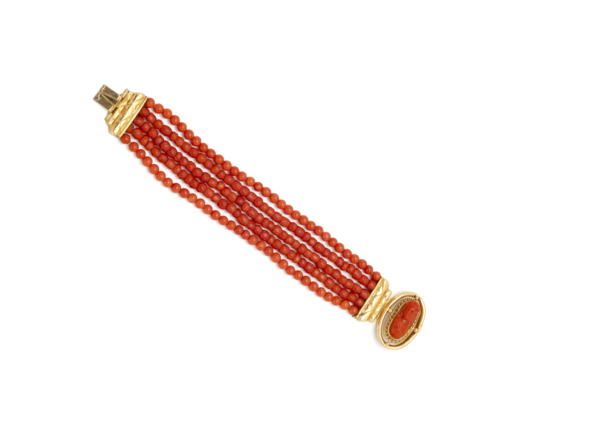 Lot n°34NV9006Bracelet articulé en or 750 millièmes composé de 5 rangs de perles de corail rondes et facettées. il est agrémenté d'un fermoir à cliquet décoré d'un camée en corail figurant une jeune femme en buste. Travail français de la fin du XIX° siècle.(petits chocs)