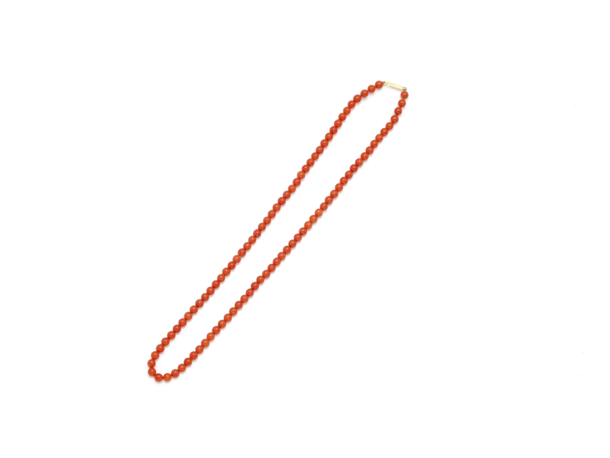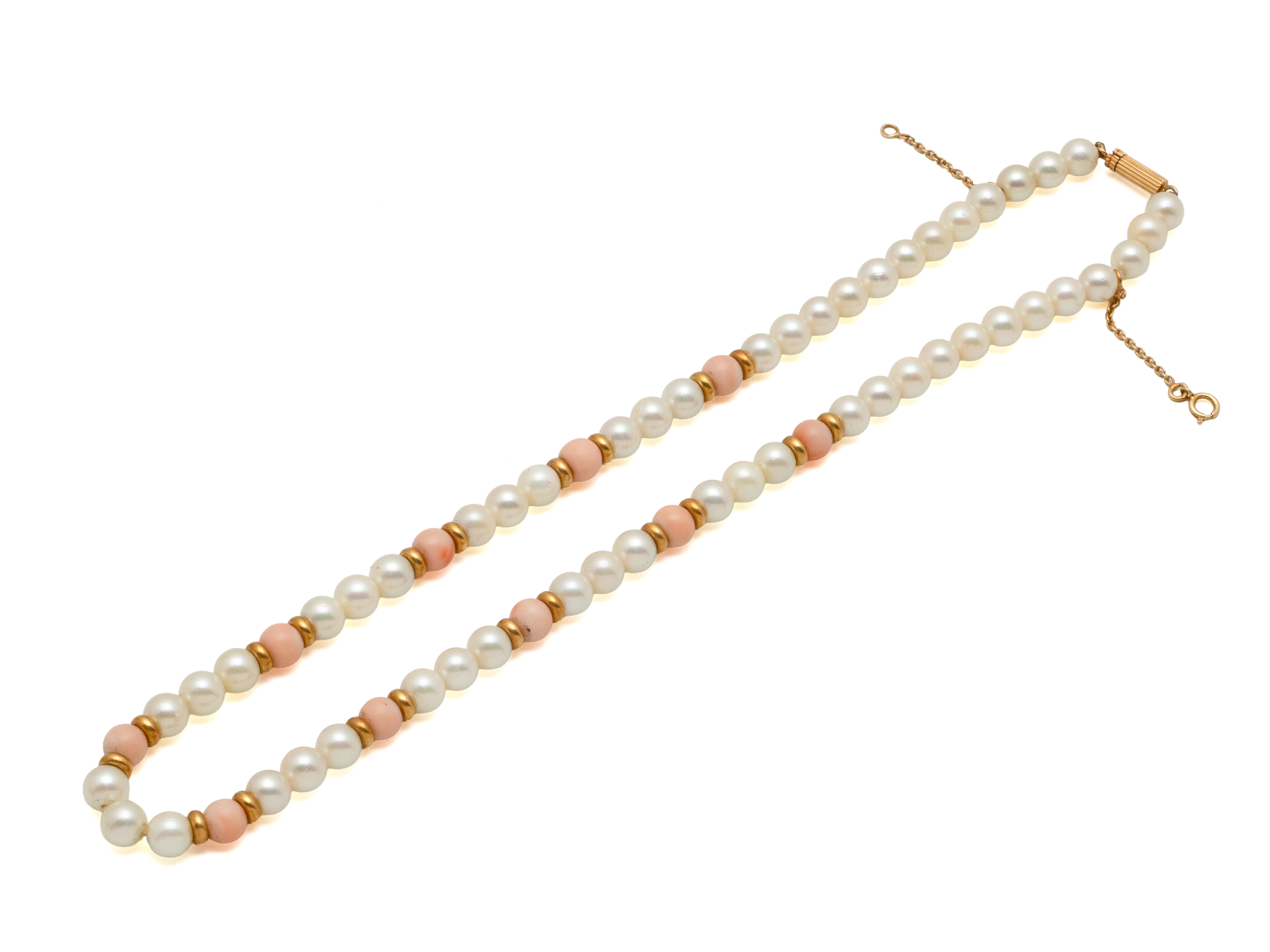 Lot n°238NV9084Collier composé d'un rang de perles de culture d'environ 5.8 mm agrémenté de perles de corail peau d'ange et de petites viroles. Il est agrémenté d'un fermoir à cliquet en or 750 millièmes rainuré avec chaînette de sécurité. Travail français.