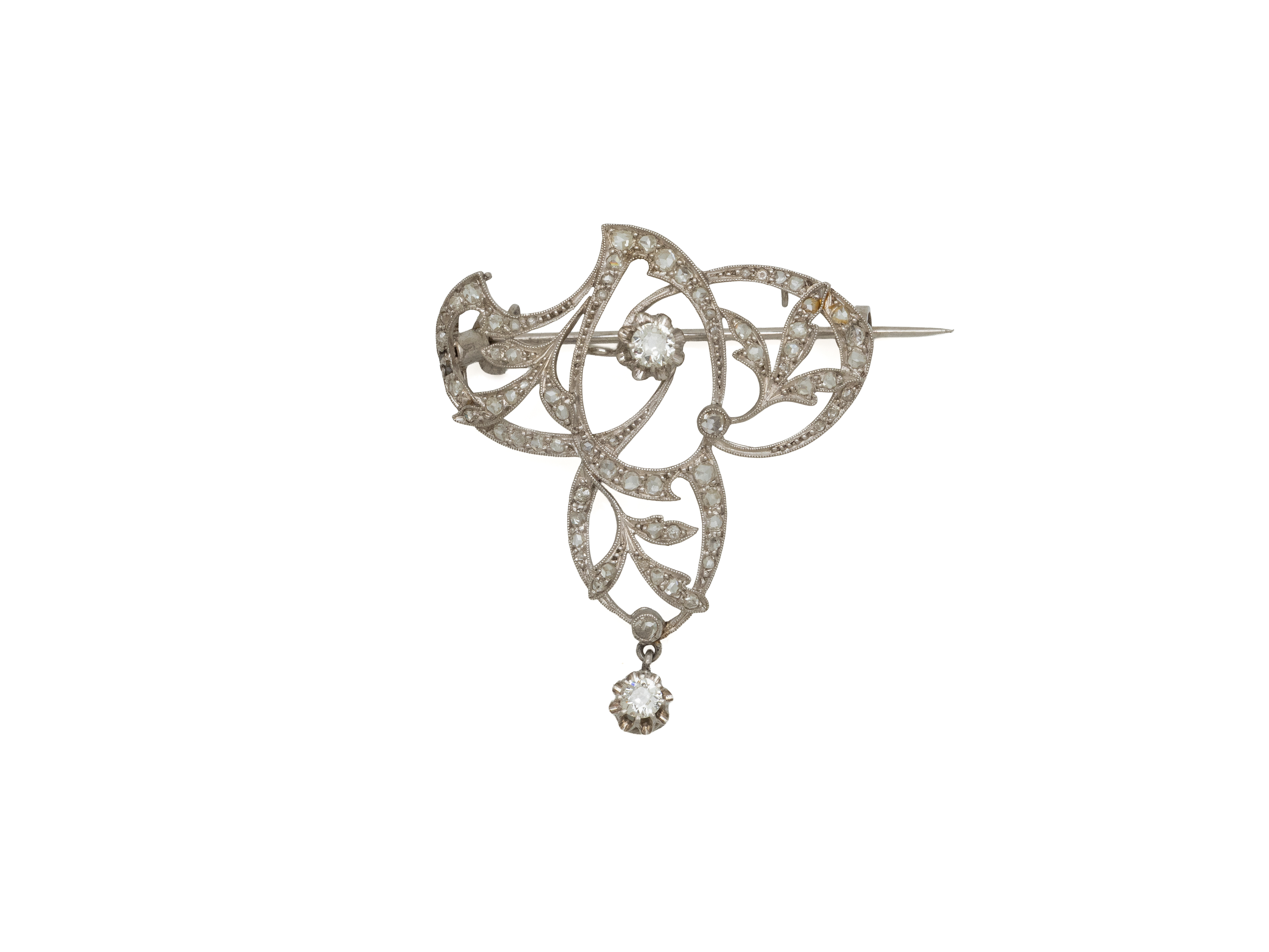 Lot n°35NV9008Broche pendentif en platine 850 millièmes, à décor ajouré de volutes et feuillagé, ornée de 2 diamant taille ancienne en serti griffe dont un en pampille, rehaussée de roses diamantées. Elle est retenue par une fine chaîne en platine 850 millièmes, agrémentée de fermoir anneau ressorts. Travail de la fin du XIX°, début XX° siècle. (petit accident sur la chaîne)
