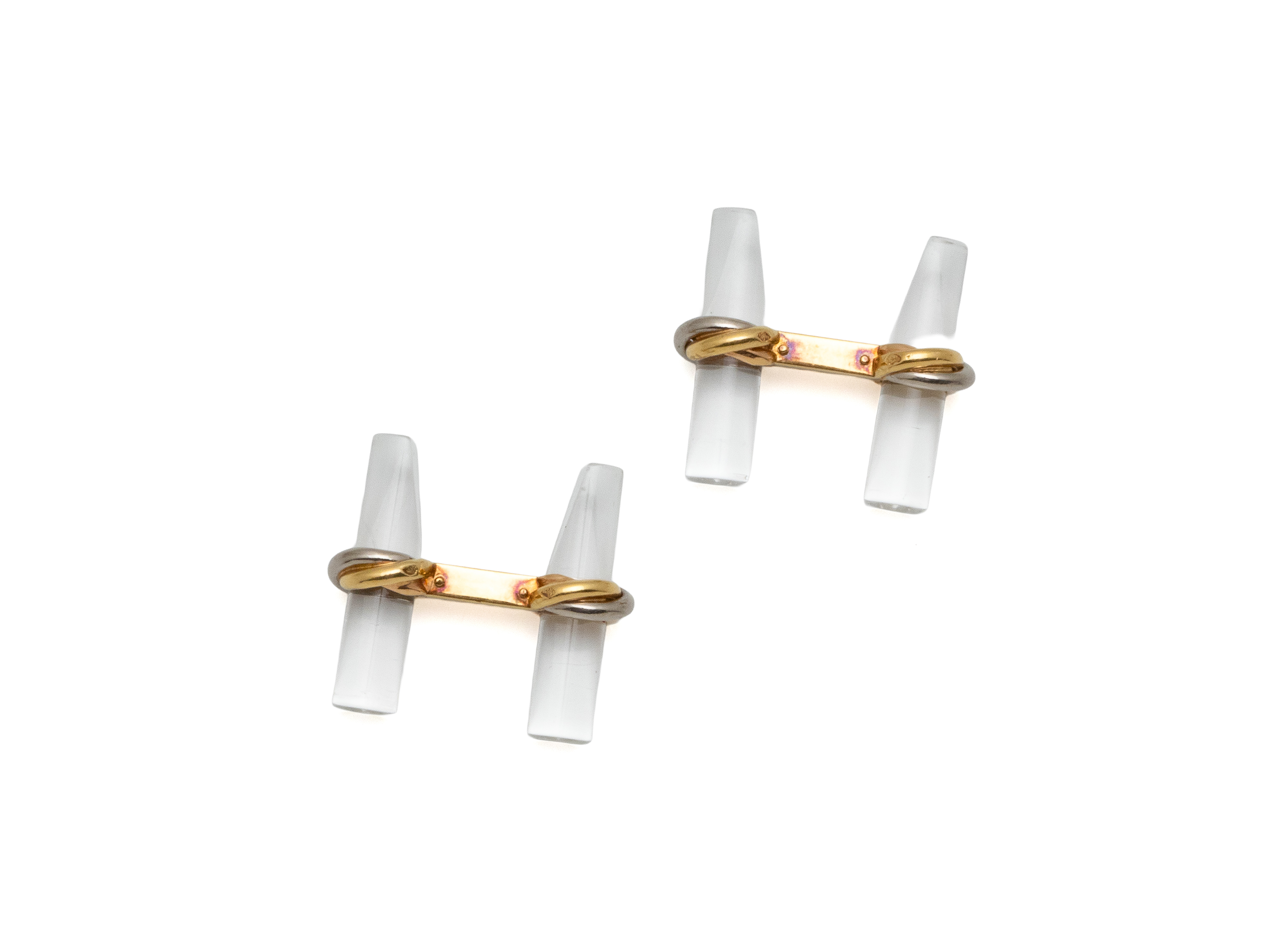 Paire de boutons de manchettes 3 ors 750 millièmes, ornés de bâtonnets interchangeables en cristal. Signés, numérotés. Ils sont accompagnés de leur étui et d'un jeu de 2 bâtonnets supplémentaires en acier.