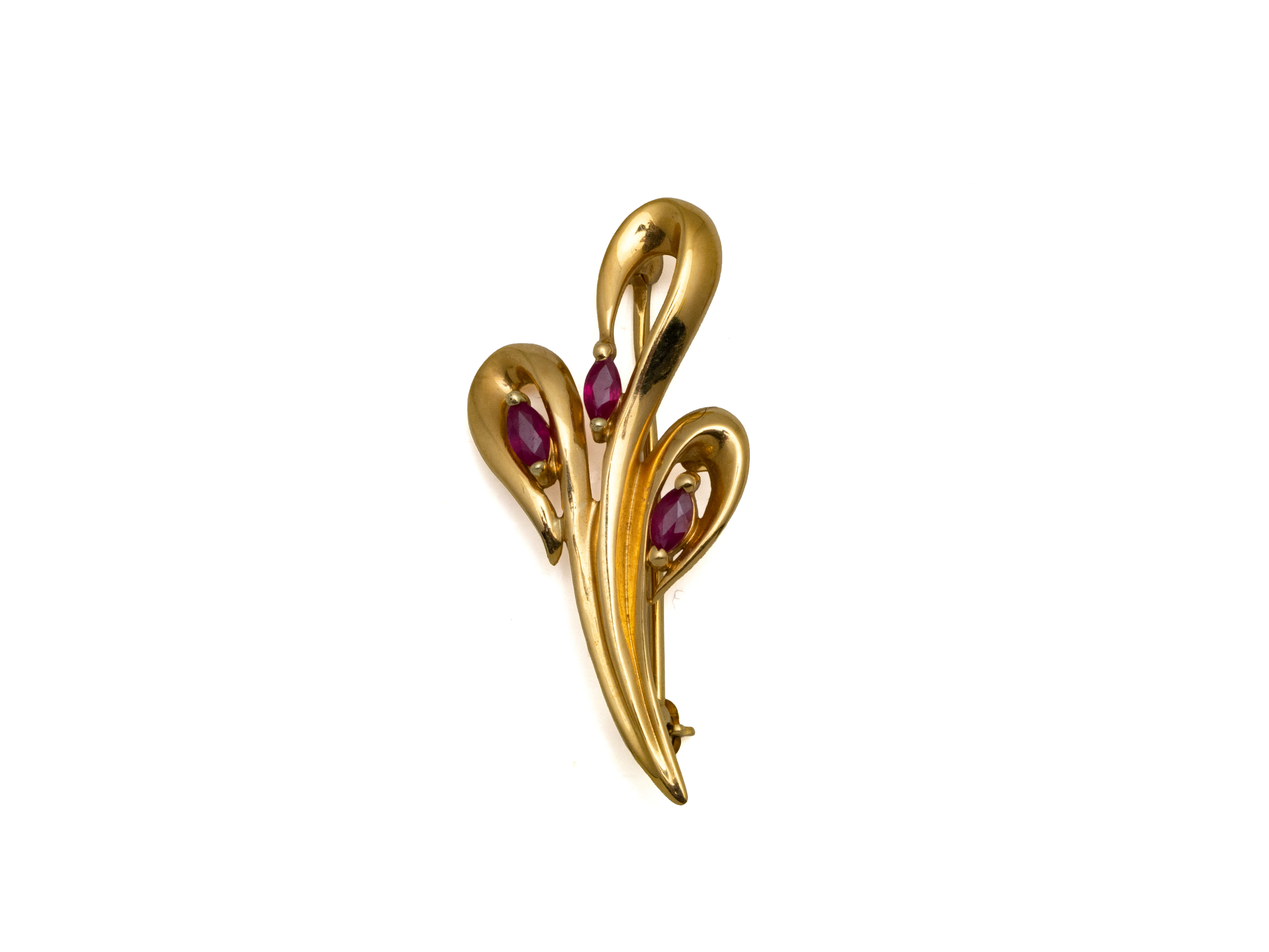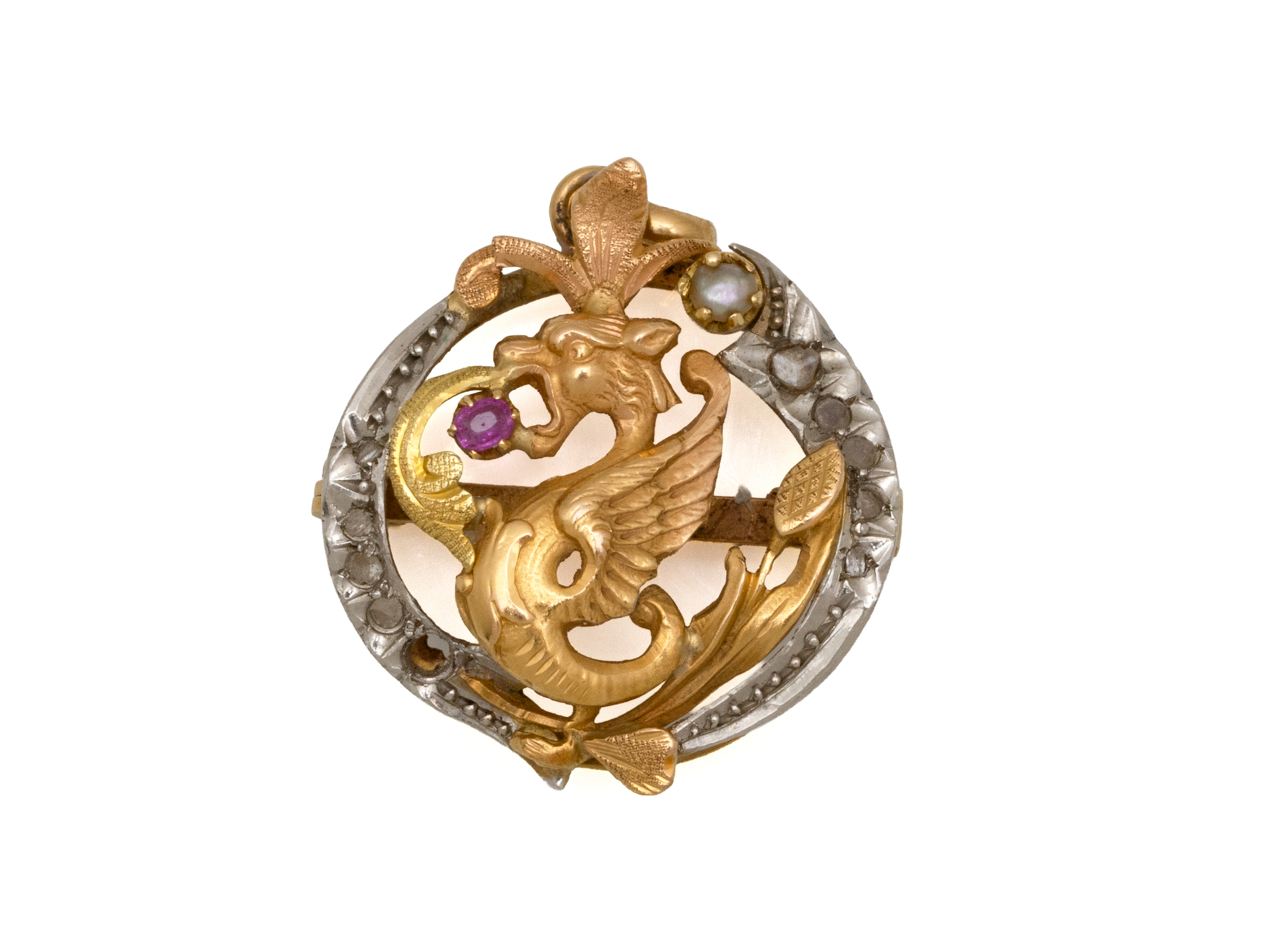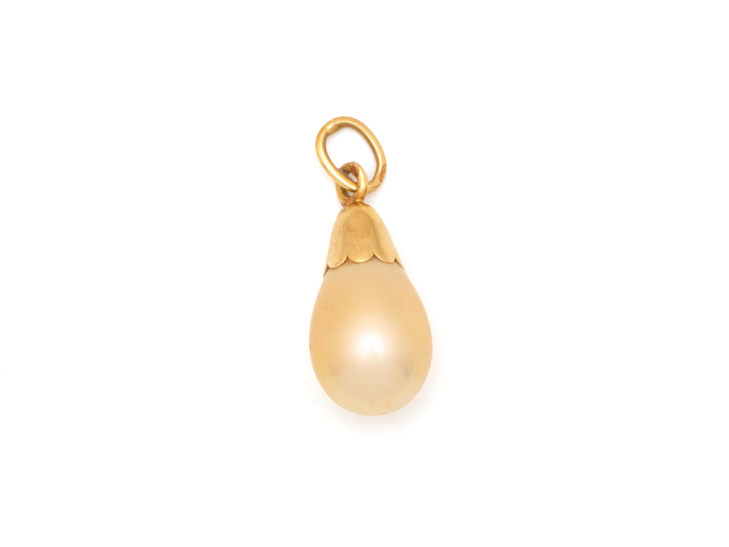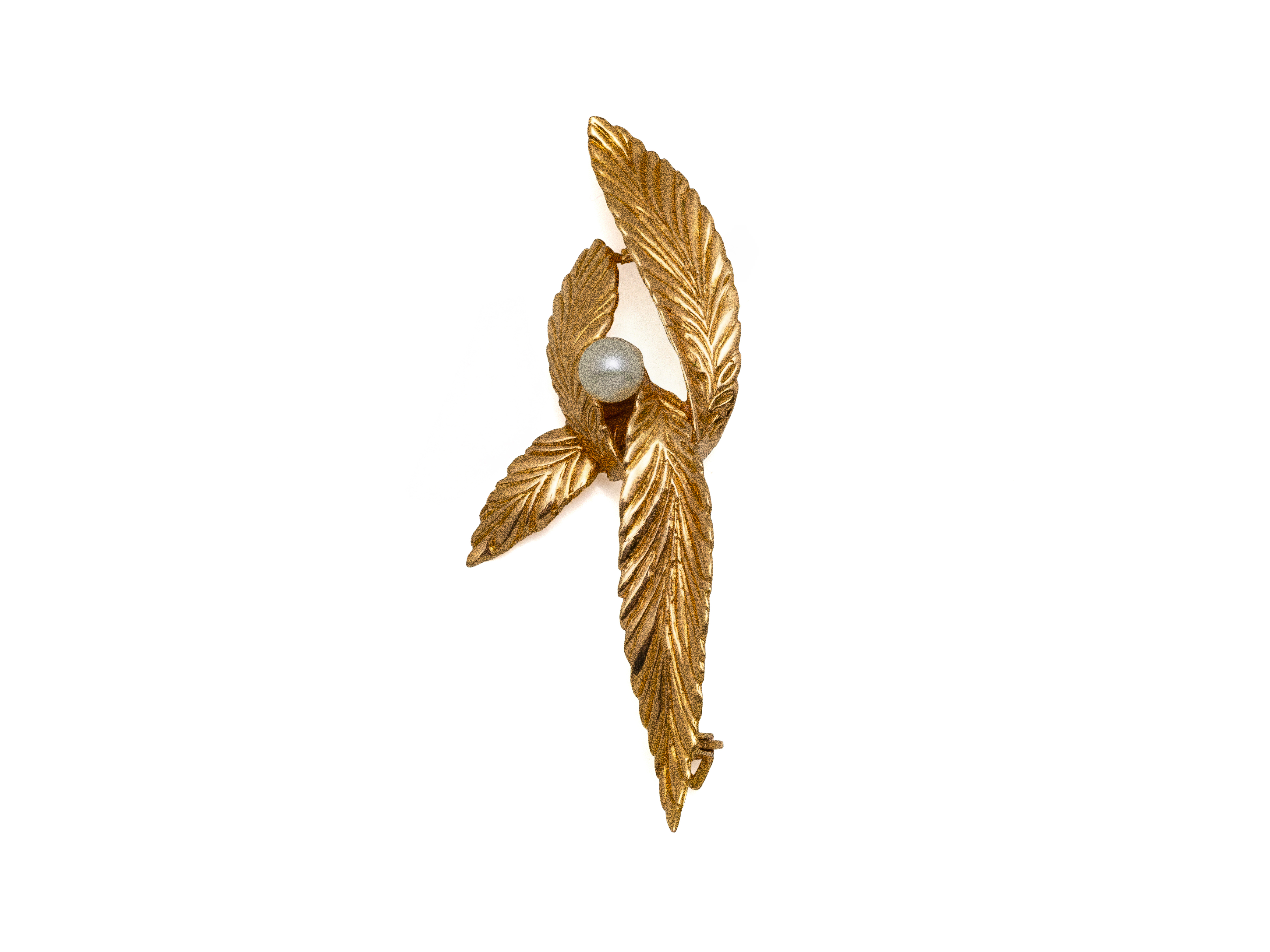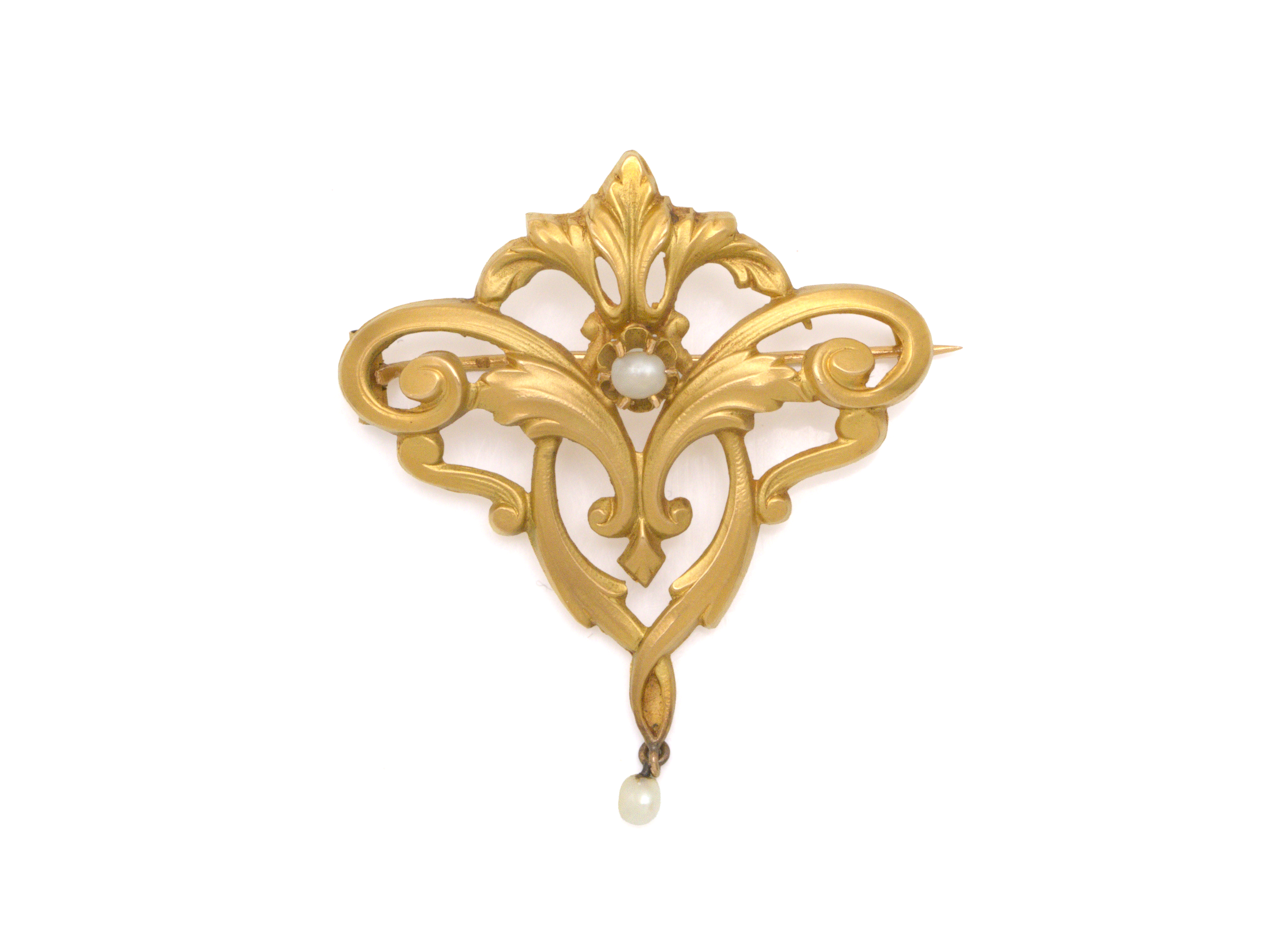 Lot n°213NV9037Broche pendentif en or 750 millièmes estampé, à décor satiné de rinceaux feuillagés et de volutes, ponctuée d'une demi-perle et d'une petite perle fine en pampille. Travail français vers 1900.
