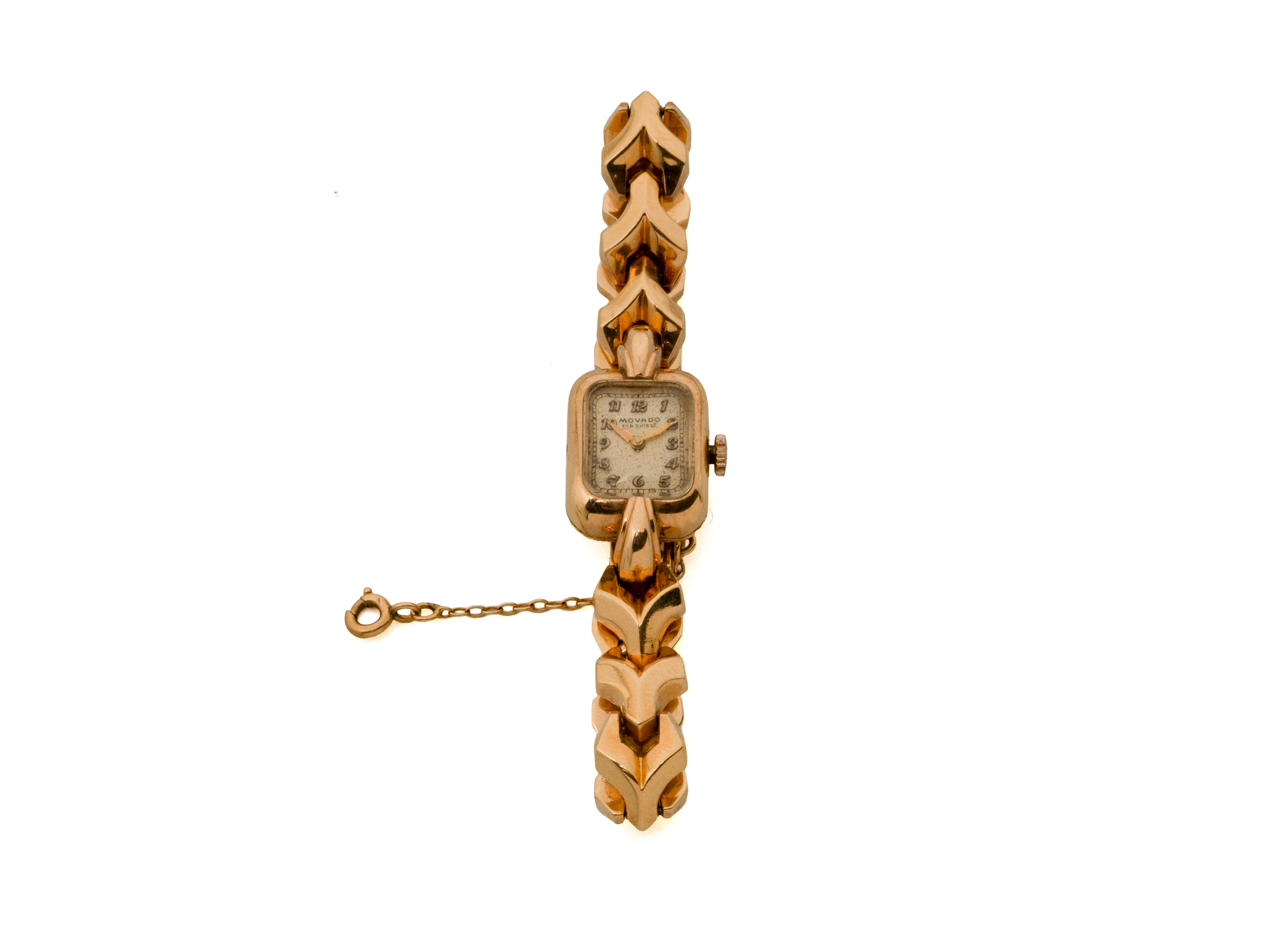 Montre bracelet de dame en or 750 millièmes, cadran ivoire taché avec chiffres arabes appliqués. Attaches de type corne. Mouvement mécanique signé. Bracelet articulé en or 750 millièmes, maillons à décor de chevrons avec fermoir à cliquet et chaînette de sécurité. Travail français pour la boîte et le bracelet, vers 1950. (petites usures)