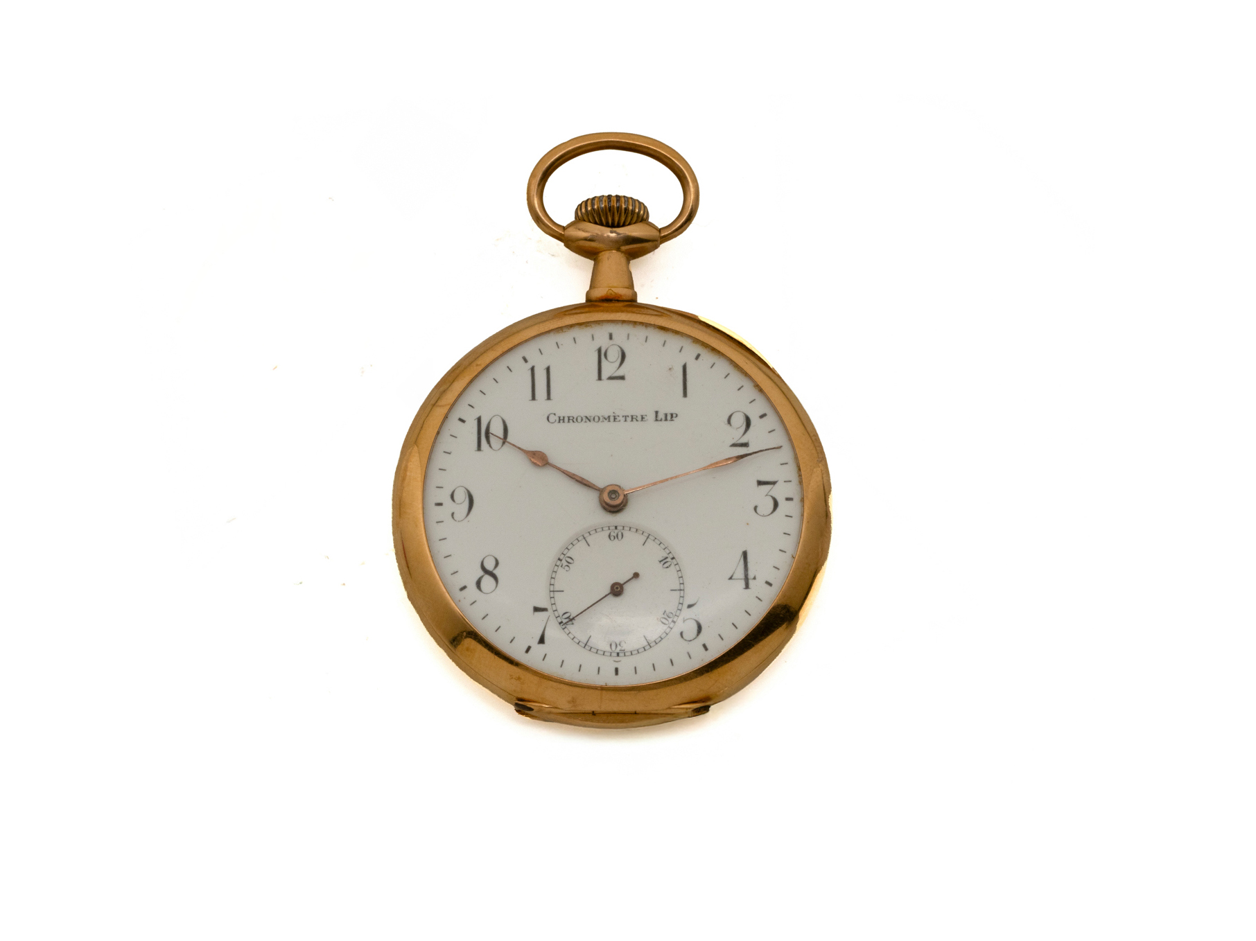 Lot n°206NV9026Montre de poche en or 750 millièmes, cadran émaillé blanc avec chiffres arabes peints, petite trotteuse à 6 heures. Cuvette intérieure en or 750 millièmes. Dos de boîte décoré d'un mavelot ciselé à décor de rinceaux feuillagés. Mouvement mécanique, remontage au pendant, échappement à ancre, spiral Breguet. Cadran signé ''Chronomètre LIP''. Travail français vers 1900. (bosses sur la carrure, rayures)