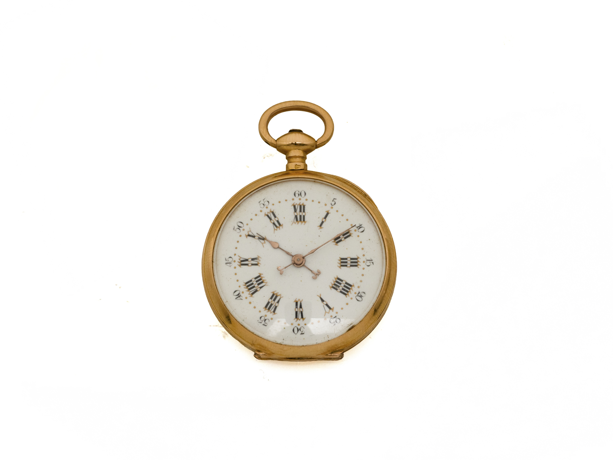 Lot n°40NV9027Petite montre de poche en or 750 millièmes, cadran émaillé blanc avec chiffres romains peints. Dos de boîte finement ciselé à décor de corne fleurie délicatement émaillée. Cuvette intérieure en or 750 millièmes. Mouvement mécanique, remontage à clef, échappement à cylindre. Travail français de la fin du XIX° siècle.