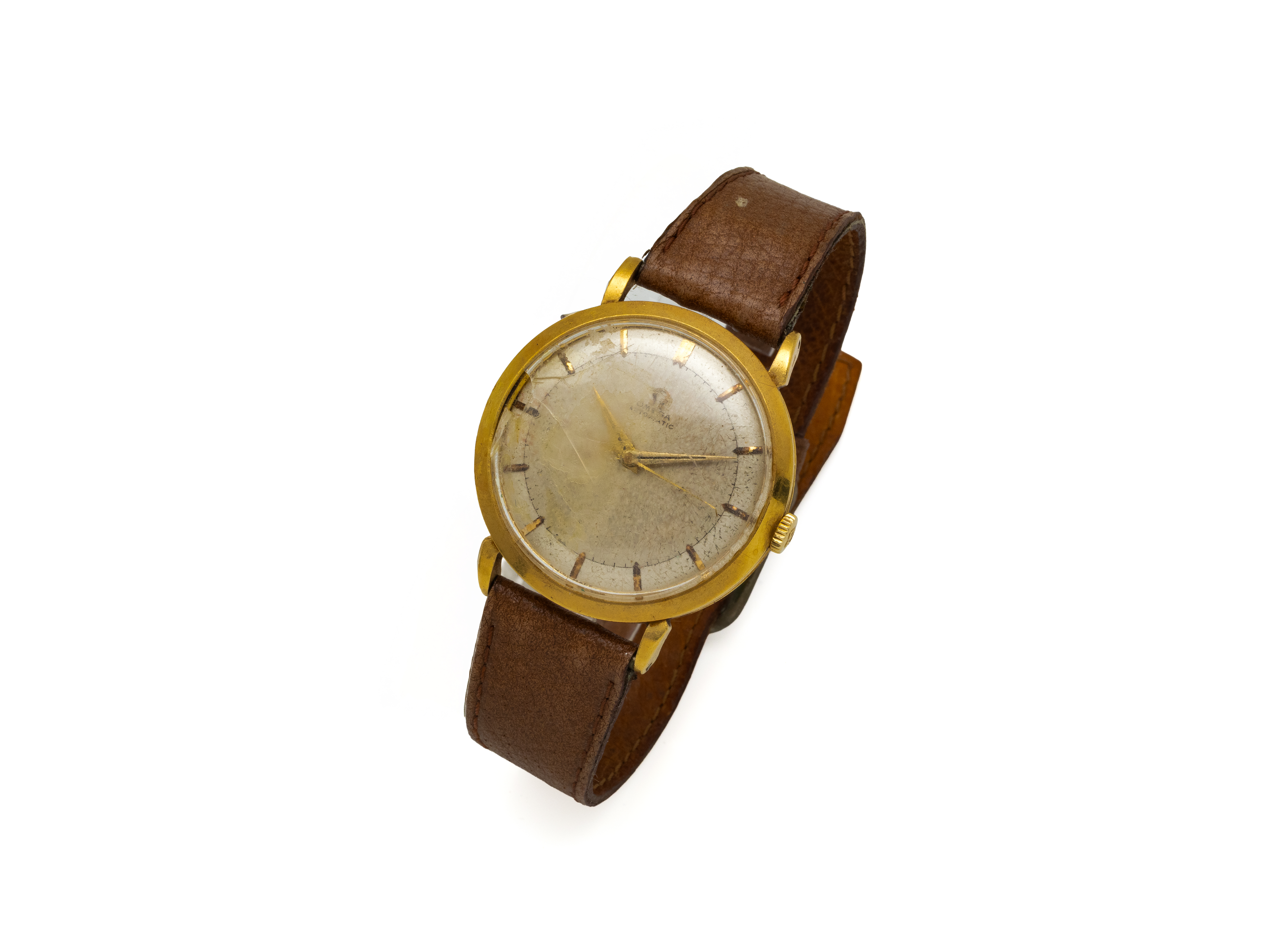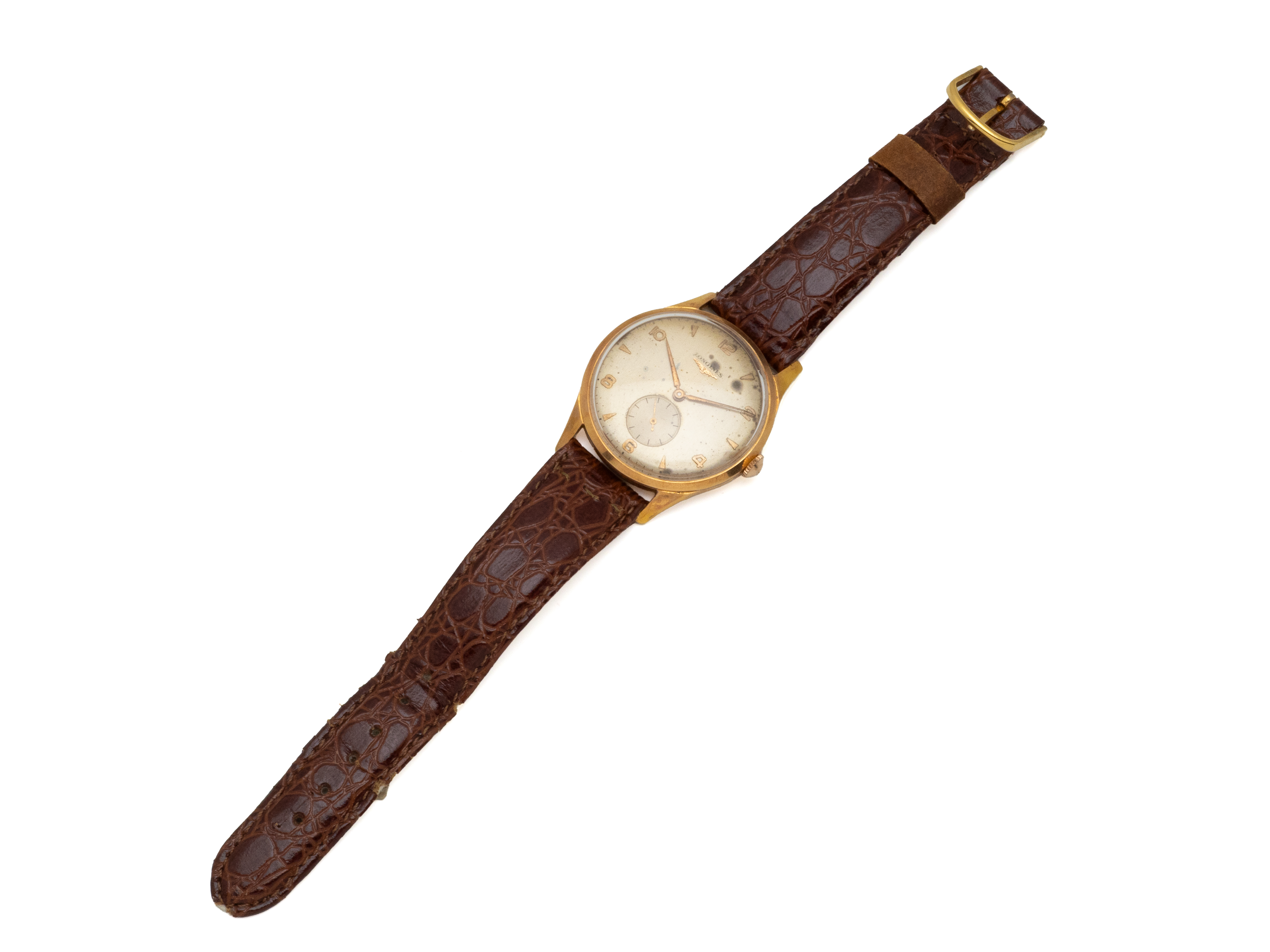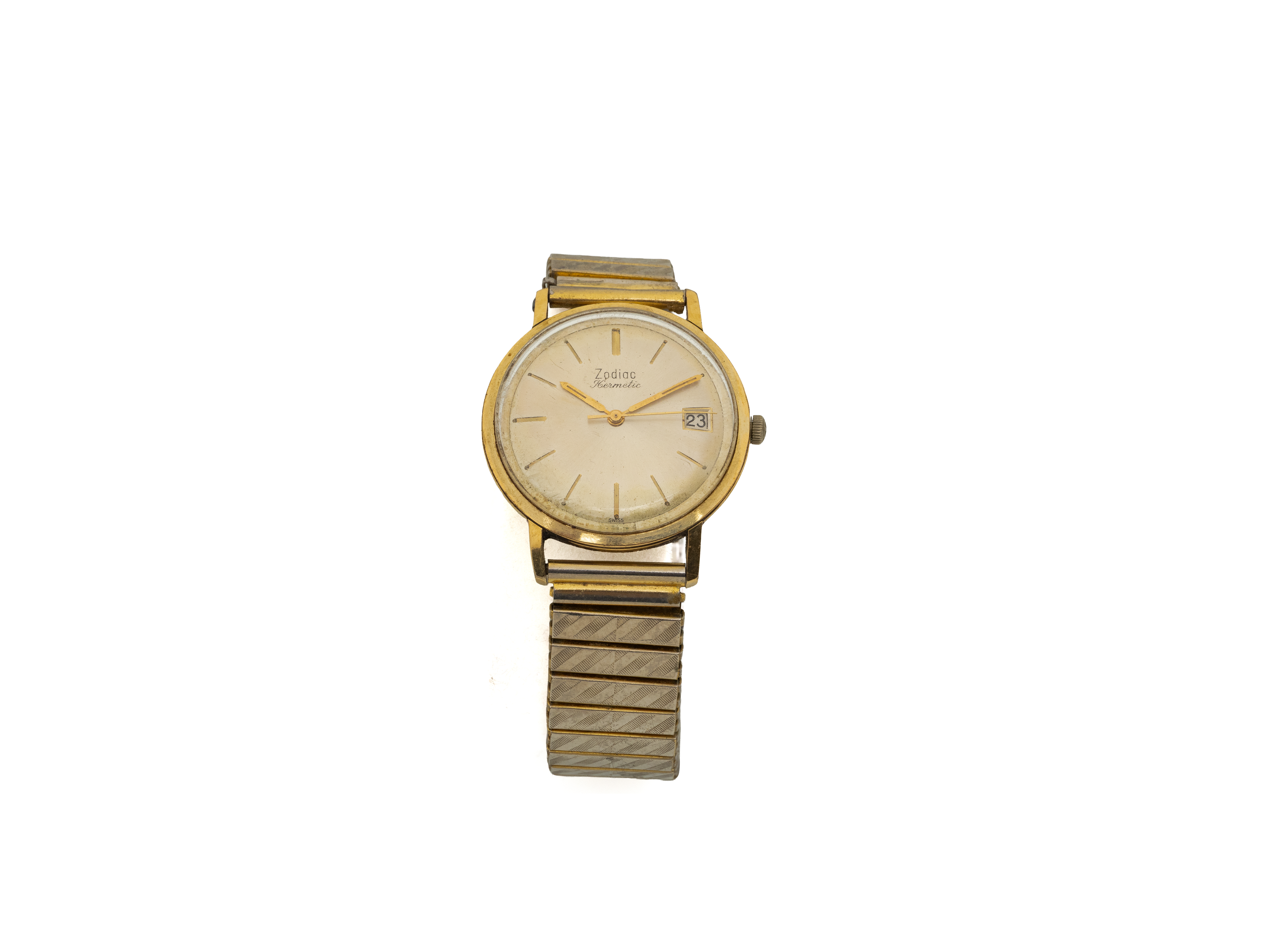 Montre bracelet d'homme en métal plaqué or, cadran ivoire rayonnant taché avec index bâtons gravés, affichage de la date par guichet à 3 heures. Fond vissé en acier. Mouvement mécanique signé. Bracelet extensible rapporté en métal. Vers 1950/60. (rayures, usures, passage de la date non fonctionnel)