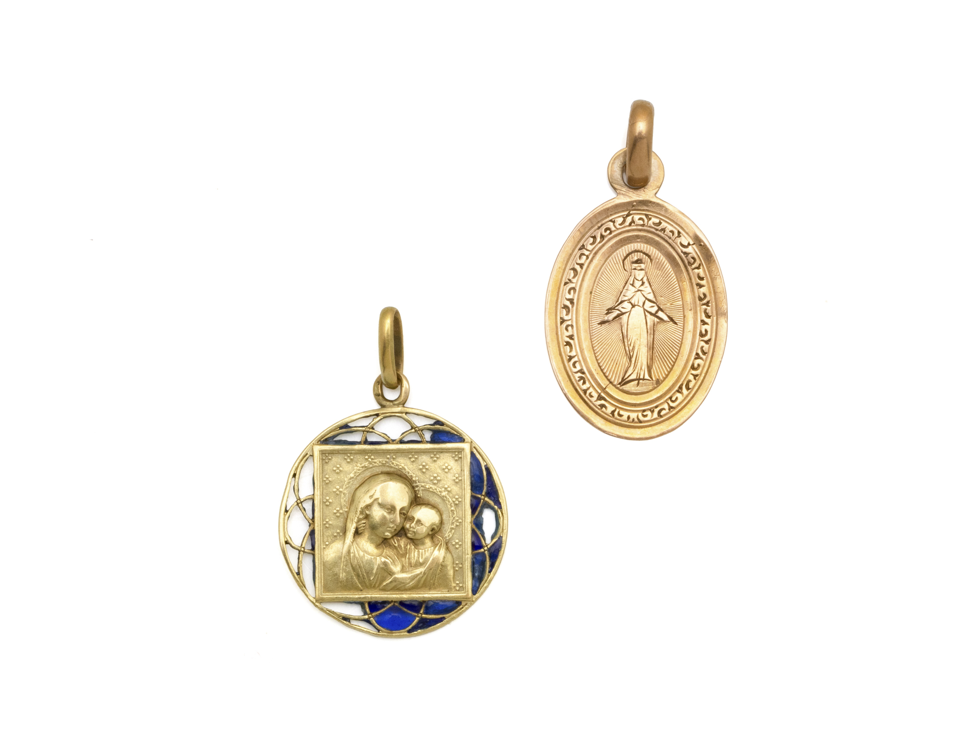Lot n°210NV9034Lot en or 750 millièmes composé de 2 médailles religieuses datées et chiffrées dont une habillée d'émail plique à jour. Vers 1900. (en l'état)