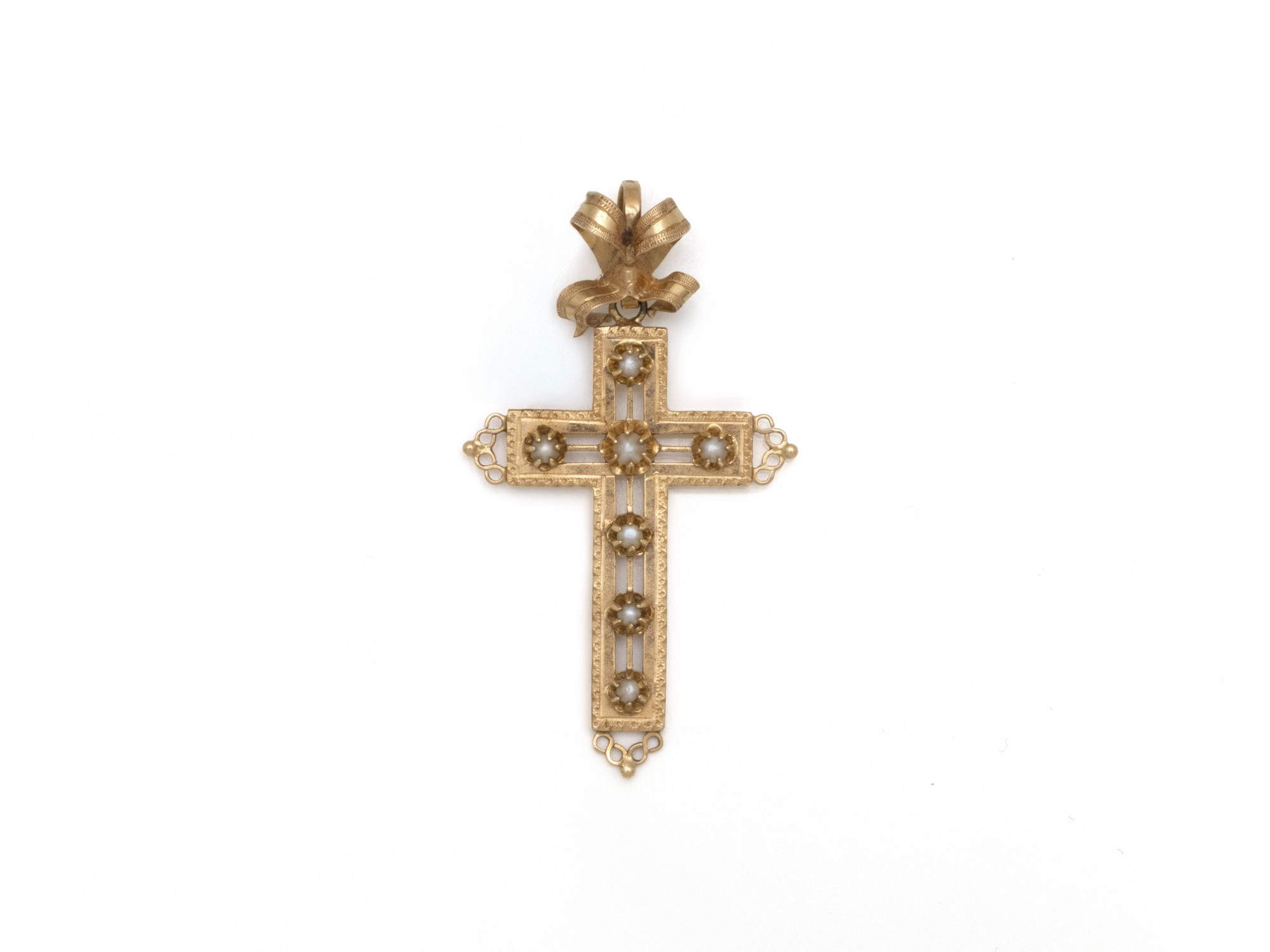 Lot n°212NV9036Pendentif en or 750 millièmes, retenant une croix finement ciselée, ponctuée de demi-perles. La bélière enrichie d'un ruban noué. Travail français d'époque Napoléon III.