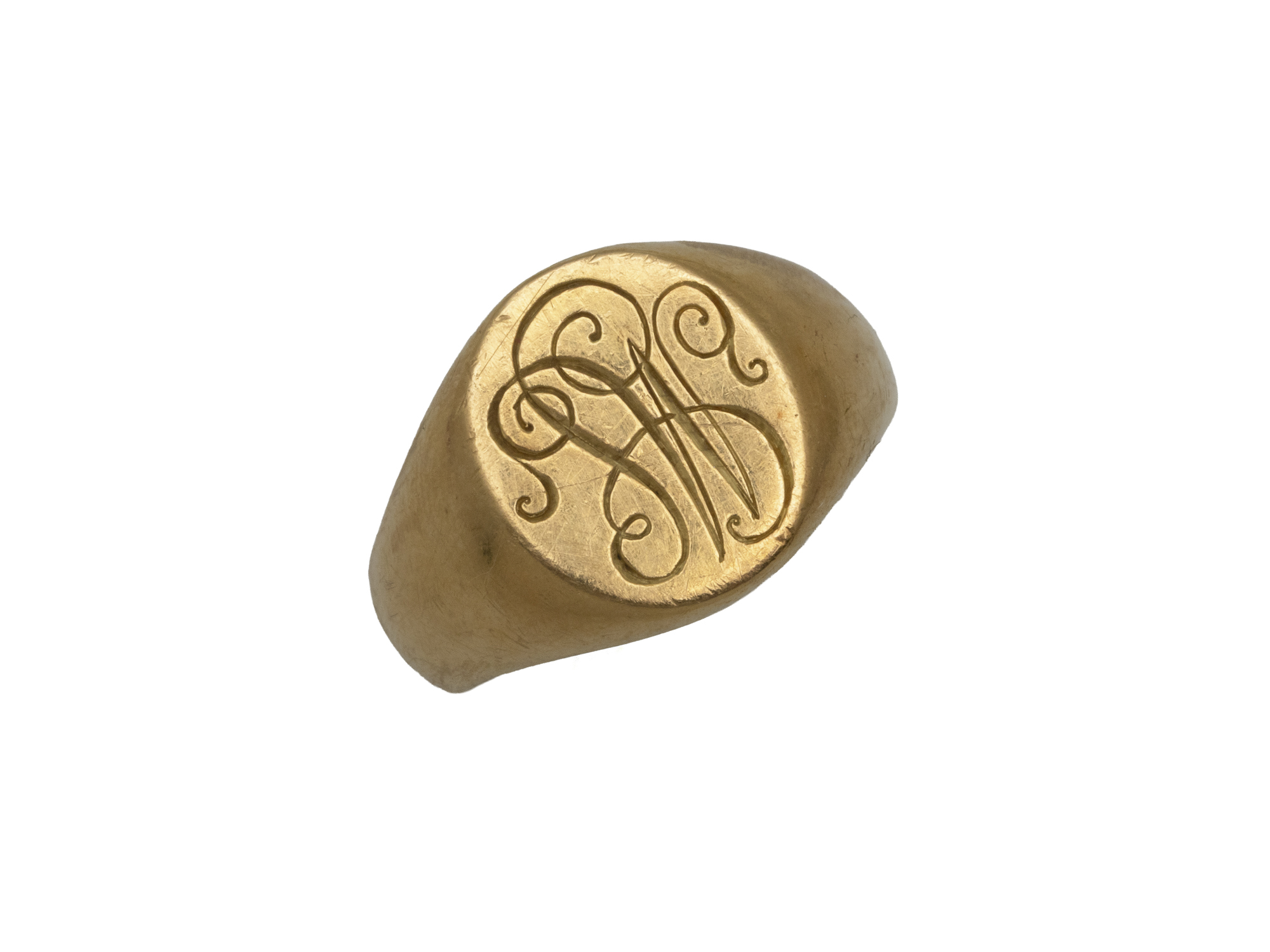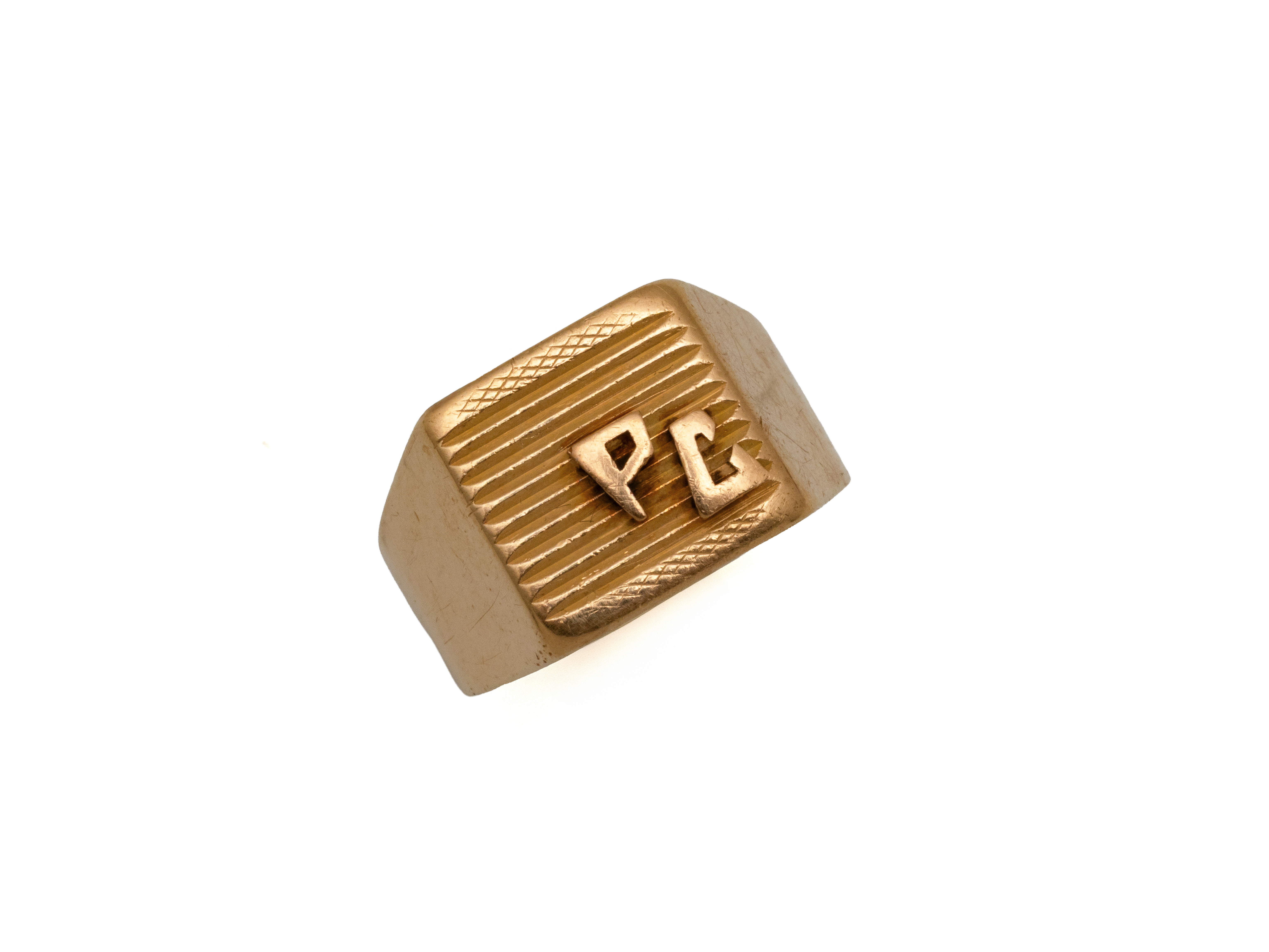 Lot n°61NV9093Bague chevalière en or 750 millièmes, monogrammée ''PC'' sur fond ciselé rainuré. Inscription datée à l'intérieur de l'anneau. Travail français vers 1940. (légère déformation du corps de bague)