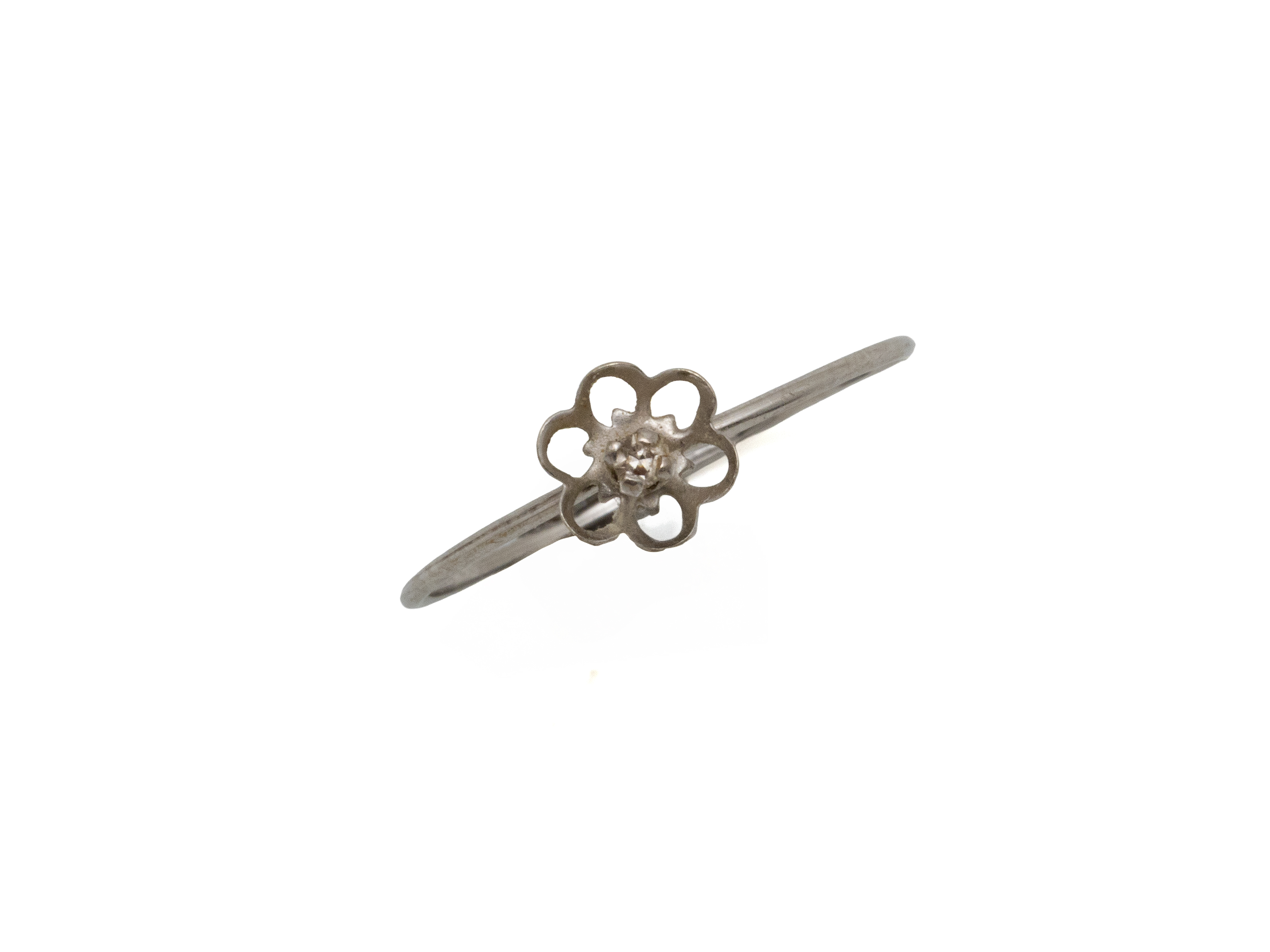 Lot n°219NV9050Petite bague fleur en or gris 750 millièmes ponctuée d'un diamant taille 8/8. Travail français.