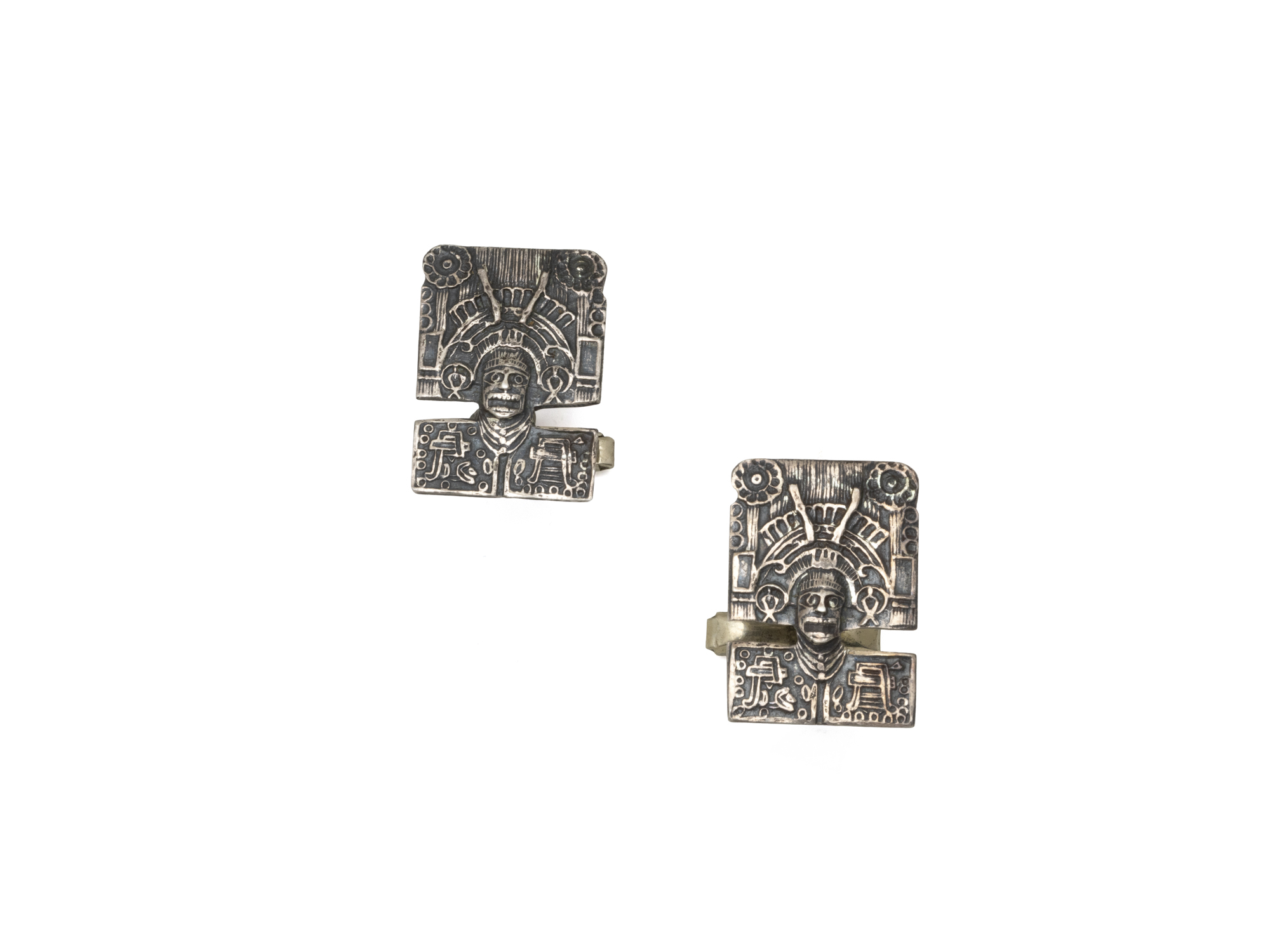 Lot n°47NV9053Paire de boutons de manchettes en argent 800 millièmes, ornés de pastilles rectangulaires à décor de masque aztèque. Travail mexicain. (usures)