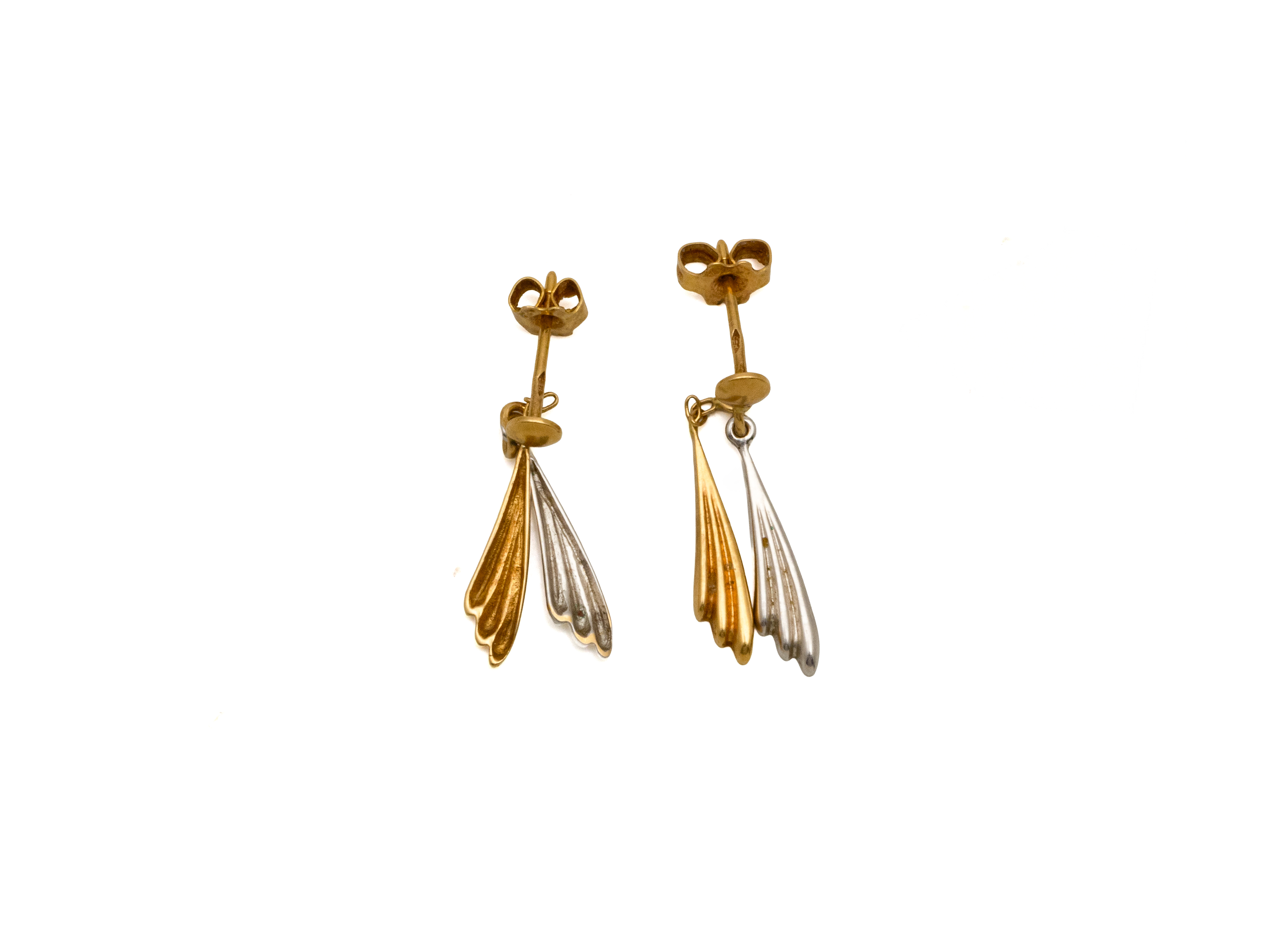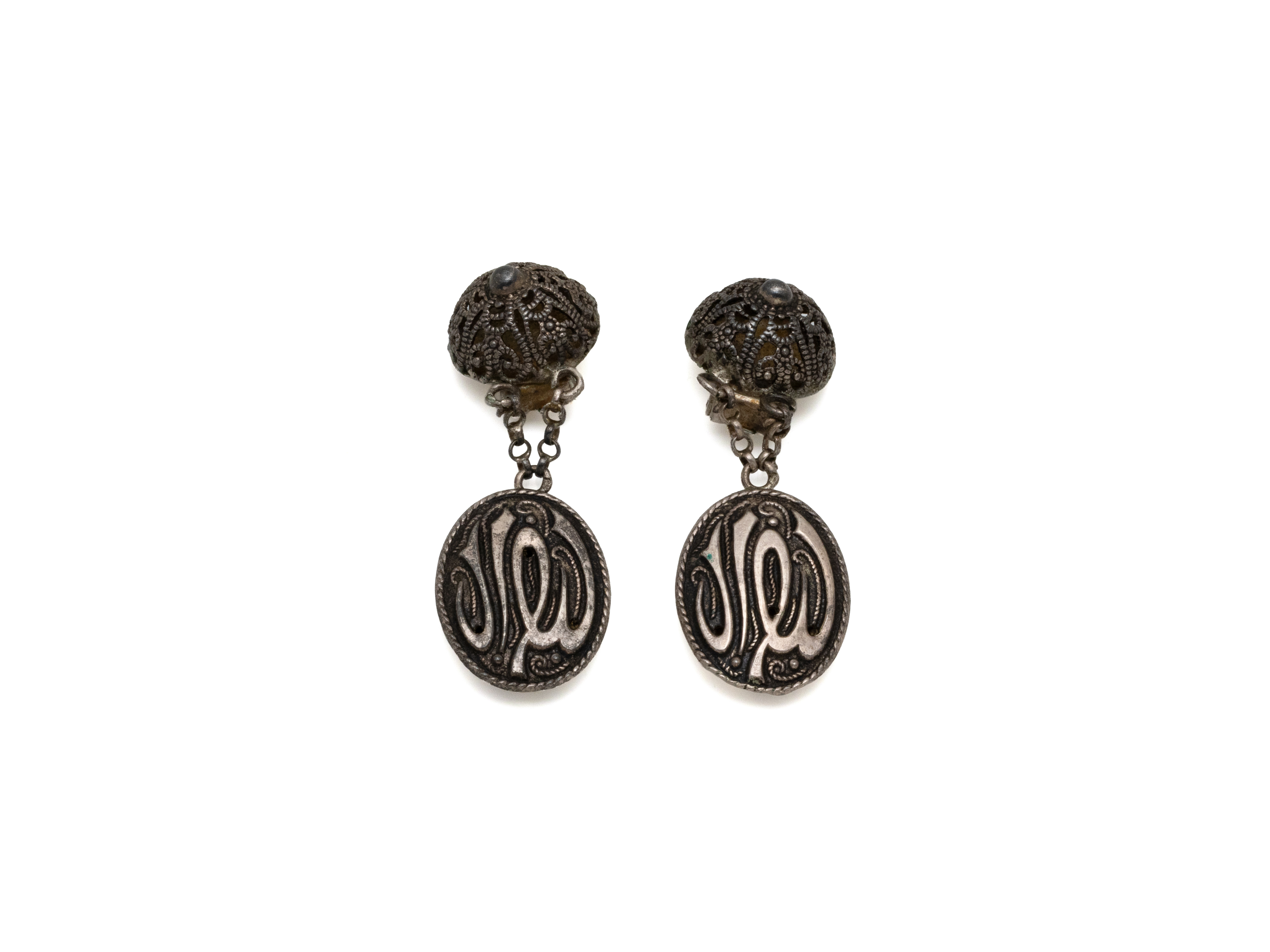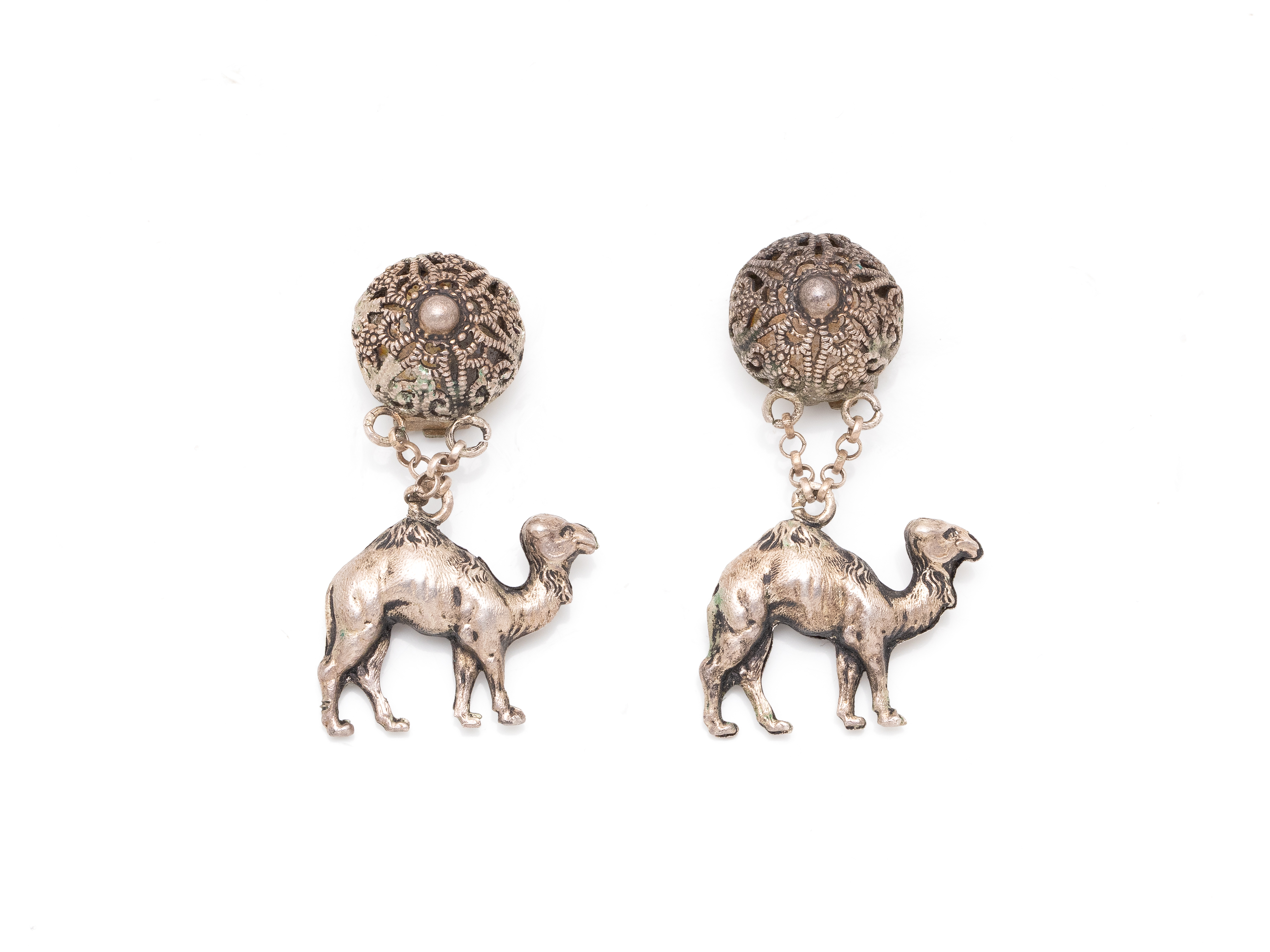 Lot n°64NV9096Amusante paire de boucles d'oreilles en argent 800 millièmes, ornées d'un dromadaire suspendu à un dôme filigrané. Travail français.