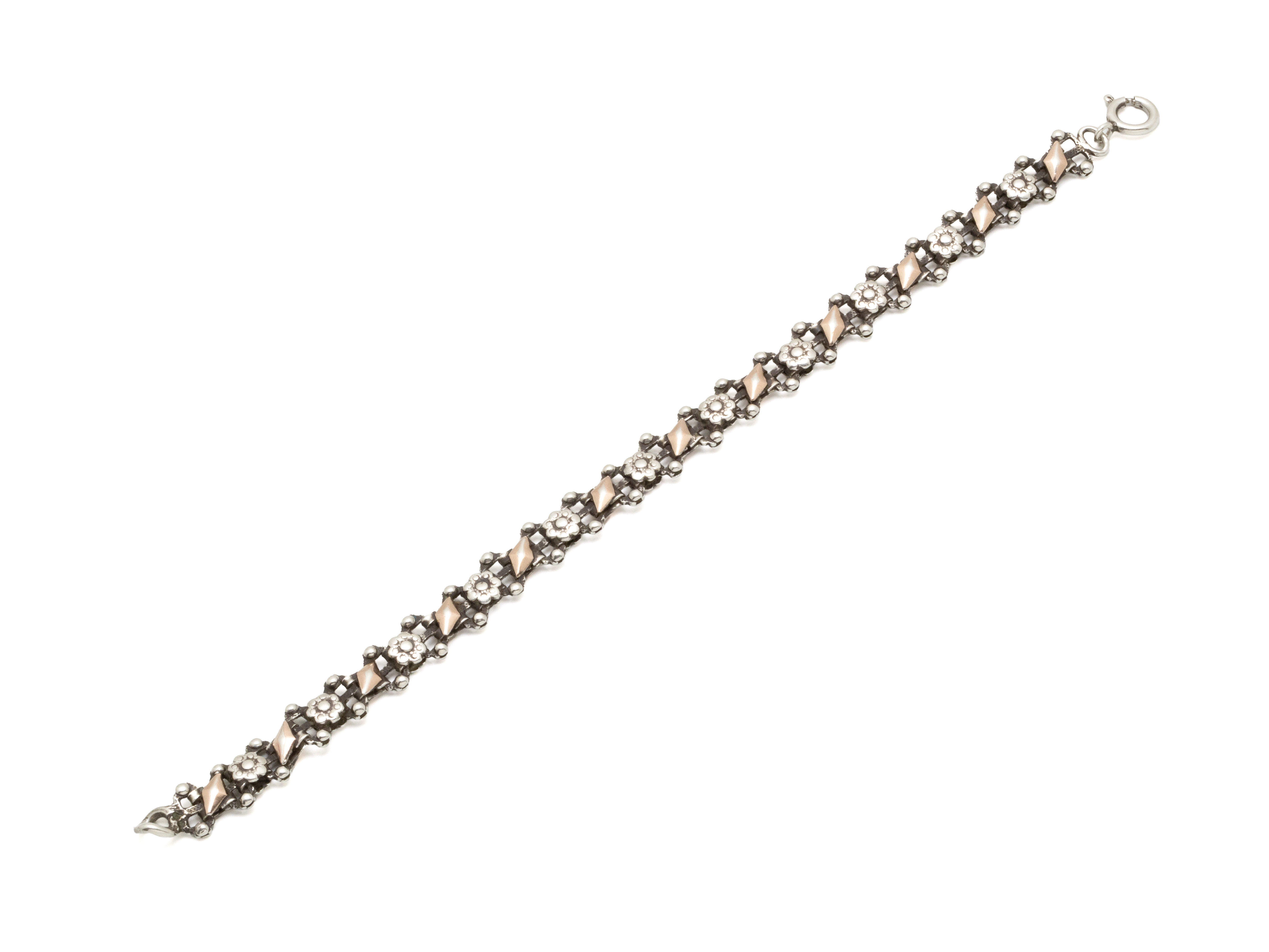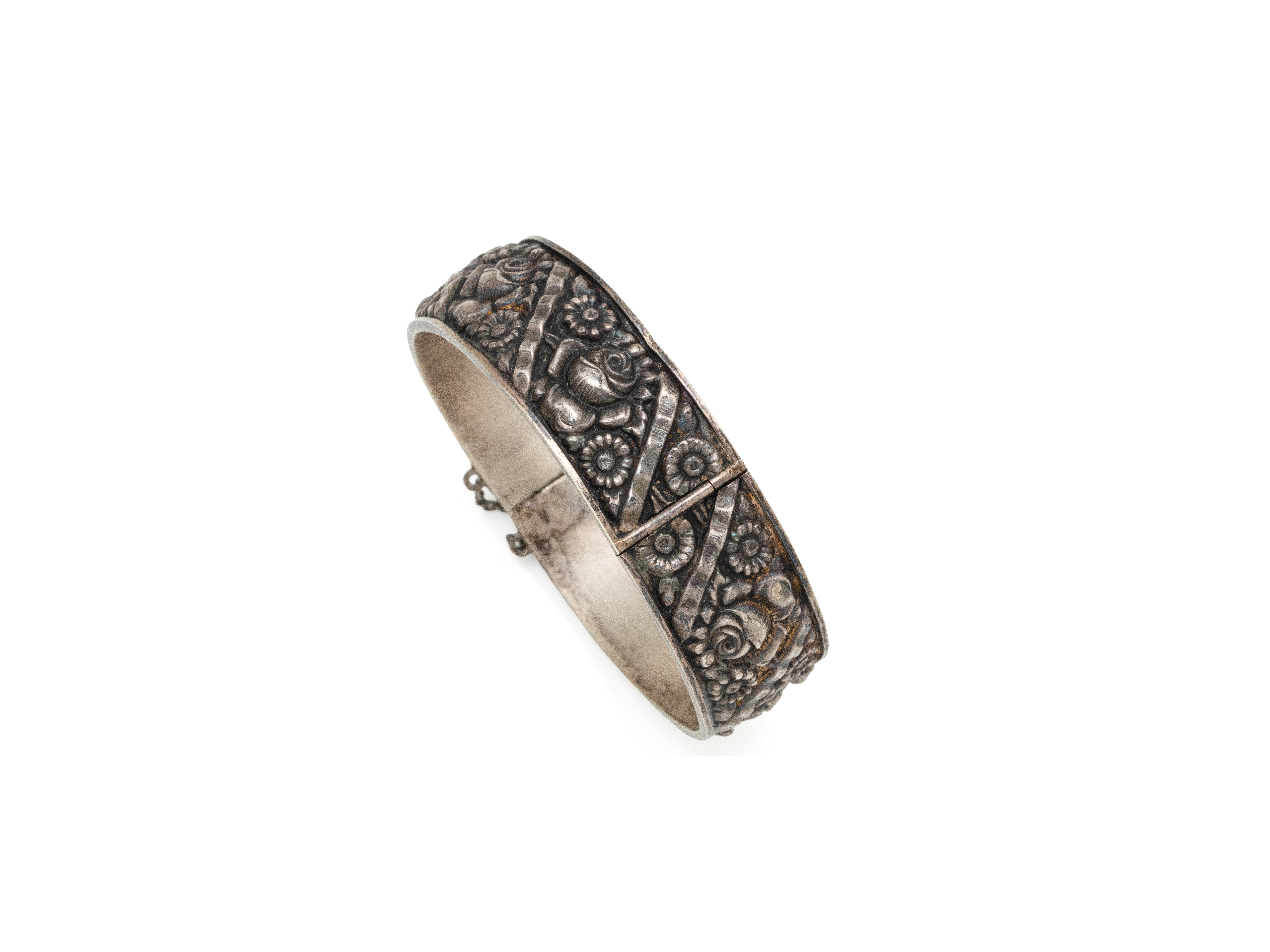 Lot n°58NV9058Bracelet articulé en argent 800 millièmes, les maillons décorés de boutons de fleur. Il est agrémenté d'un fermoir anneau ressort.