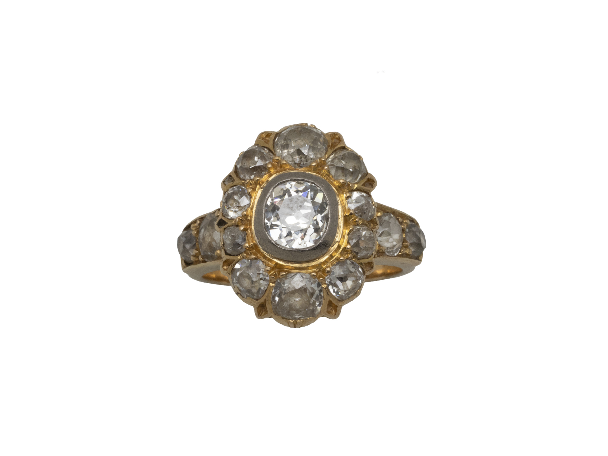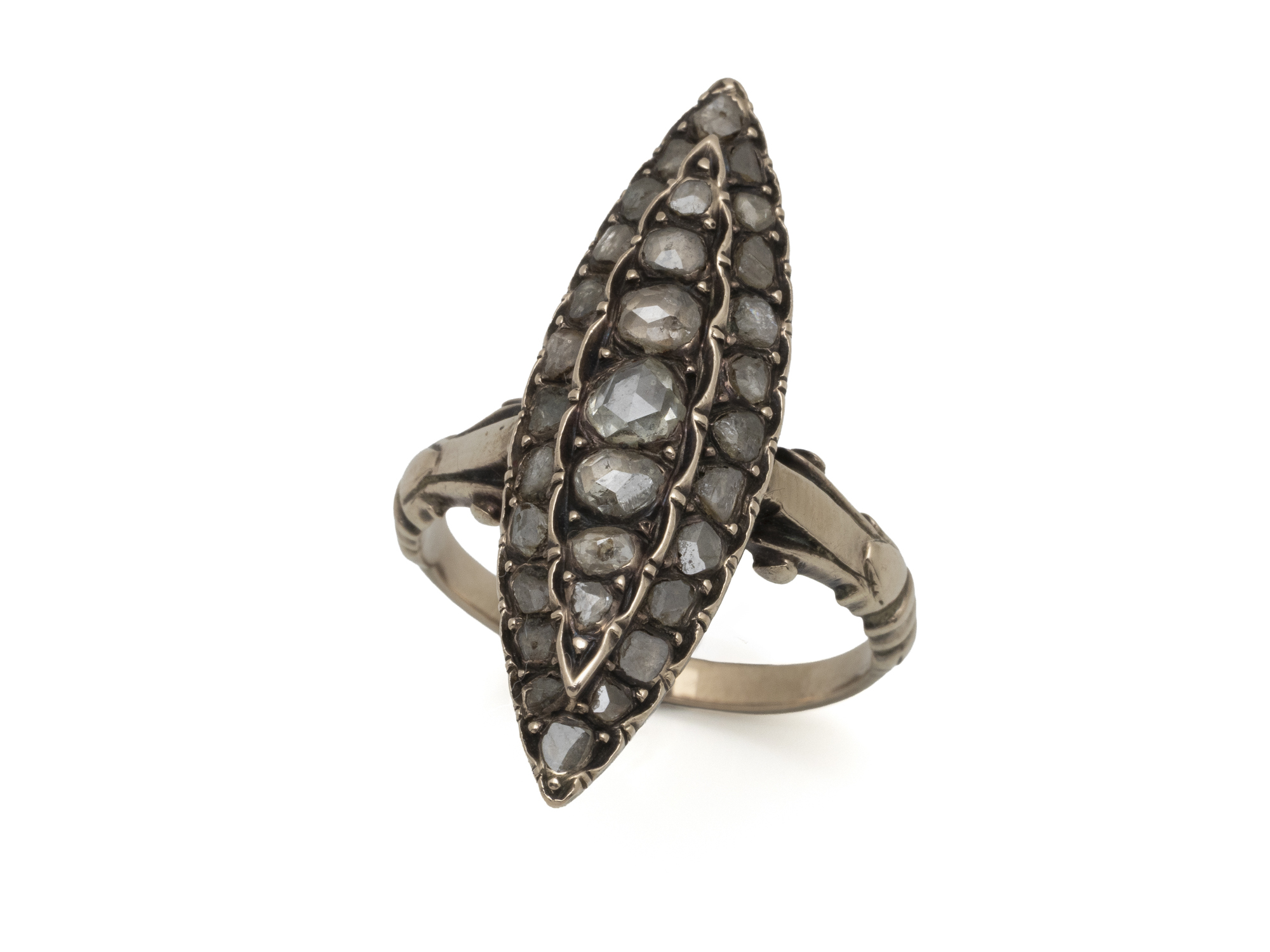 Lot n°38NV9210Bague marquise en cuivre vermeillé, habillée d'un pavage de roses couronnées et diamantées. L'épaulement à décor de palmettes. Travail de la fin du XIX° siècle. (trace de mise à taille)