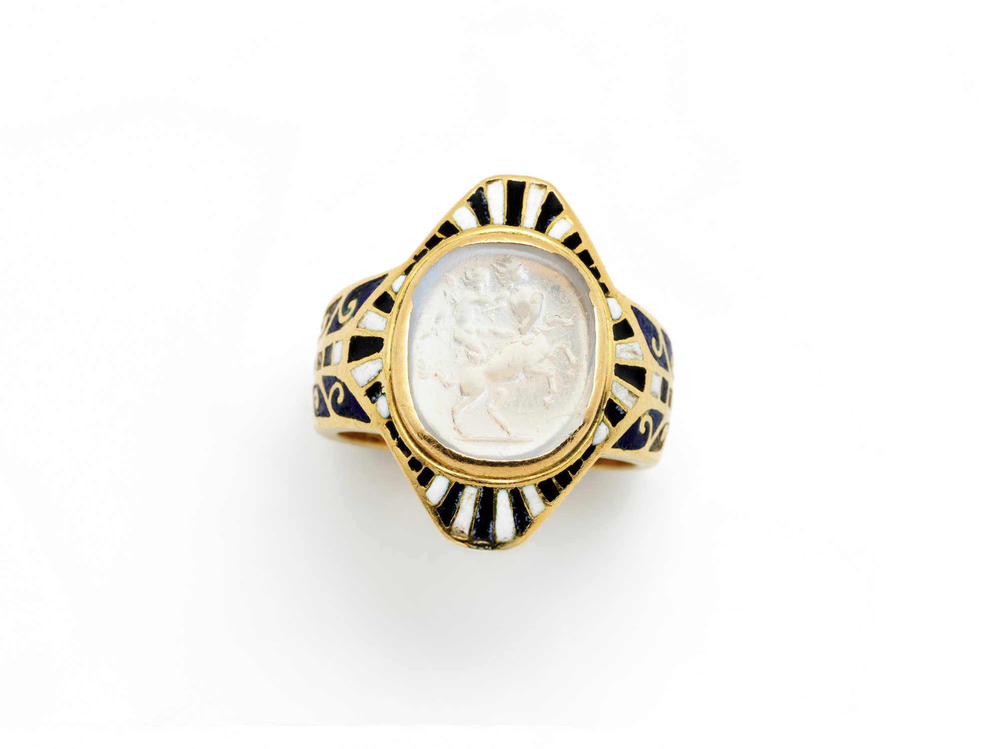 Lot n°32NV9061Belle bague en or 750 millièmes, le plateau losangique orné d'une intaille sur pierre de lune figurant un Centaure chevauché par l'amour dans un entourage rayonnant habillé d'émail noir et blanc. Corps de bague à décor de volutes, rehaussé d'émail bleu. Travail français de la fin du XIX° siècle. (manques à l'émail, égrisures)