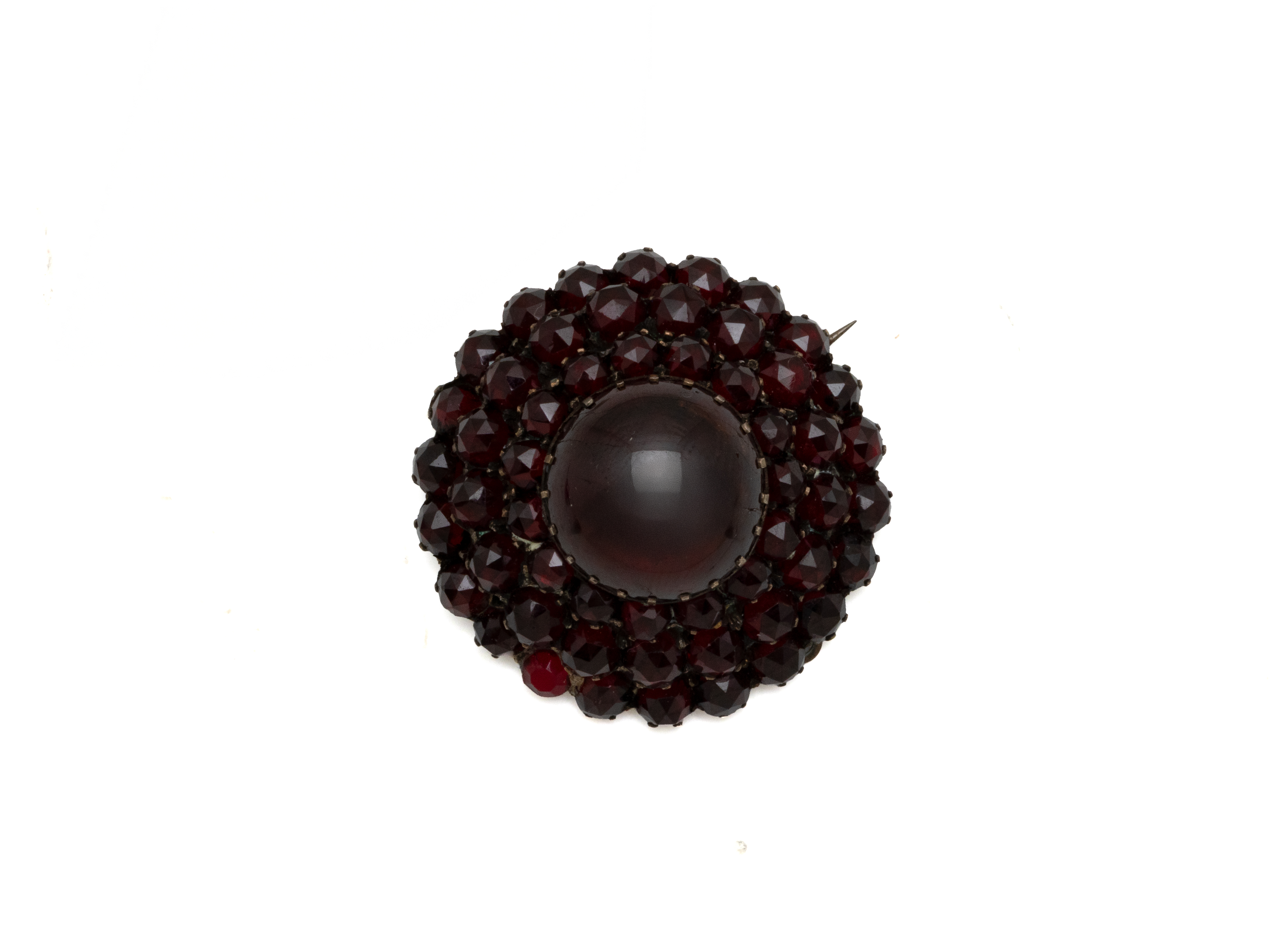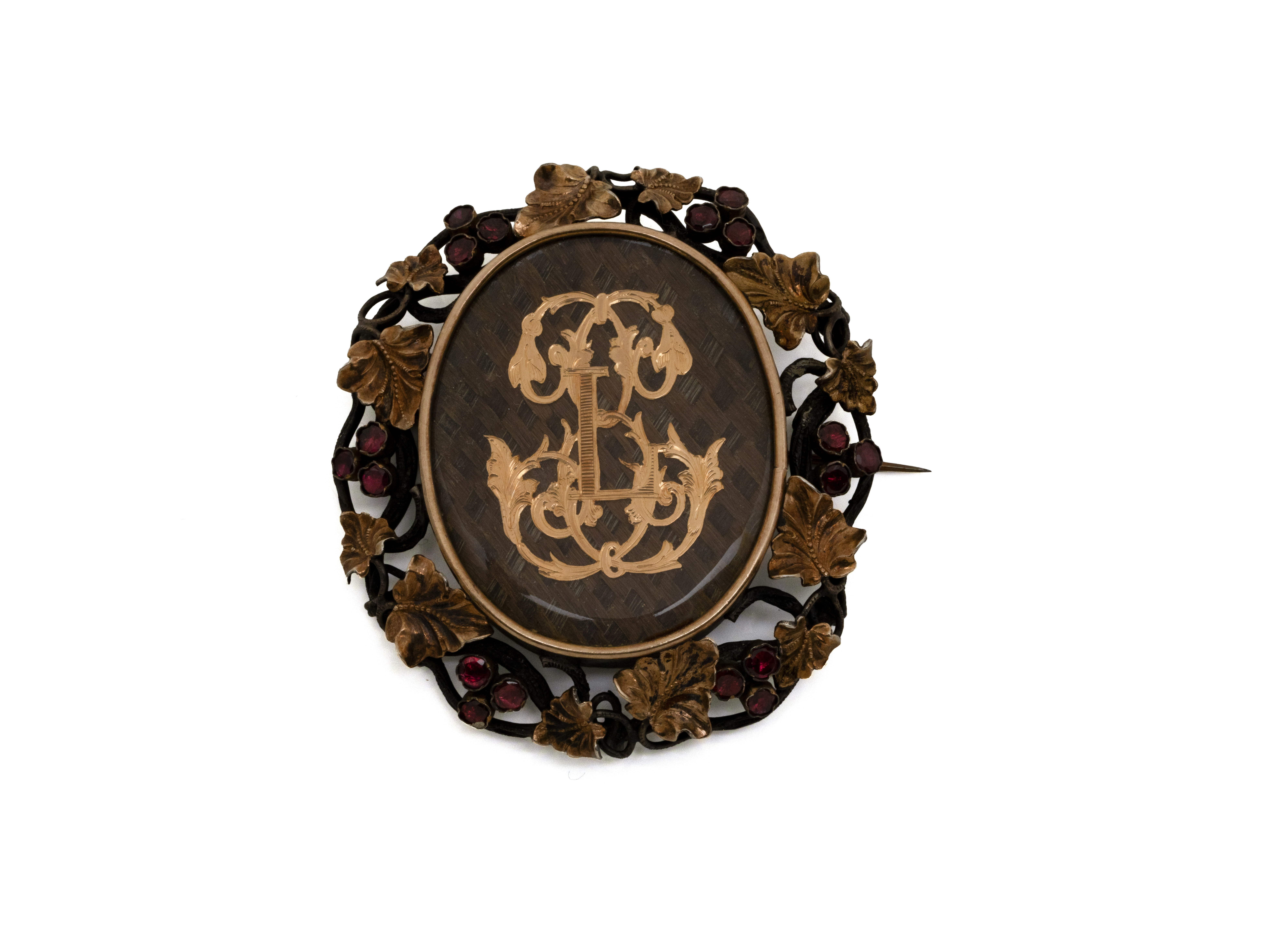 Lot n°27NV9187Belle broche devant de corsage en argent 800 millièmes partiellement vermeillé centrée d'un médaillon décoré d'une tresse de cheveux appliquée d'un monogramme. Dos nacré, l'épingle en métal. La monture à décor floral ponctuée de grenat ronds facettés. Travail français de la seconde moitié du XIX° siècle.