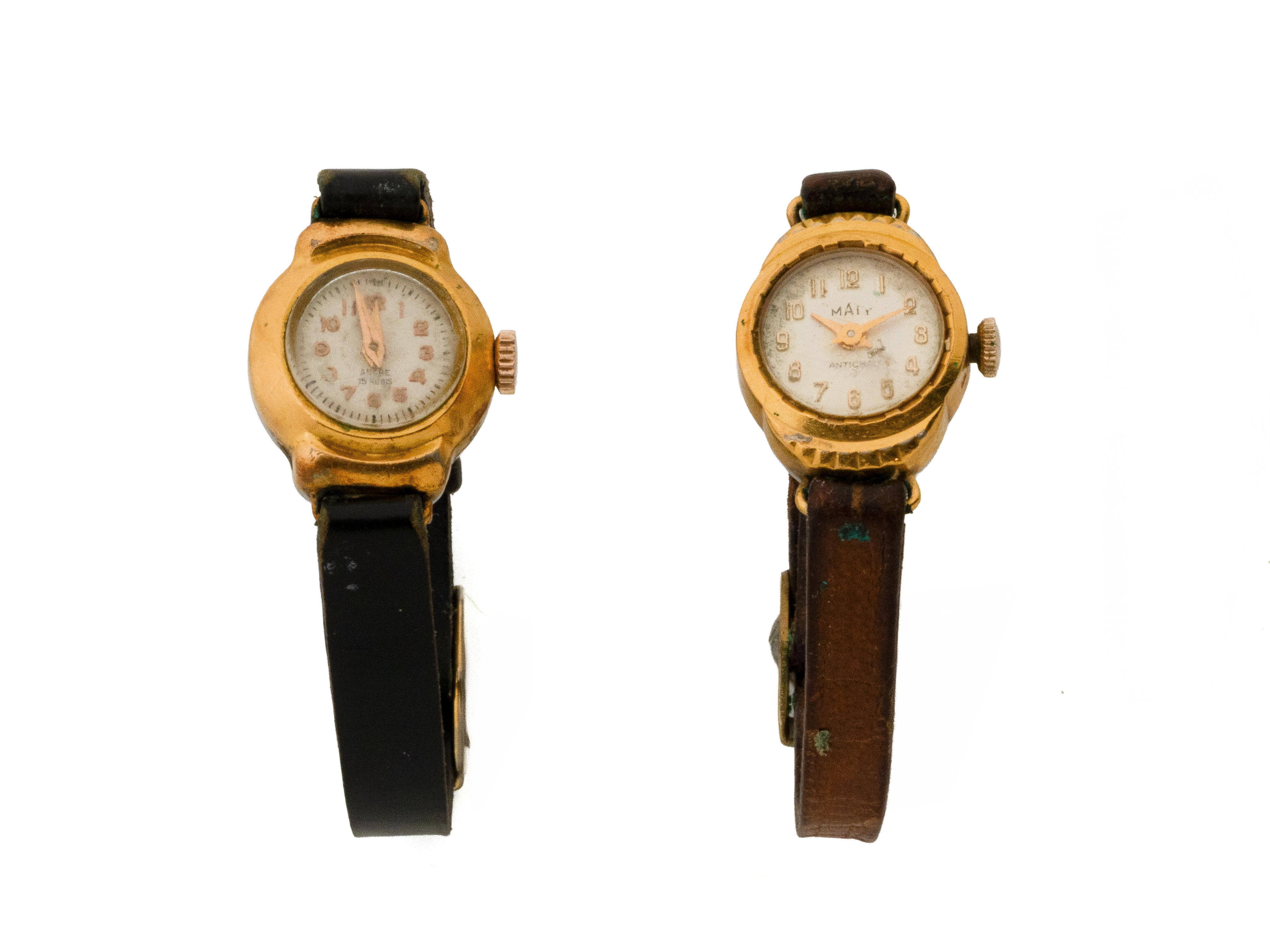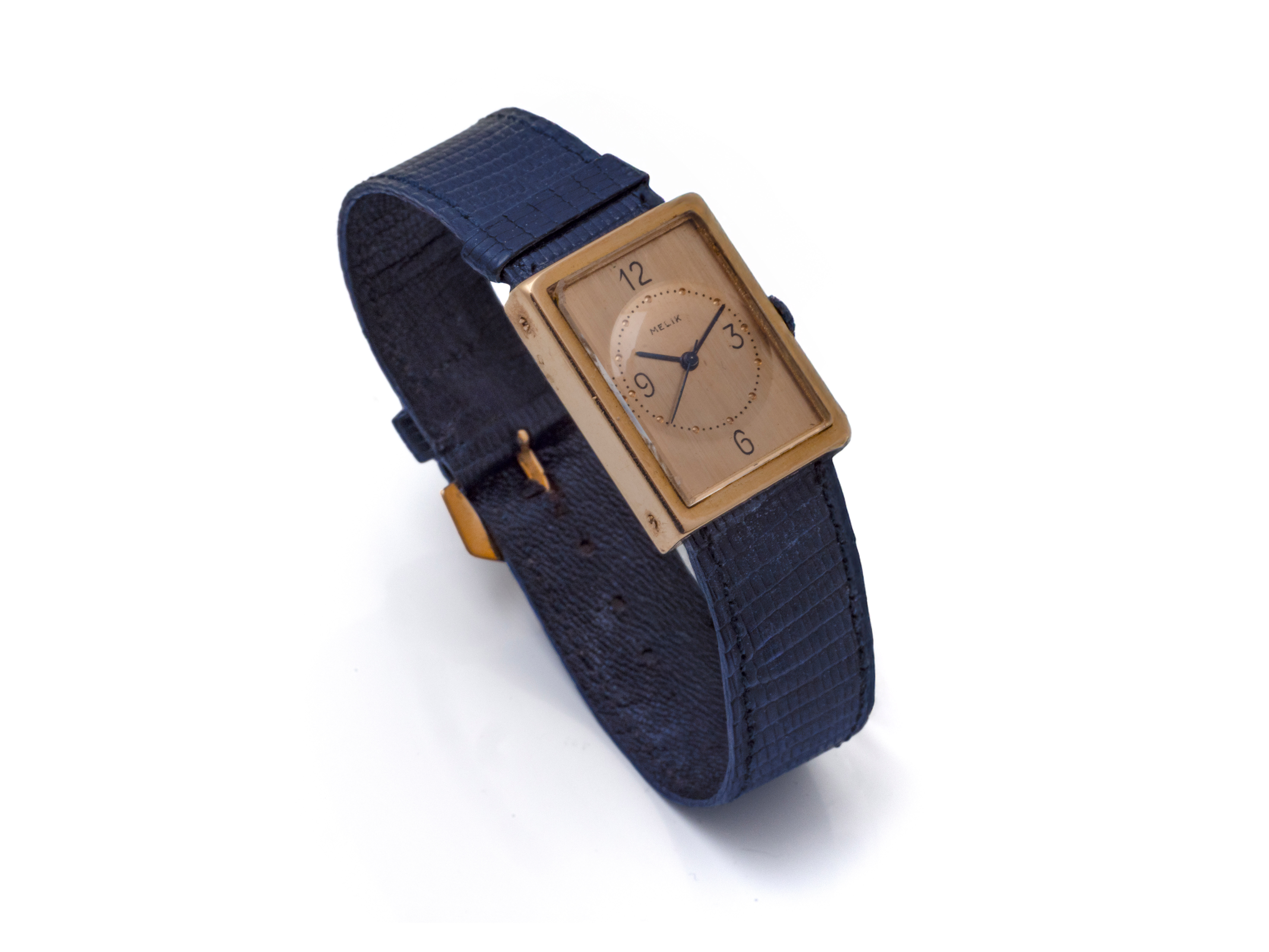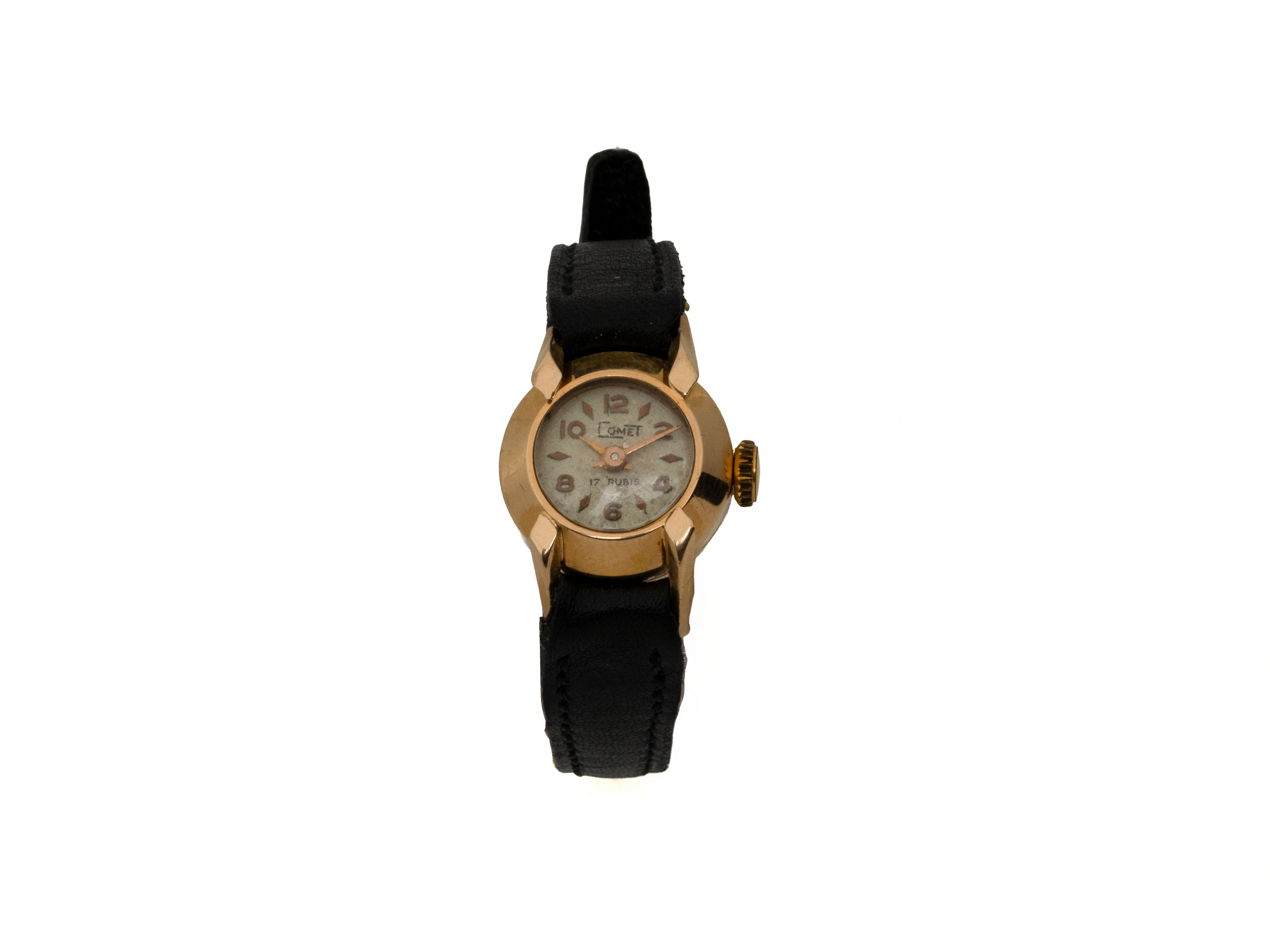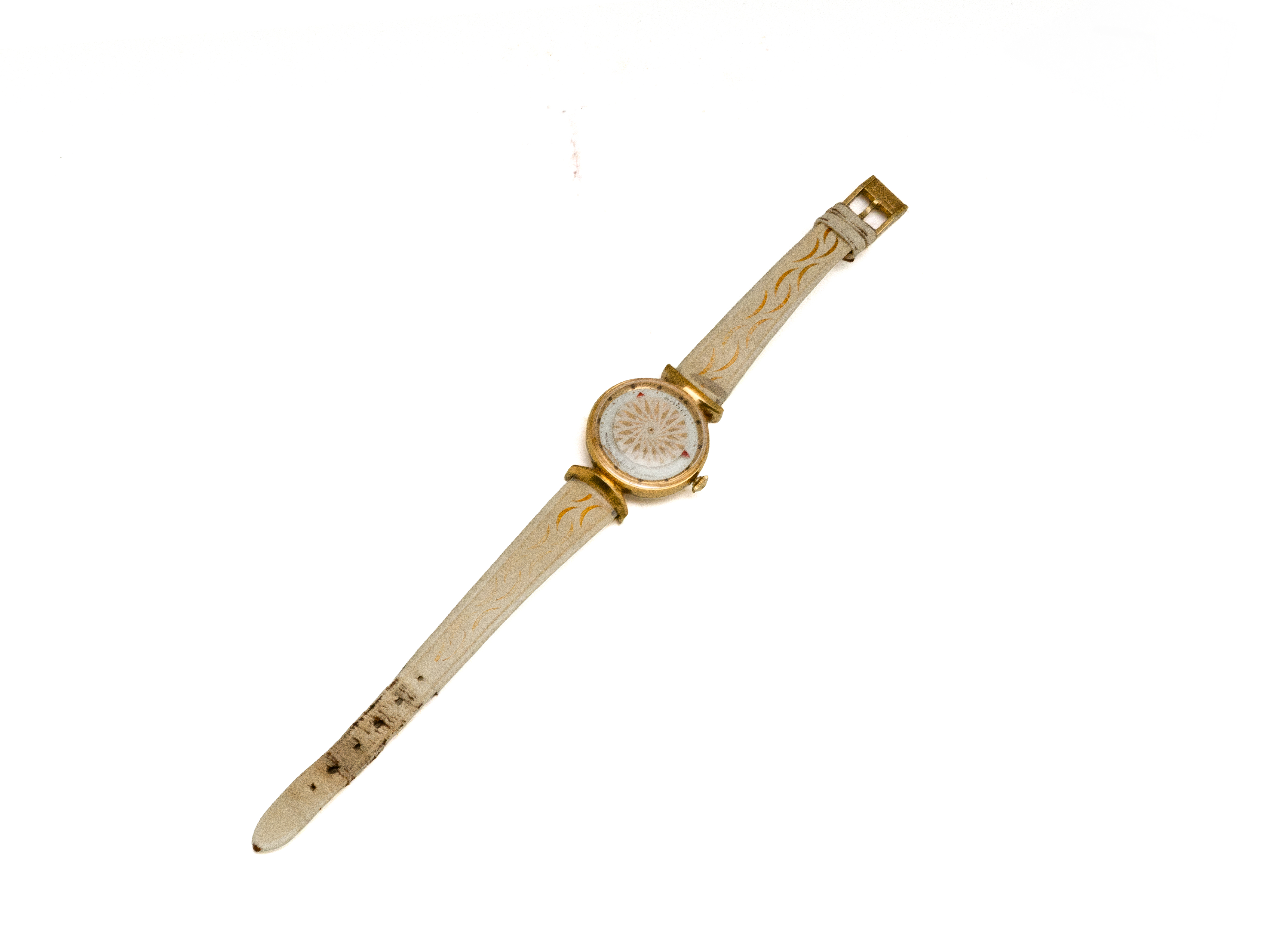 Lot n°205NV9025Montre bracelet de dame en or 750 millièmes, cadran argenté rayonnant avec chiffres arabes peints. Mouvement mécanique. Bracelet cuir usagé avec boucle ardillon en métal. Cadran signé Herma. Travail français vers 1940/50. (en l'état)