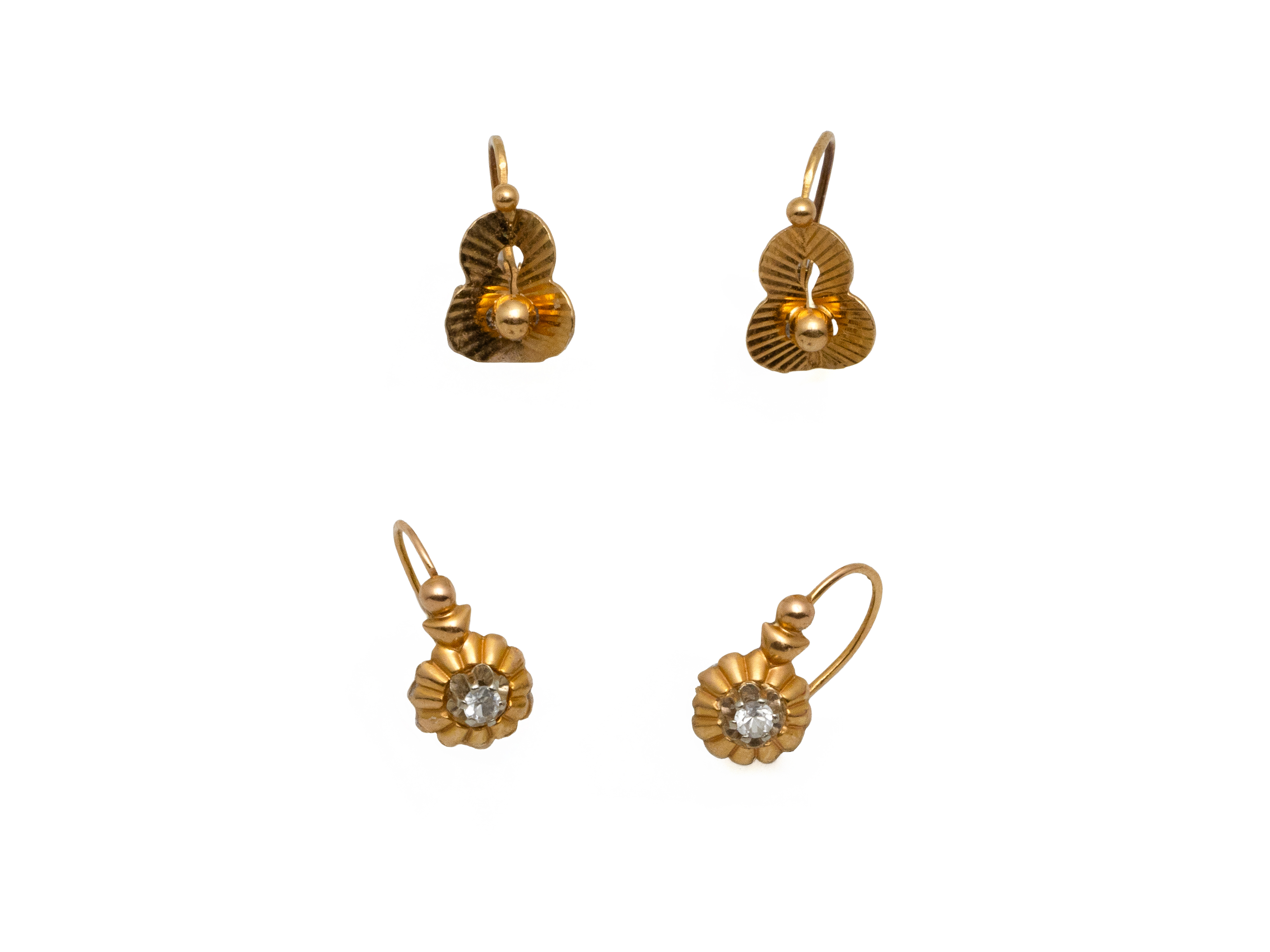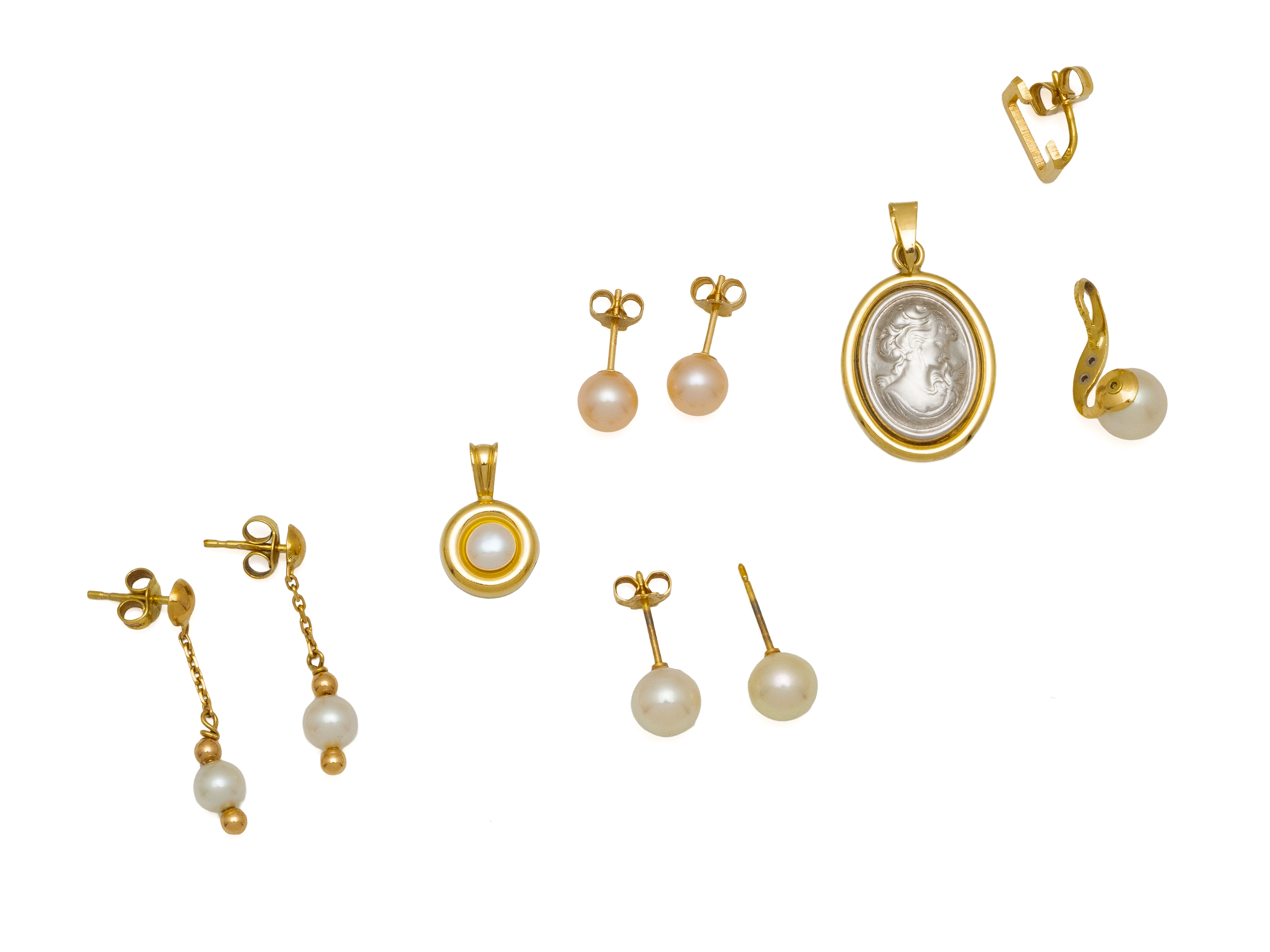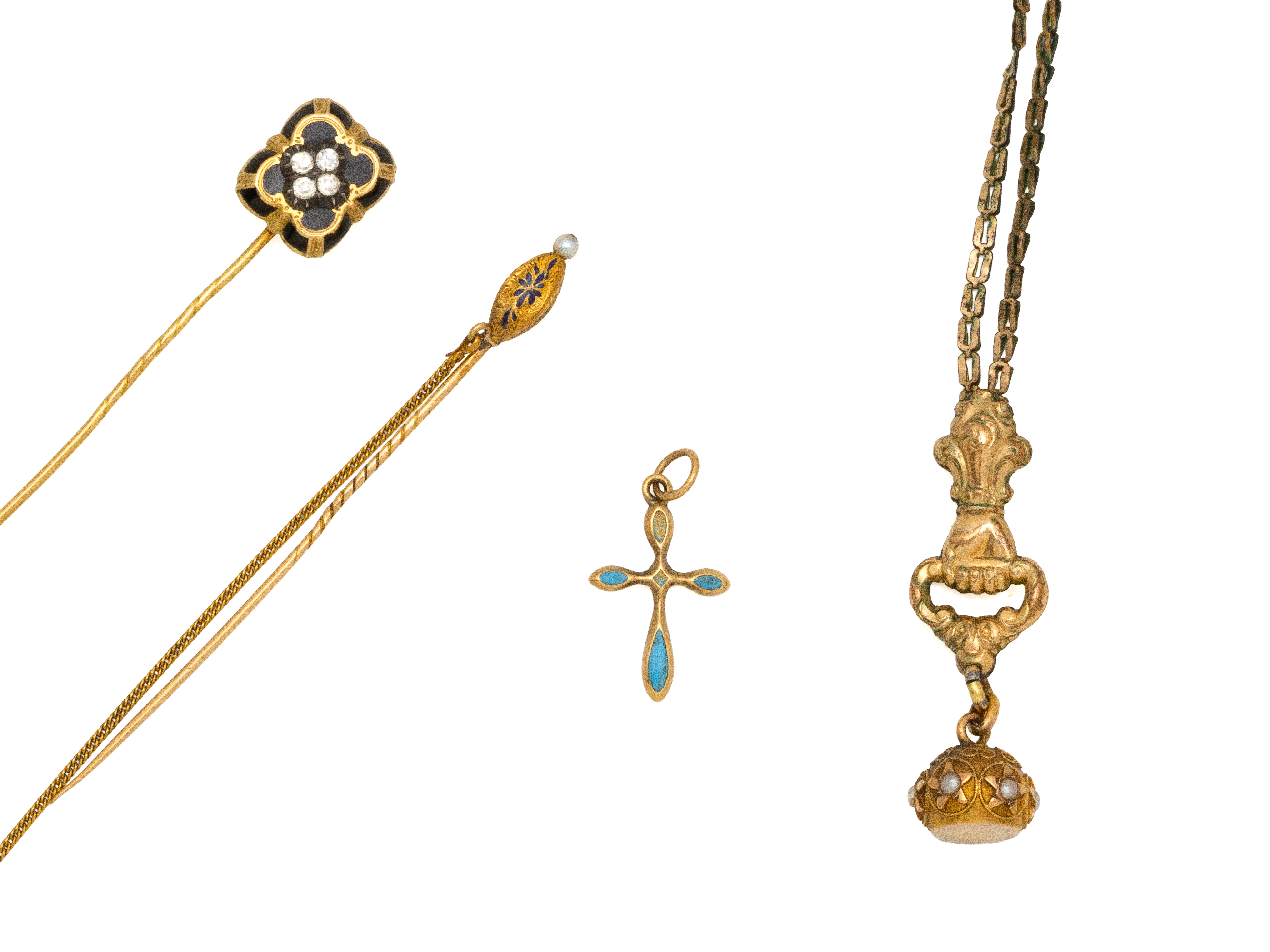 Lot n°30NV9070Lot en or 750 millièmes émail, pierres blanches et perles, composé de 2 épingles et 2 pendentifs retenant une petite croix émaillée. Travail français de la fin du XIX°siècle.