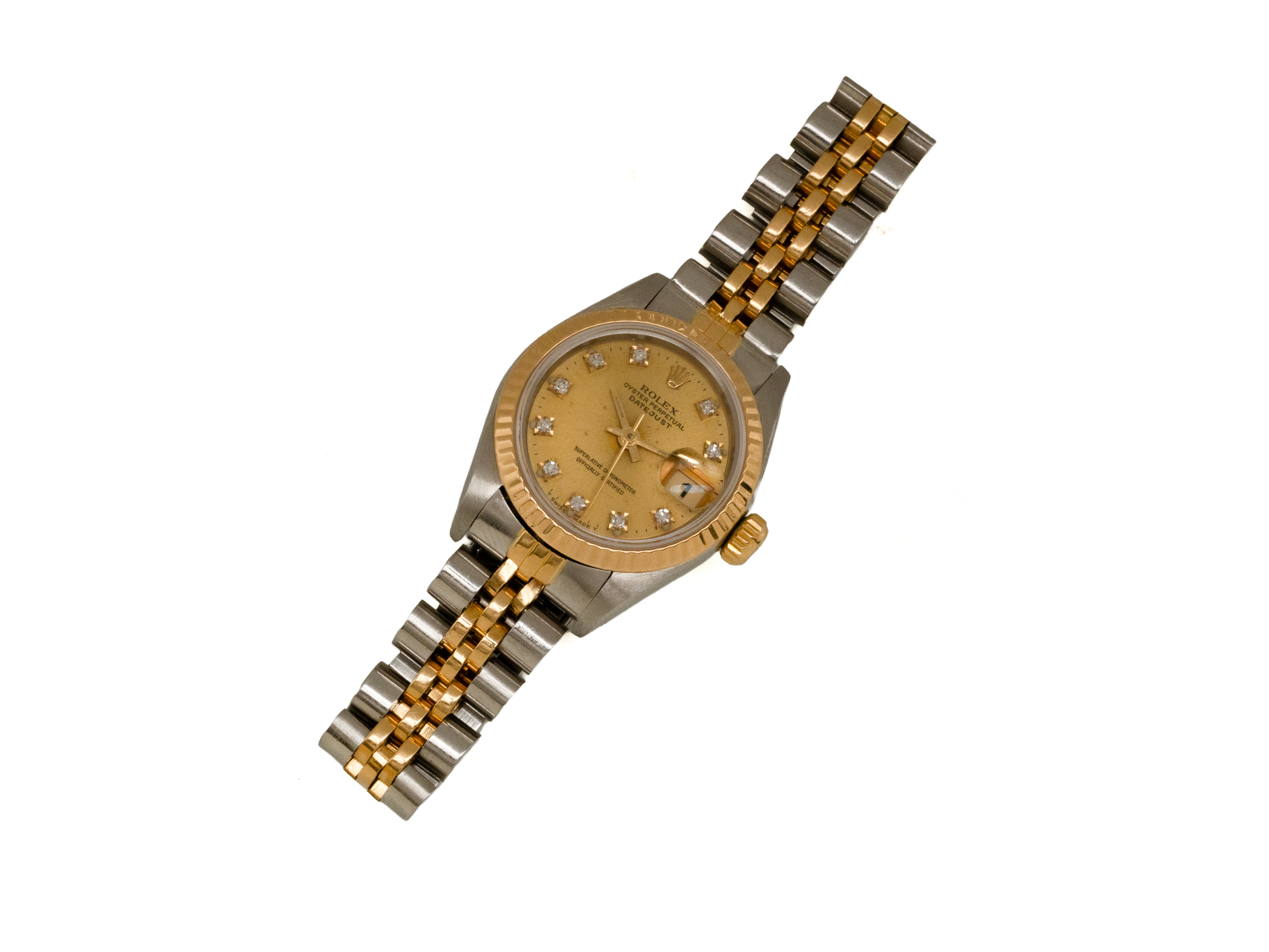 Montre bracelet de dame en or 750 millièmes et acier, cadran doré rayonnant légèrement taché avec index diamantés, affichage de la date par guichet à 3 heures avec loupe, lunette crantée en or. Mouvement automatique signé, numéroté 24035932. Bracelet en or 750 millièmes et acier, maillons jubilé détendus avec boucle déployante réglable en acier, signée. Vers 1990. Elle est accompagnée d'un étui de service de la maison ROLEX.