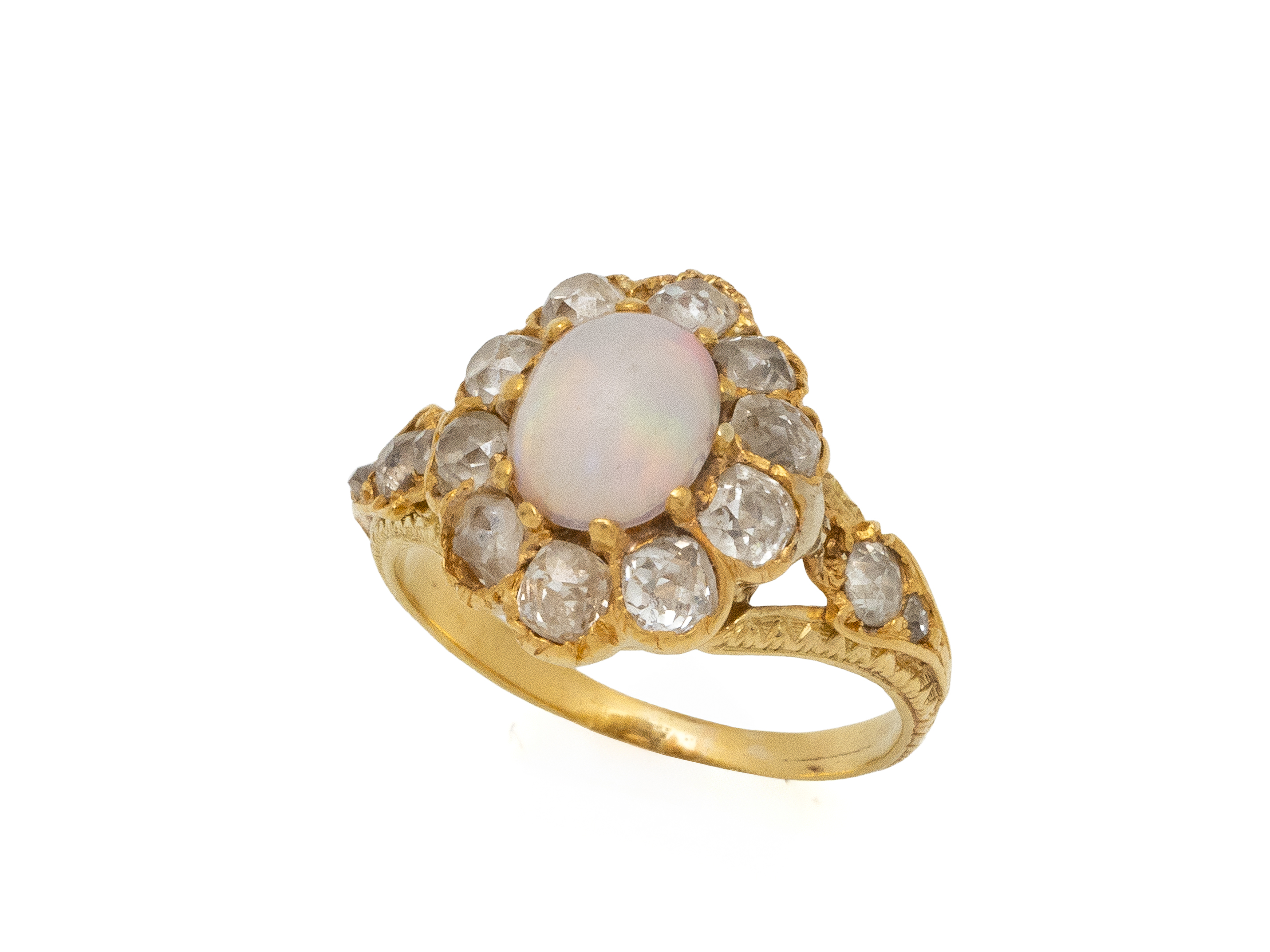 Lot n°45NV9072Délicate bague en or 750 millièmes, ornée d'un cabochon d'opale dépoli en serti griffe, entouré et épaulé de diamants taille ancienne. La monture finement ciselée de frises. Travail français de la fin du XIX° siècle. (petit manque et légère restauration à l'épaulement)