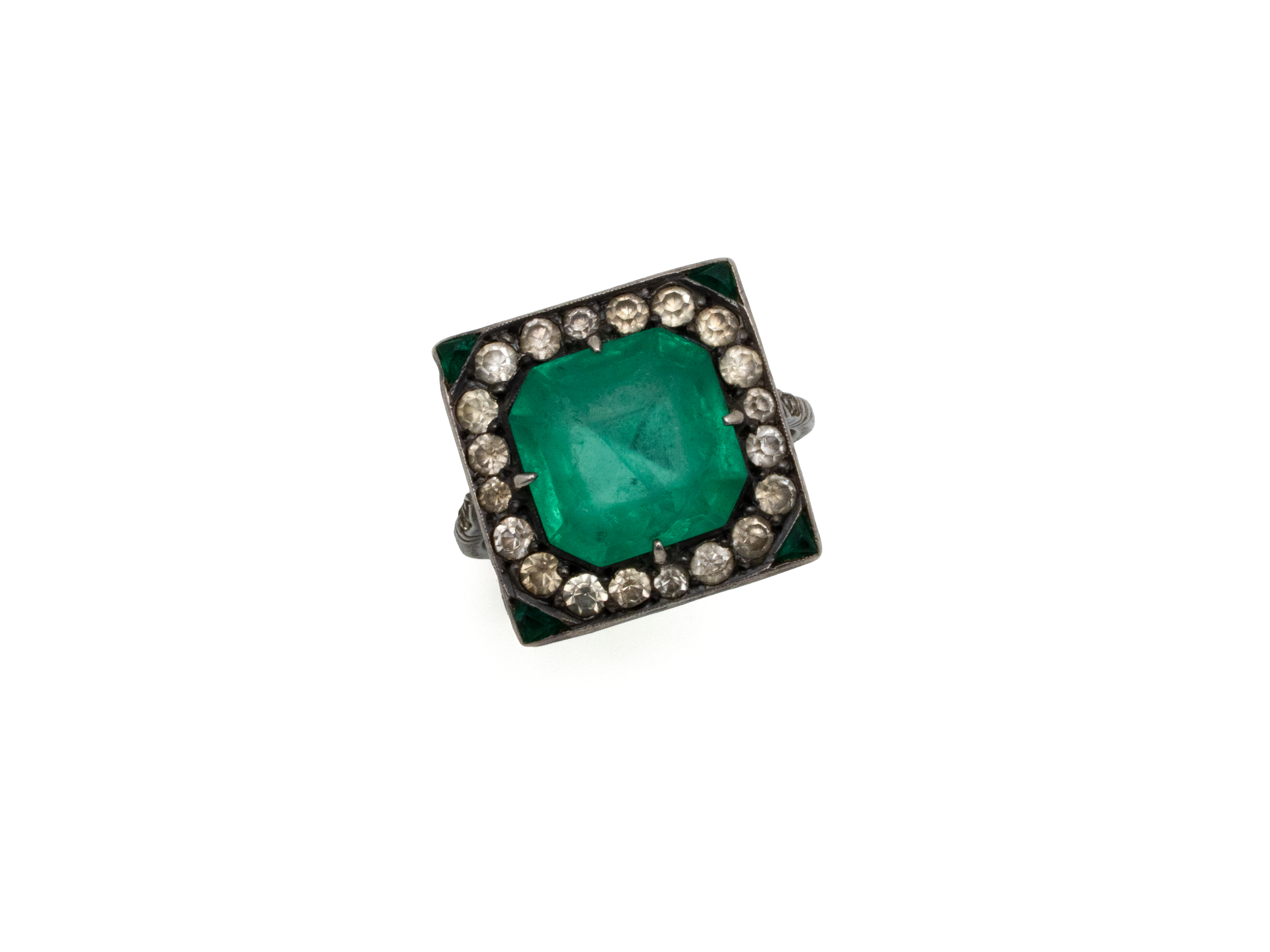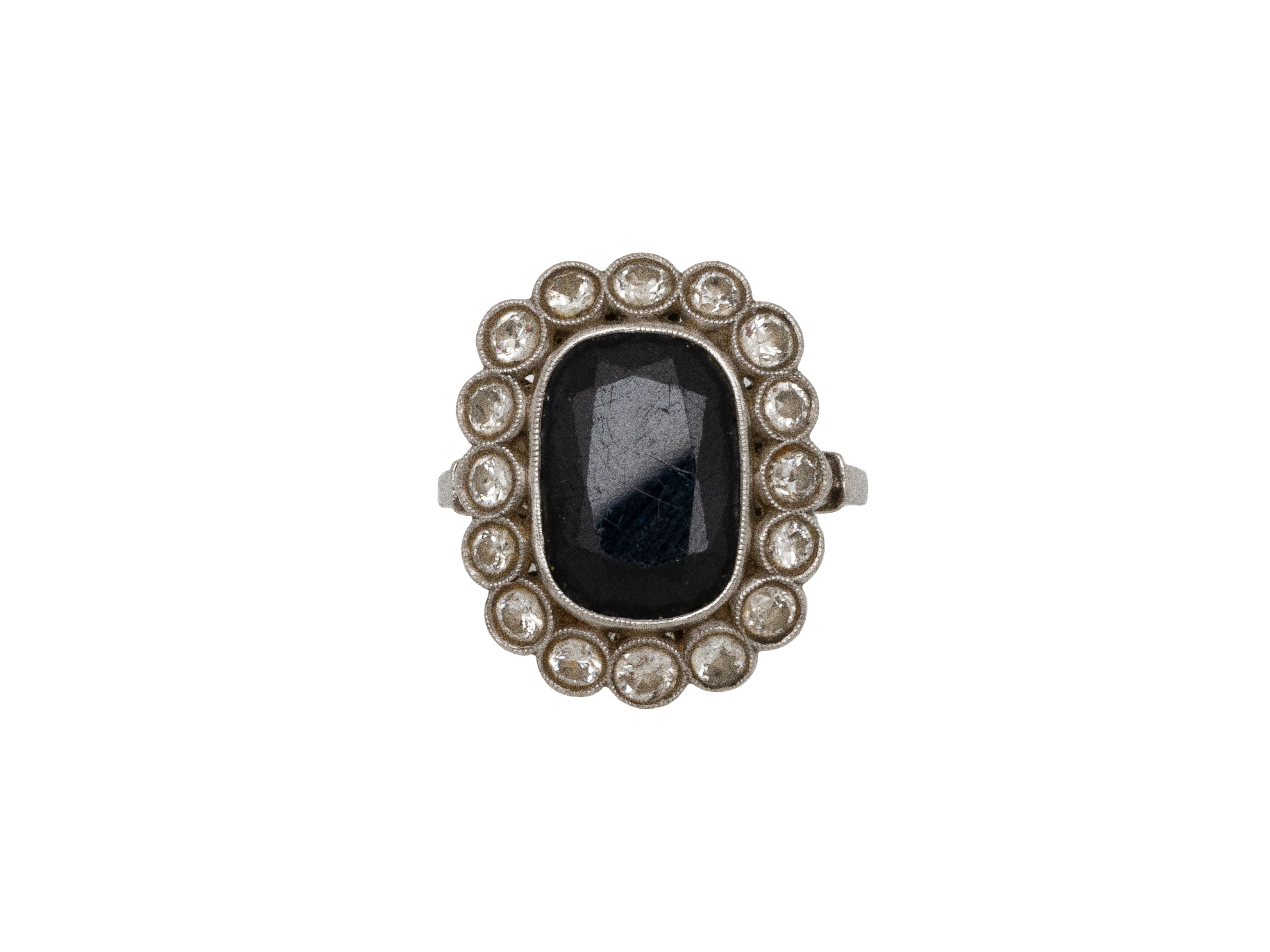 Lot n°239NV9082Bague en or gris 750 et platine 850 millièmes, ornée d'un saphir taille coussin rectangle en serti clos perlé dans un entourage festonné rehaussé de diamants taille ancienne. Panier repercé d'une frise. Vers 1920/30.