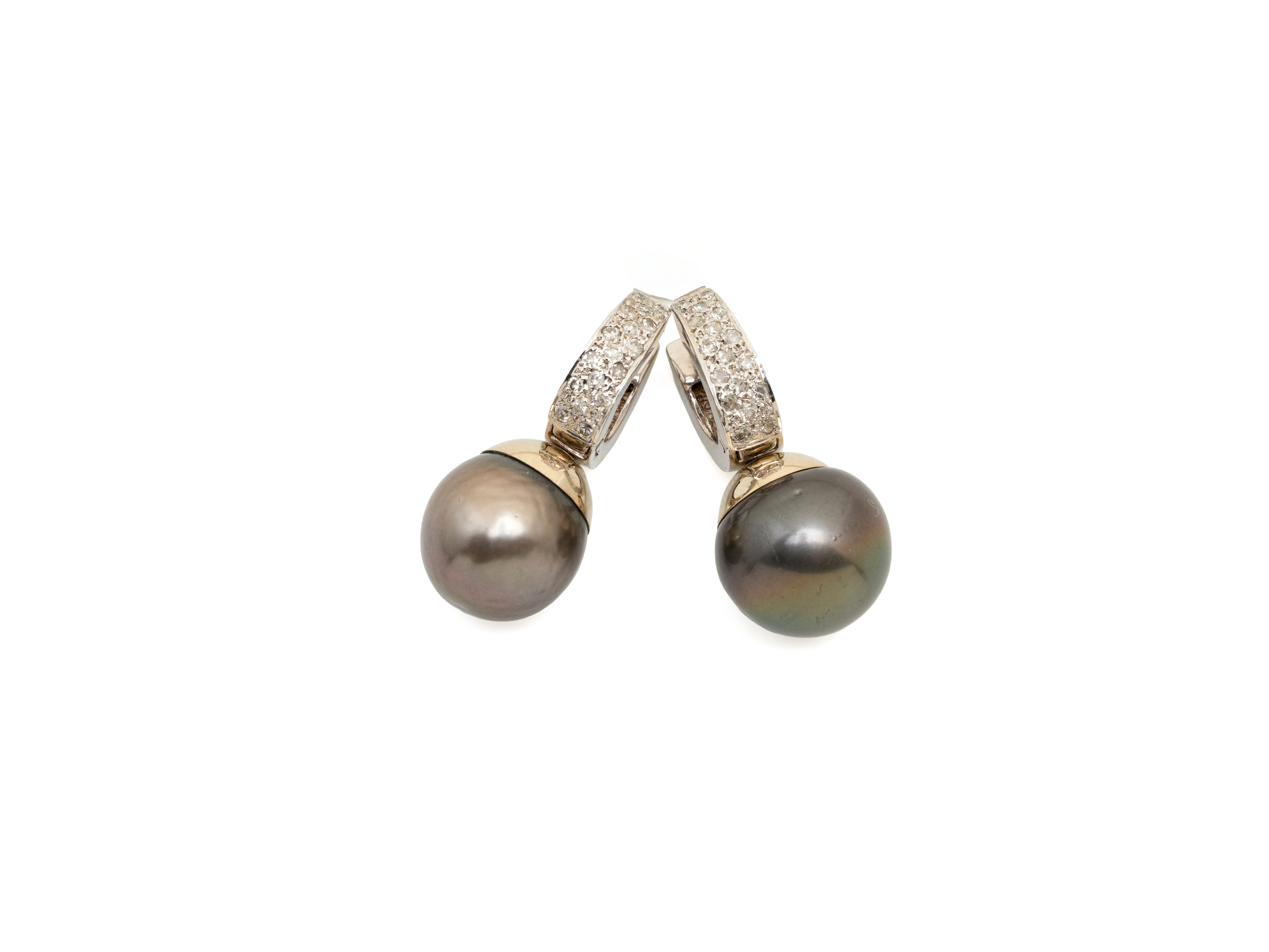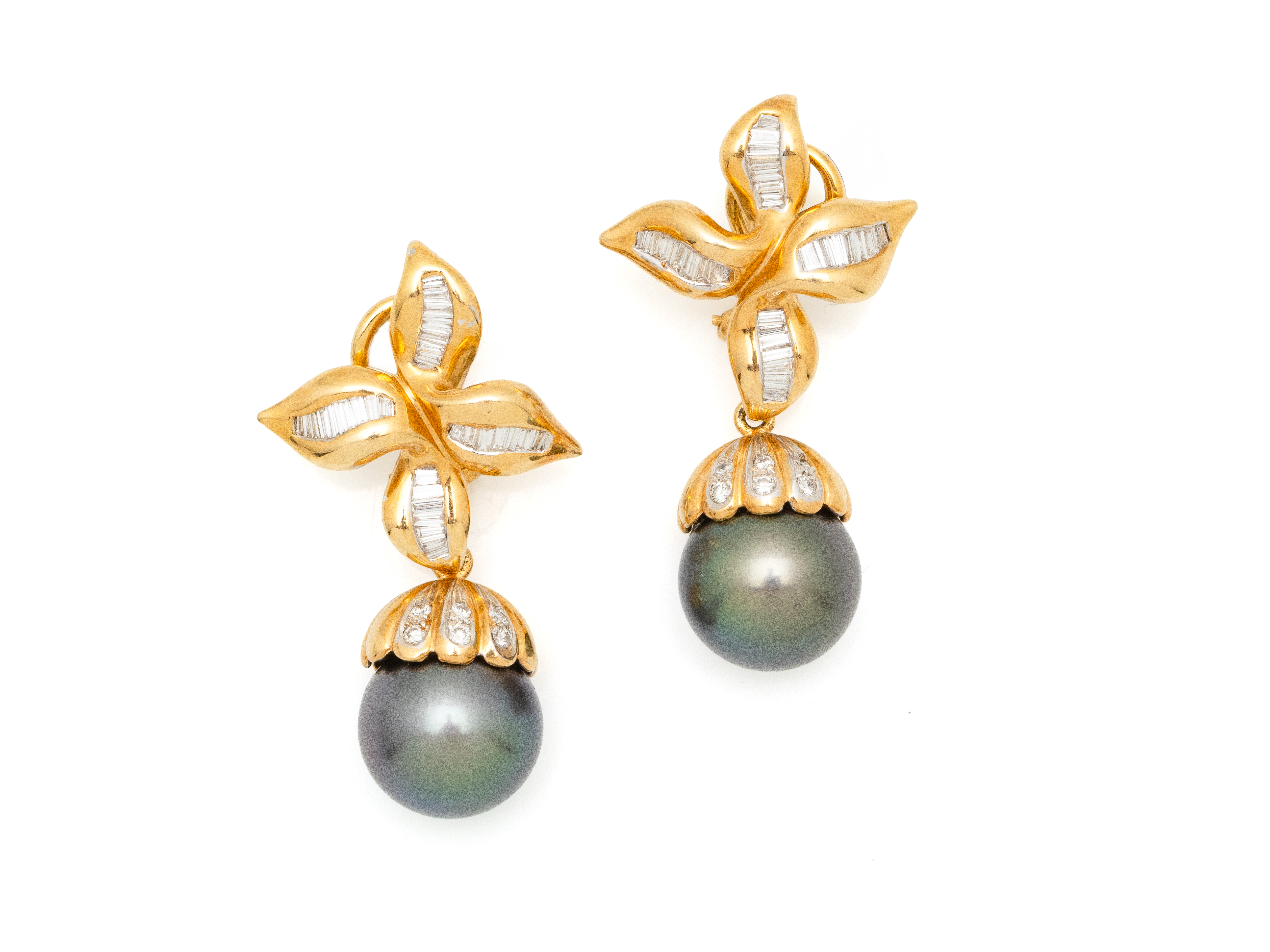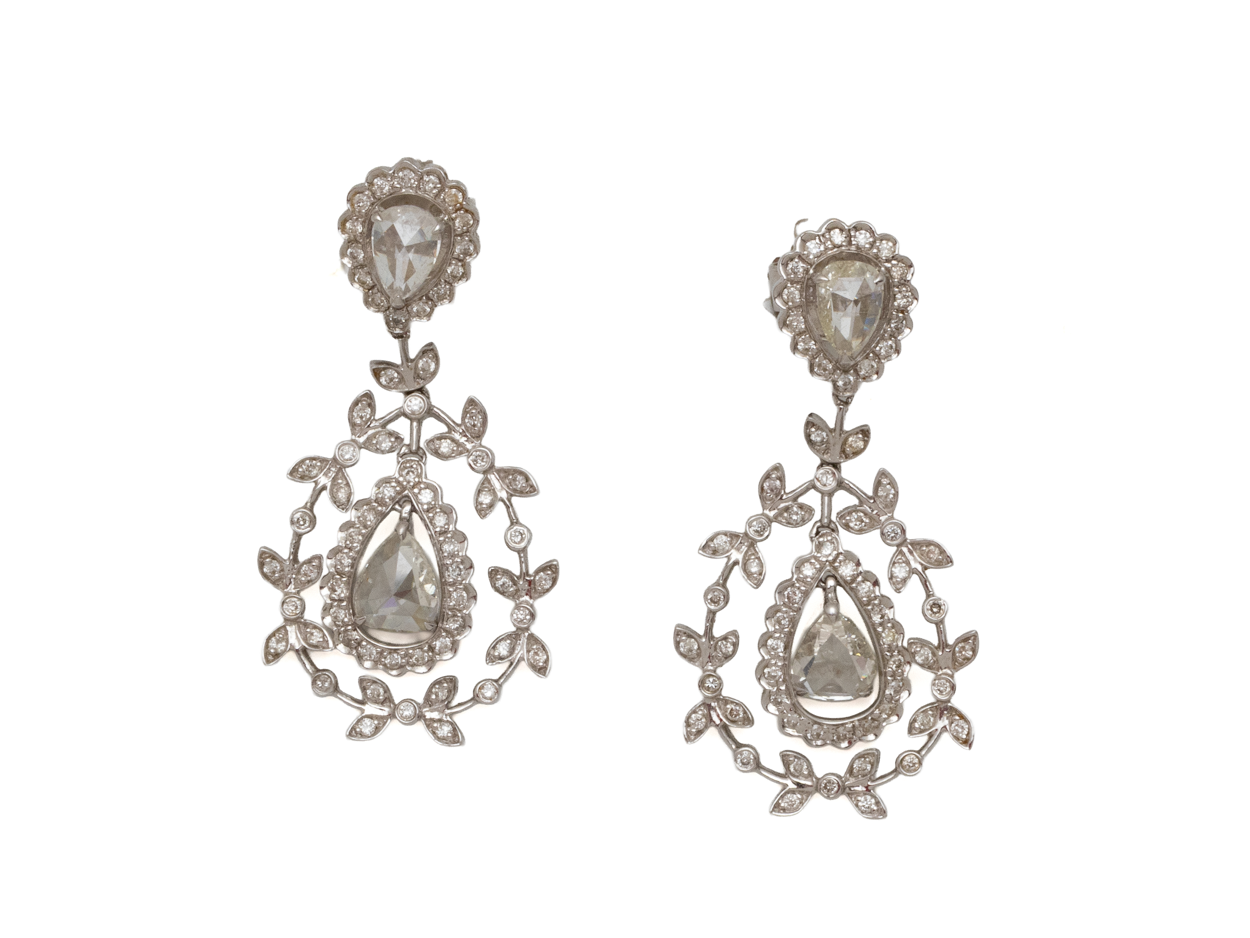 Lot n°243NV9087Délicate et élégante paire de boucles d'oreilles en or gris 750 millièmes, retenant un motif piriforme monté en pampille, habillées de roses couronnées taillées en poire en serti griffe, la monture à décor floral ponctuée de petits diamants brillantés.