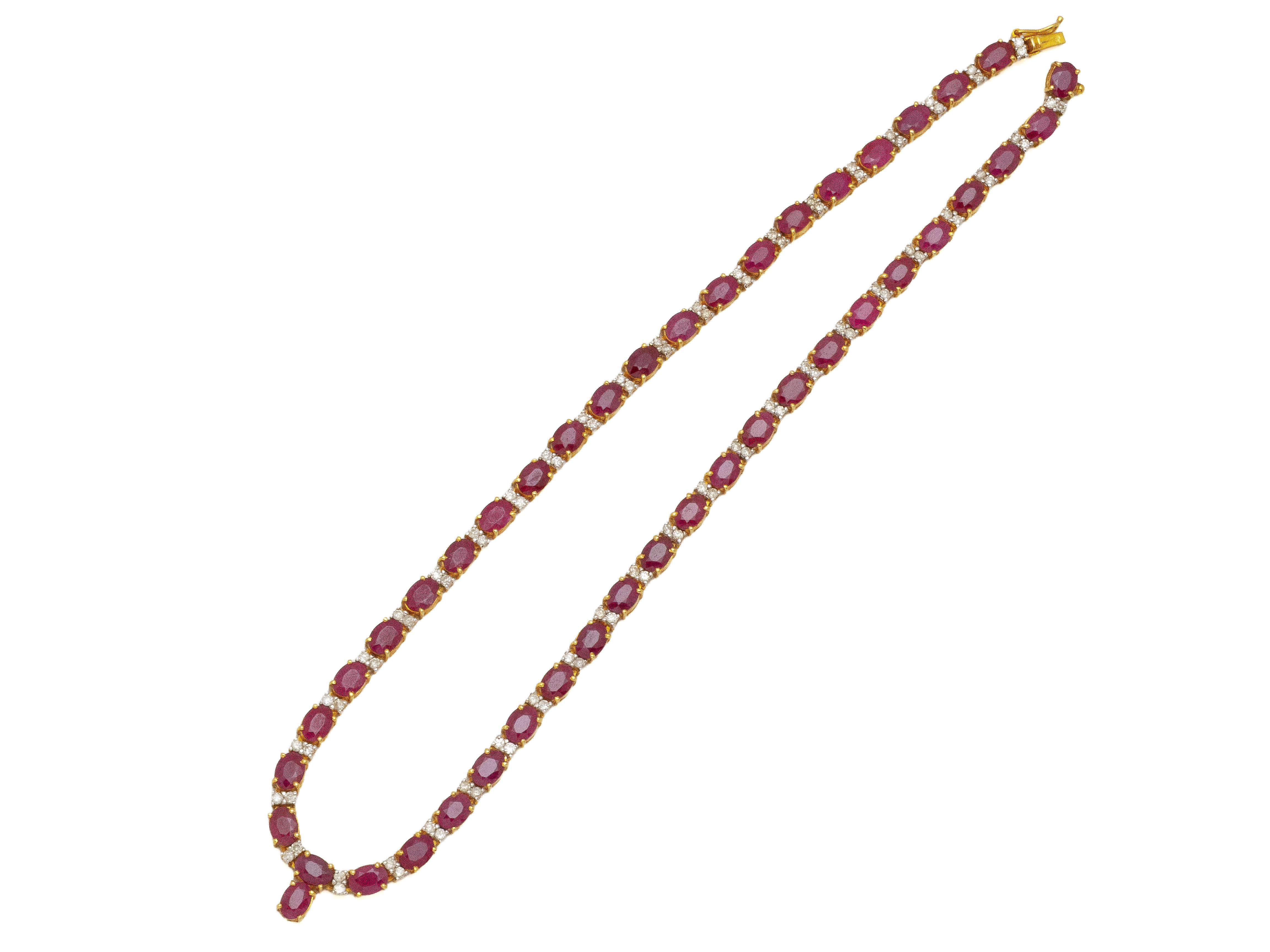 Lot n°244NV9088Collier articulé en or 585 millièmes, composé d'une ligne de rubis ovales facettés en serti griffe sur chaton ovale, alternés de petits diamants brillantés. Il est agrémenté d'un fermoir invisible à cliquet avec huit de sécurité.