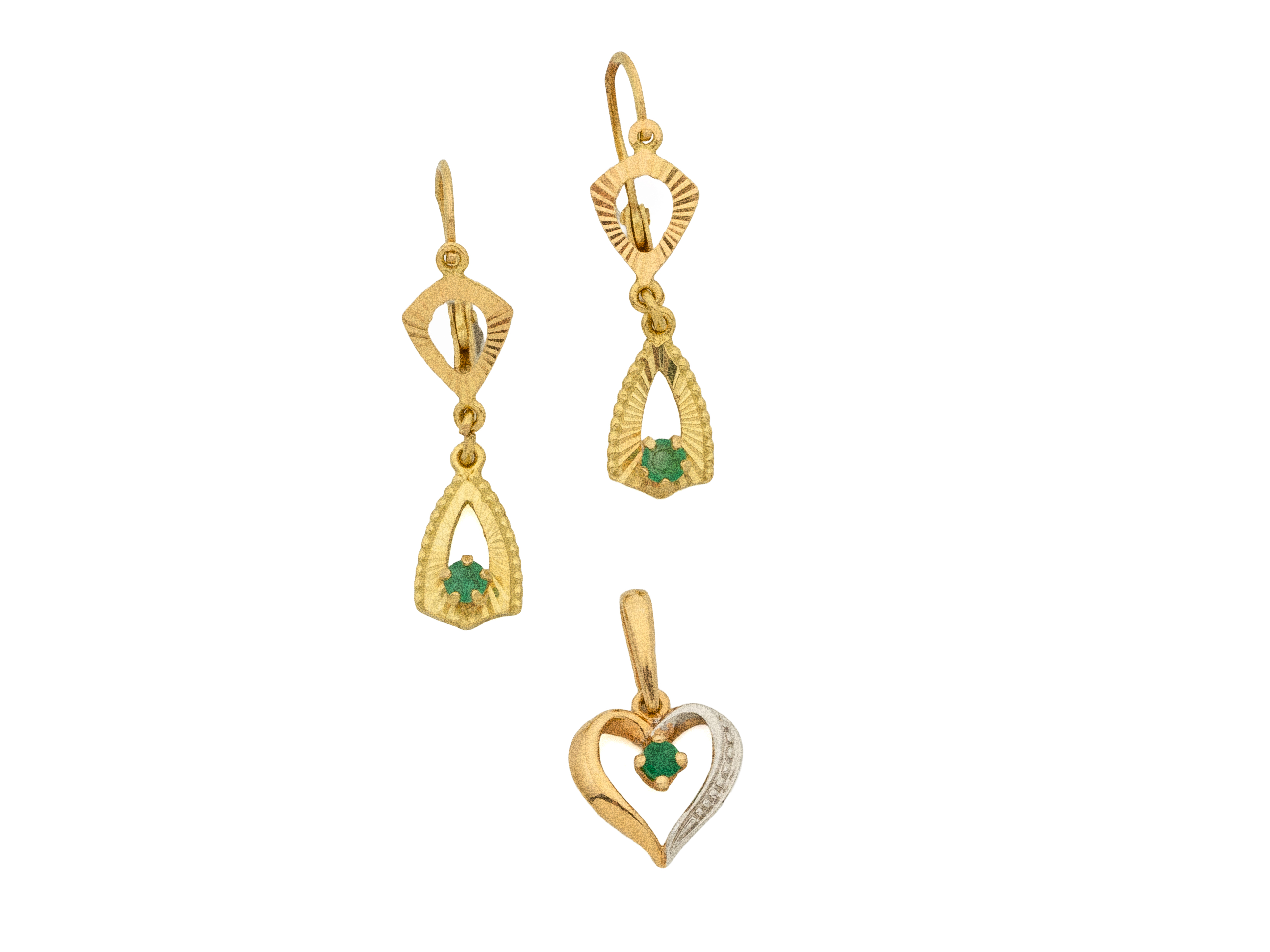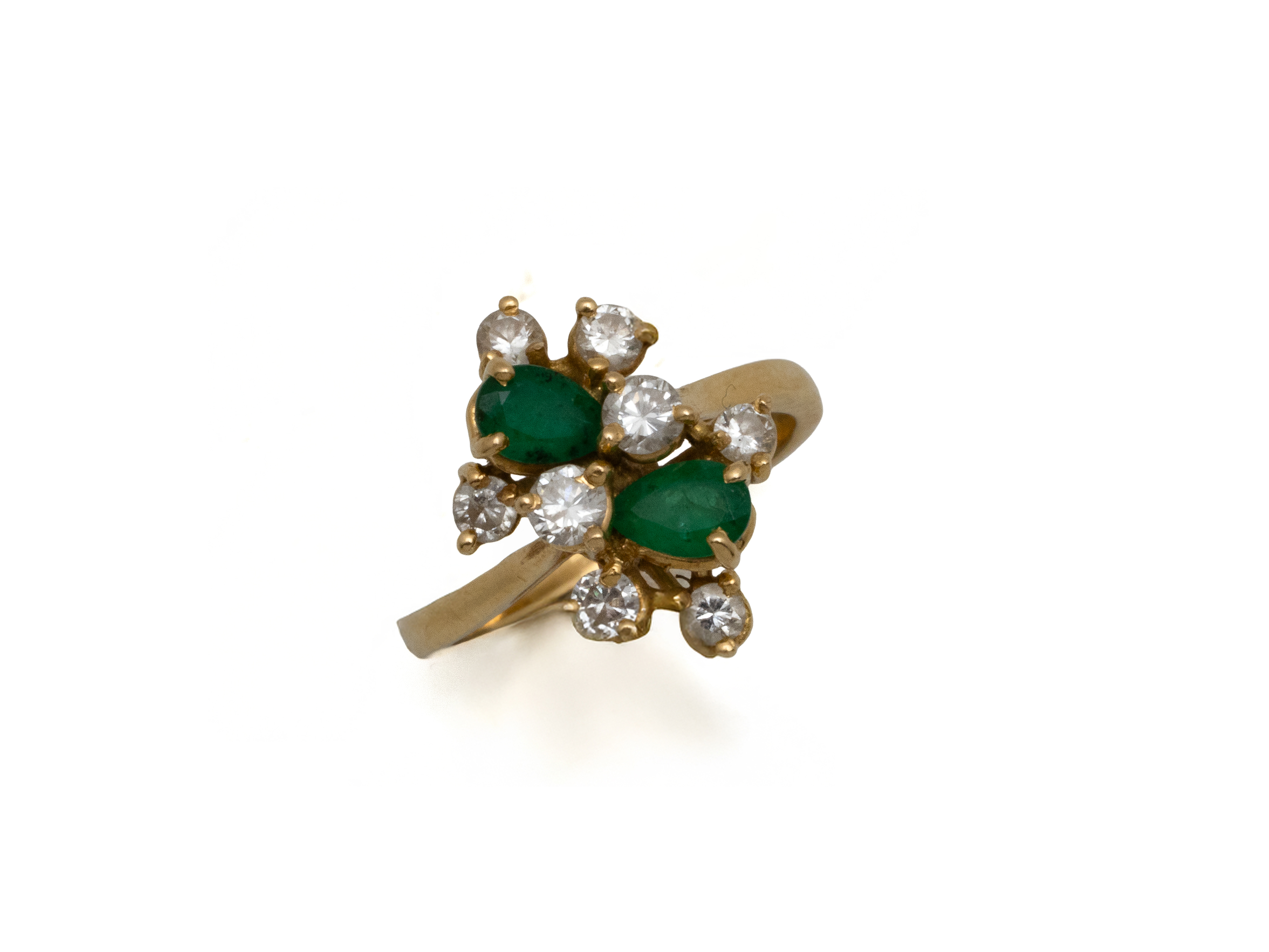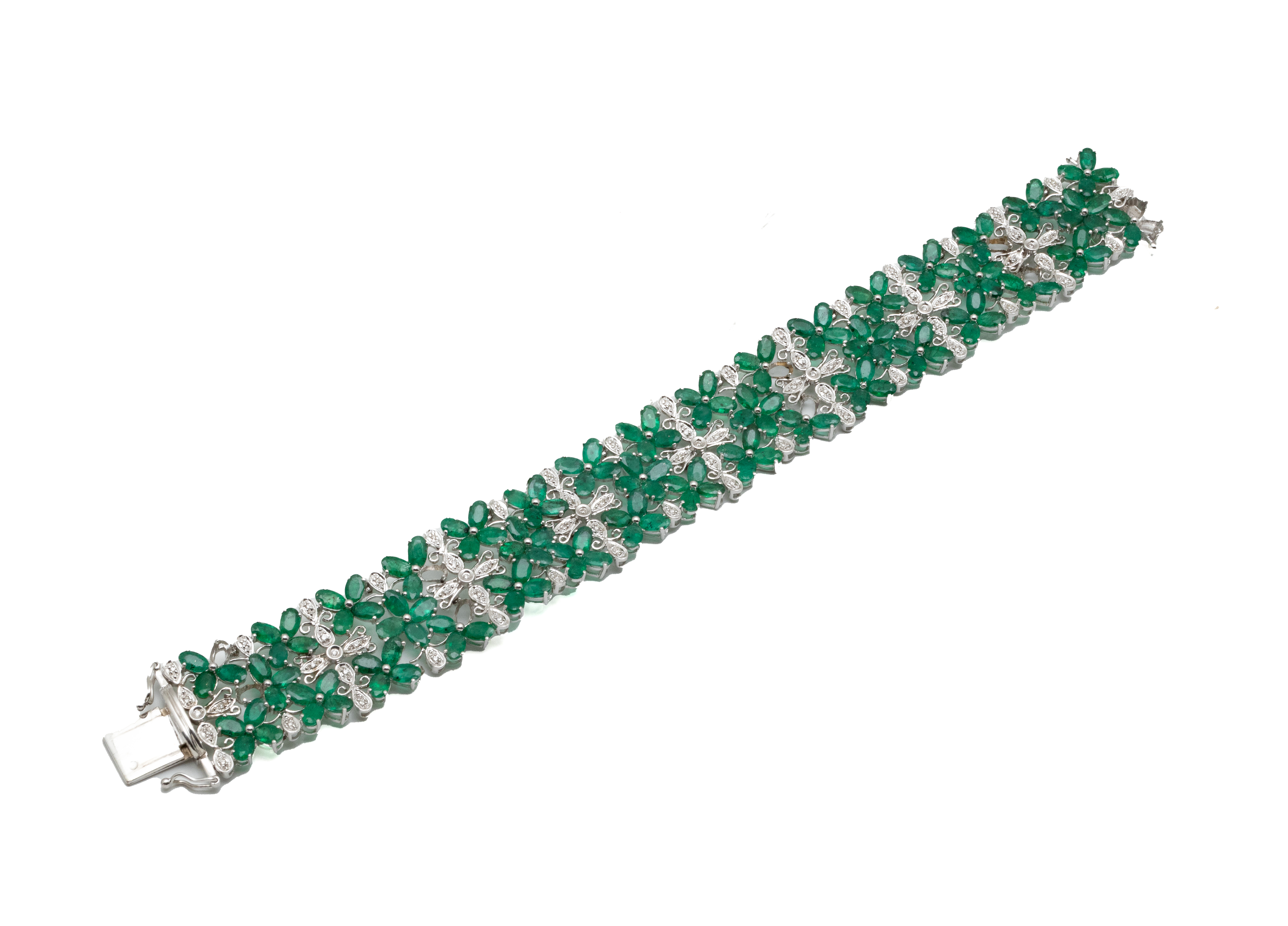 Lot n°246NV9091Bracelet articulé en or 585 millièmes composé de maillons à décor floral habillés d'émeraudes et de diamants brillantés. Il est agrémenté d'un fermoir à cliquet avec double huit de sécurité. (déformations et accidents, manques)