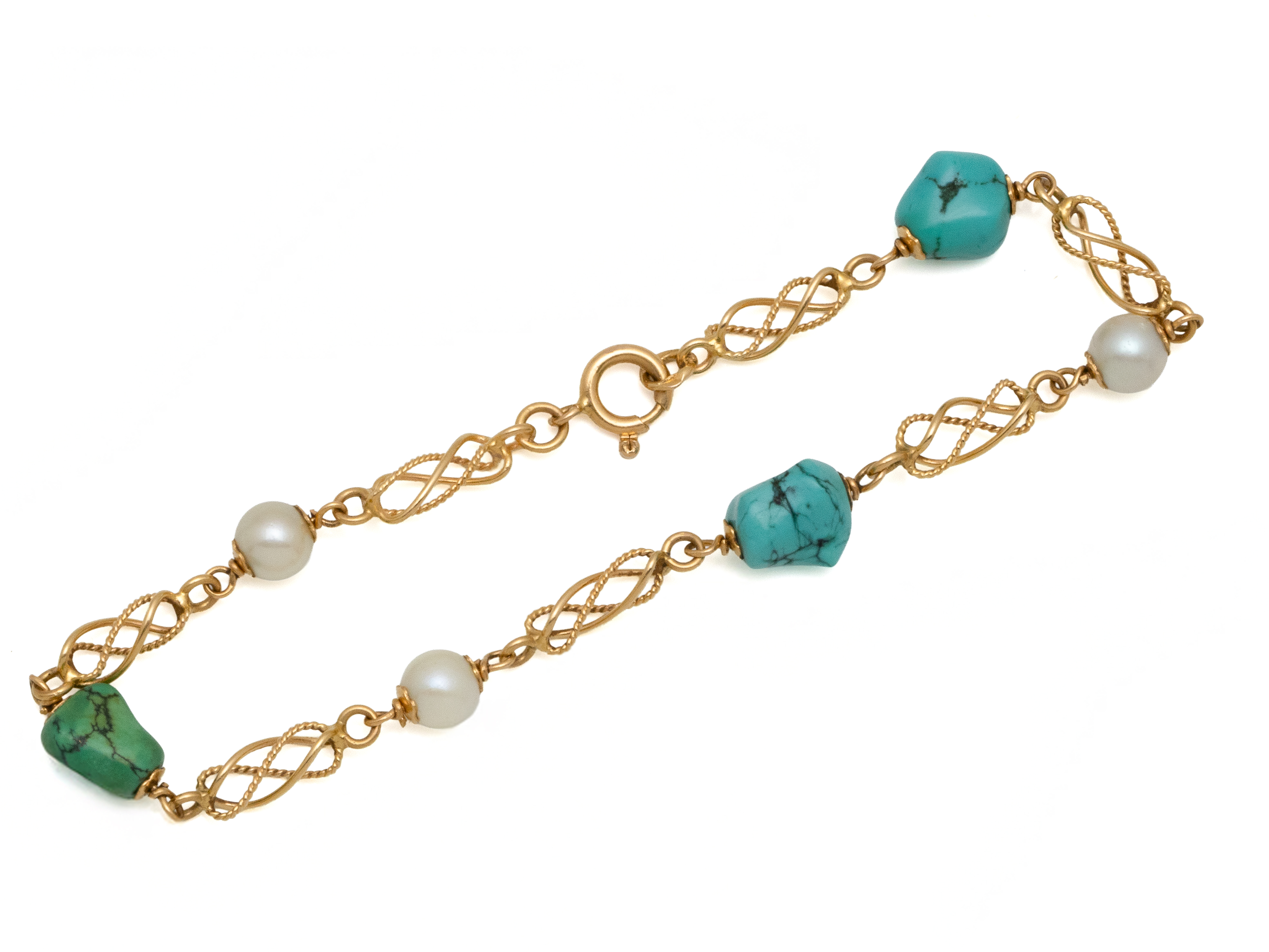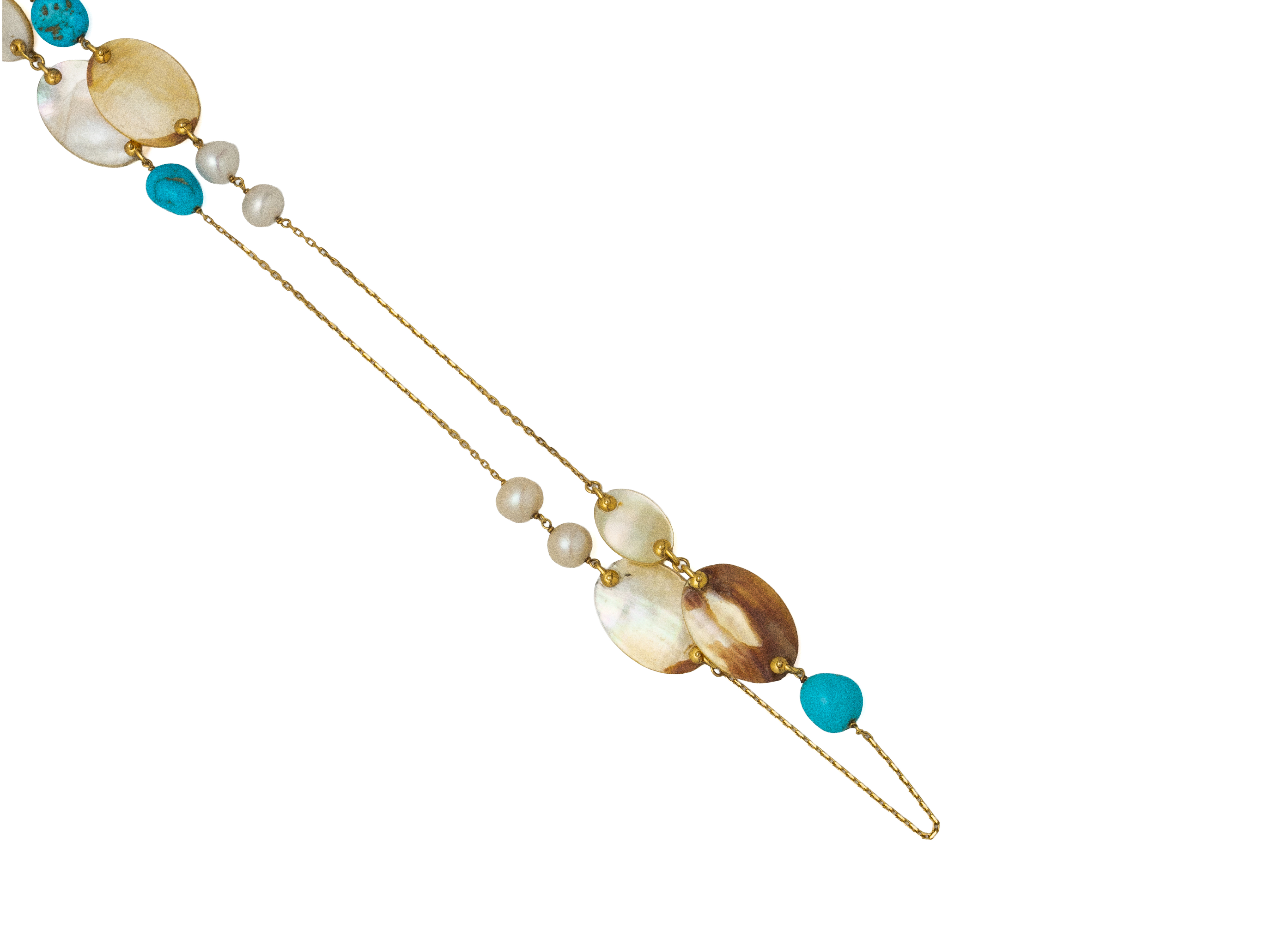 Lot n°240NV9092Sautoir or 750 millièmes décoré de motifs en nacre, de perles de culture et de turquoise matrix. Il est agrémenté d'un fermoir mousqueton.