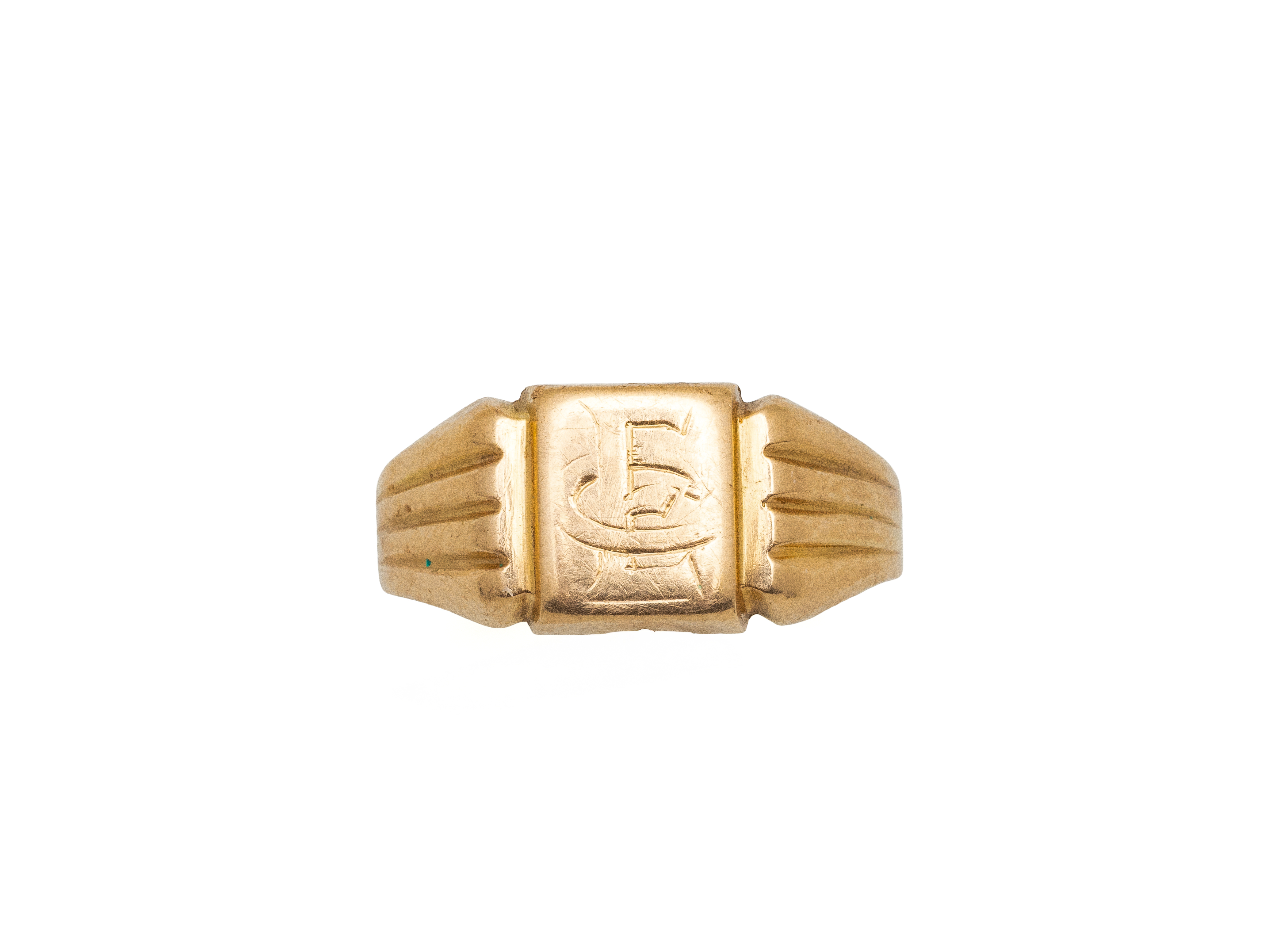 Lot n°62NV9094Bague chevalière de dame en or 750 millièmes, monogrammée ''EC'', épaulée de motifs rainurés. Travail Français. (légère déformation)