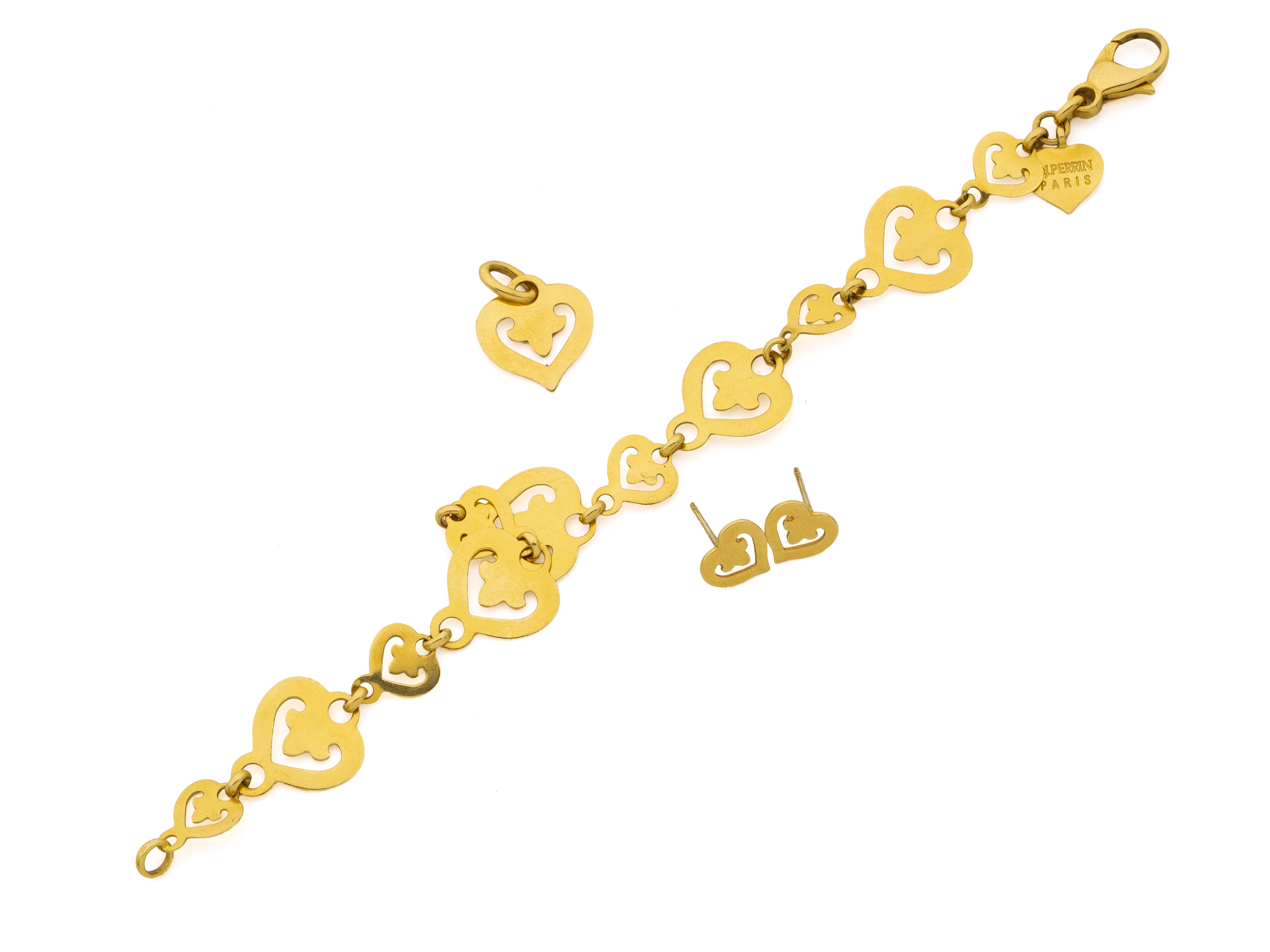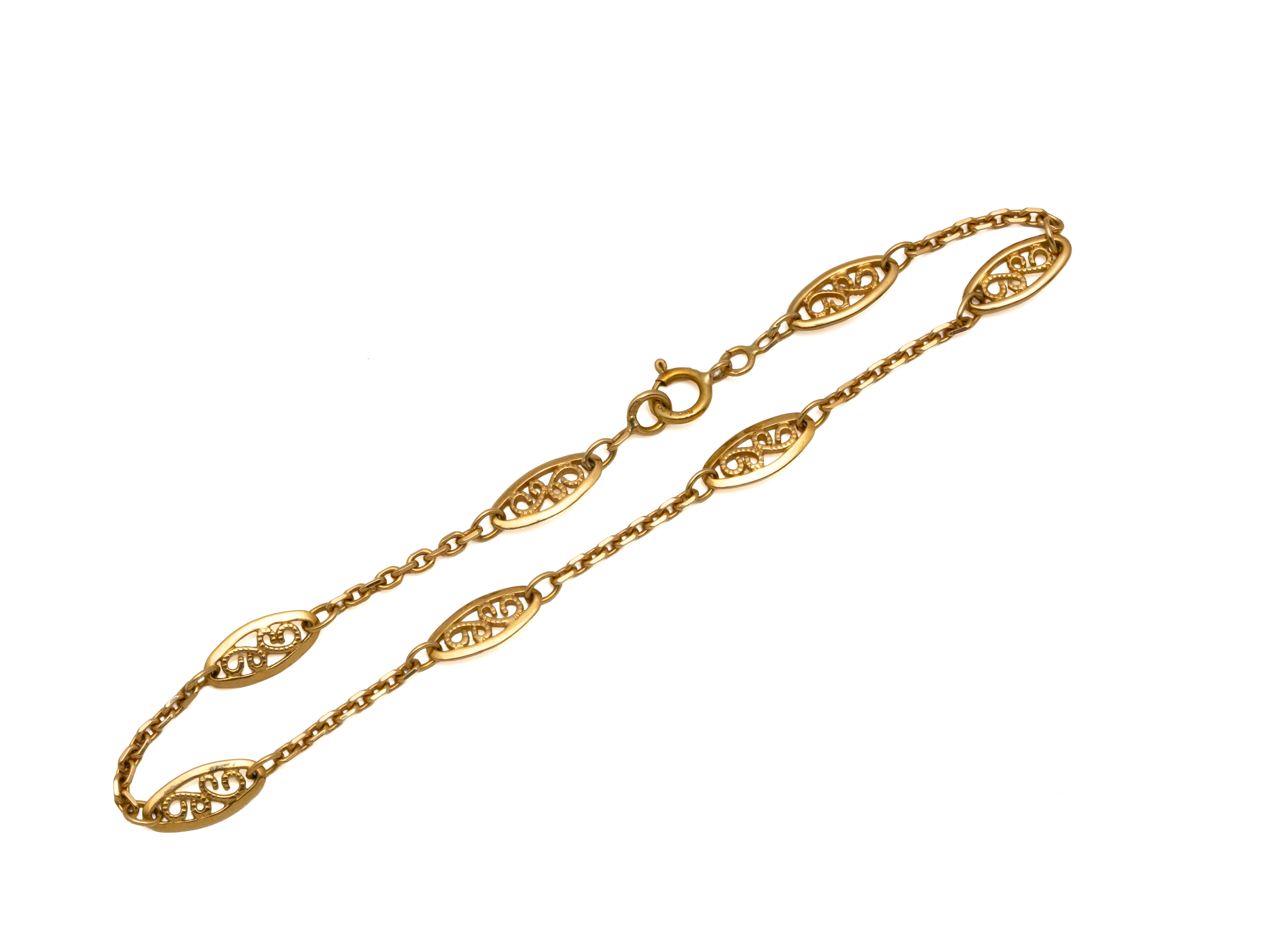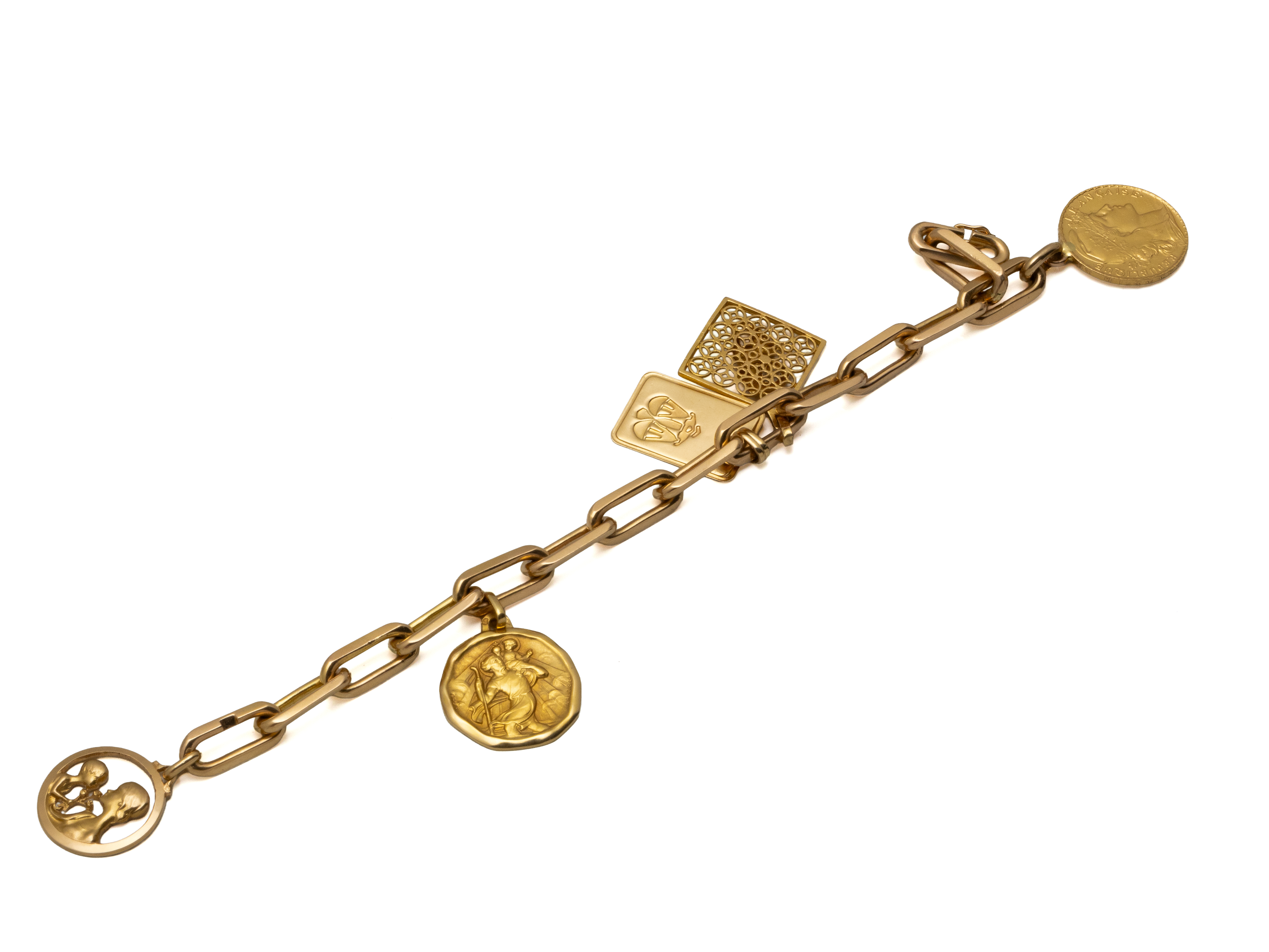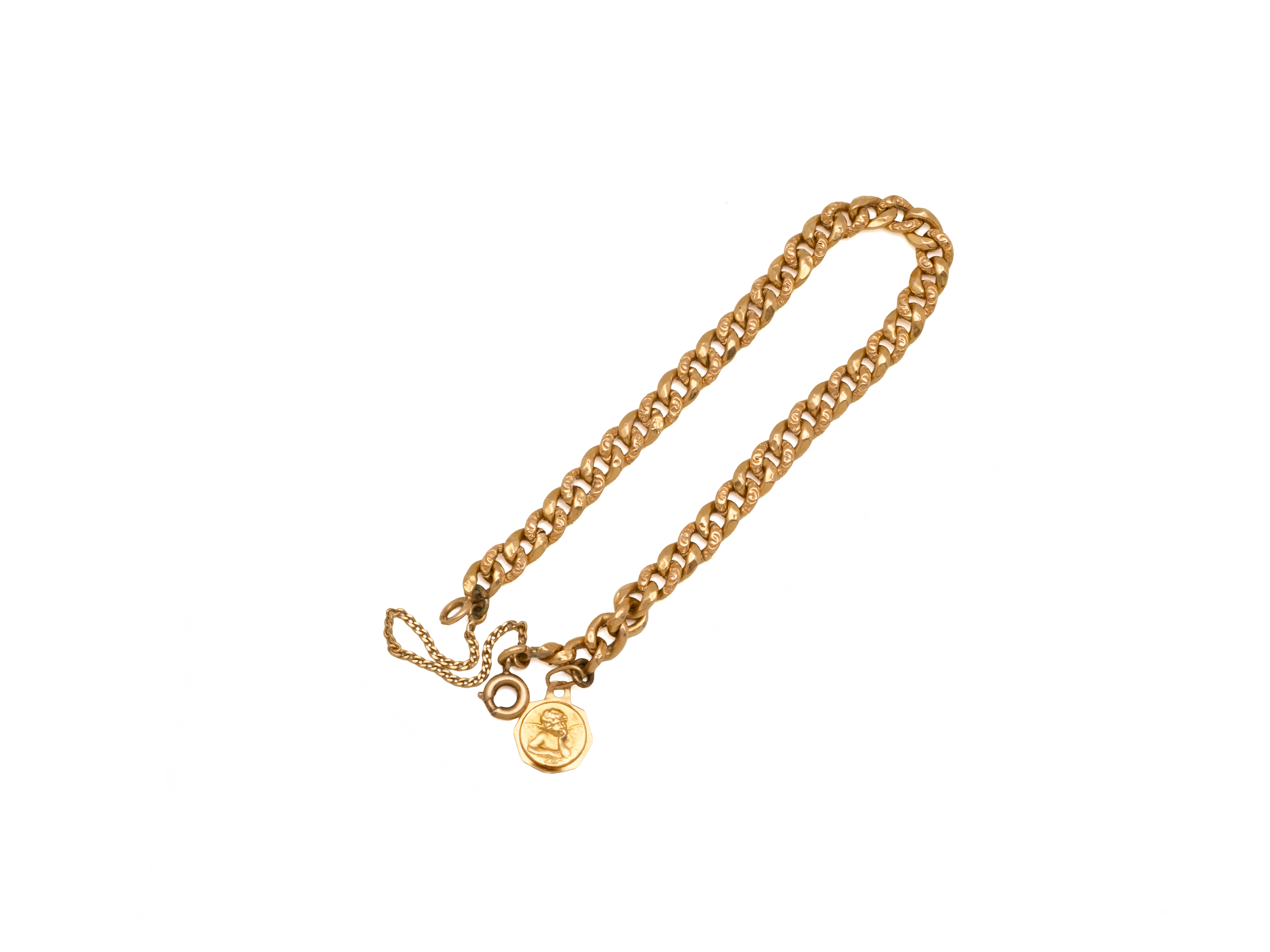 Lot n°66NV9099Bracelet en or 750 millièmes, maille gourmette partielle ciselée, agrémenté d'une petite médaille en or 750 millièmes figurant un chérubin et d'un fermoir anneau ressort avec chaînette de sécurité. Travail Français vers 1950. (chocs)
