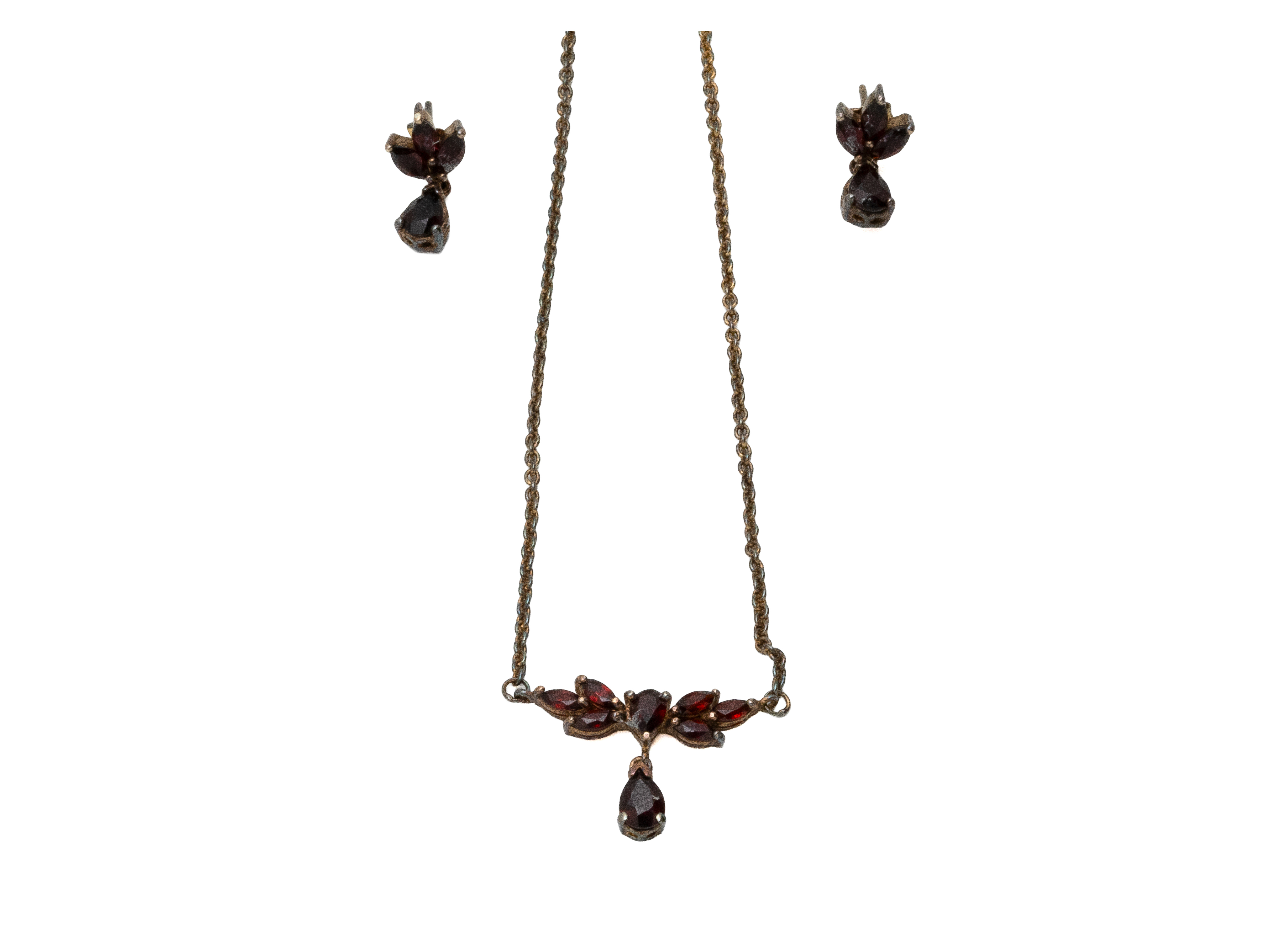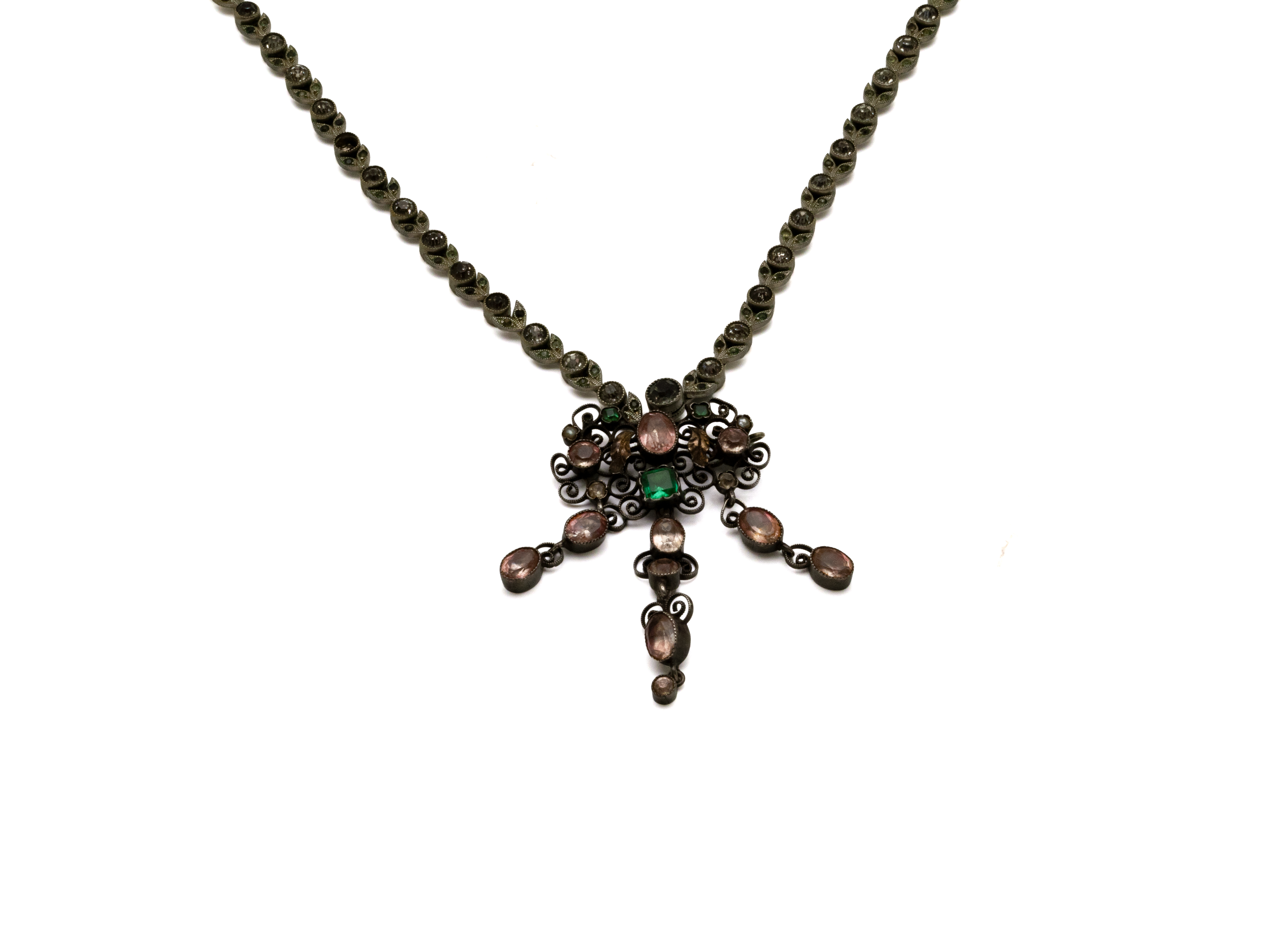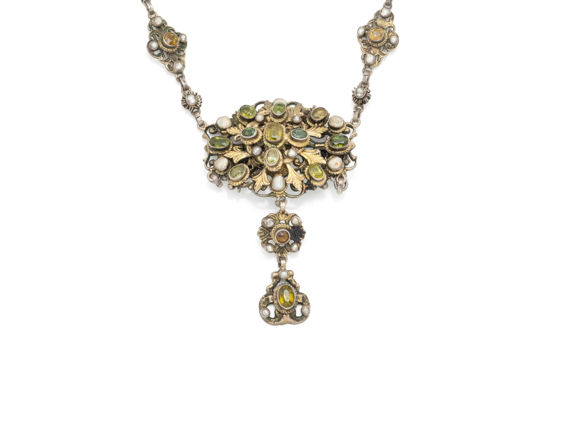 Lot n°39NV9224Collier articulé en vermeil 800 millièmes retenant un beau et important pendentif décoré de pierres de couleur en serti clos ponctué de petites perles rehaussé de 3 pampilles à l'identique. Tour de cou agrémenté d'un fermoir à cliquet. Travail probablement Austro Hongrois de la fin du XIX°siècle.