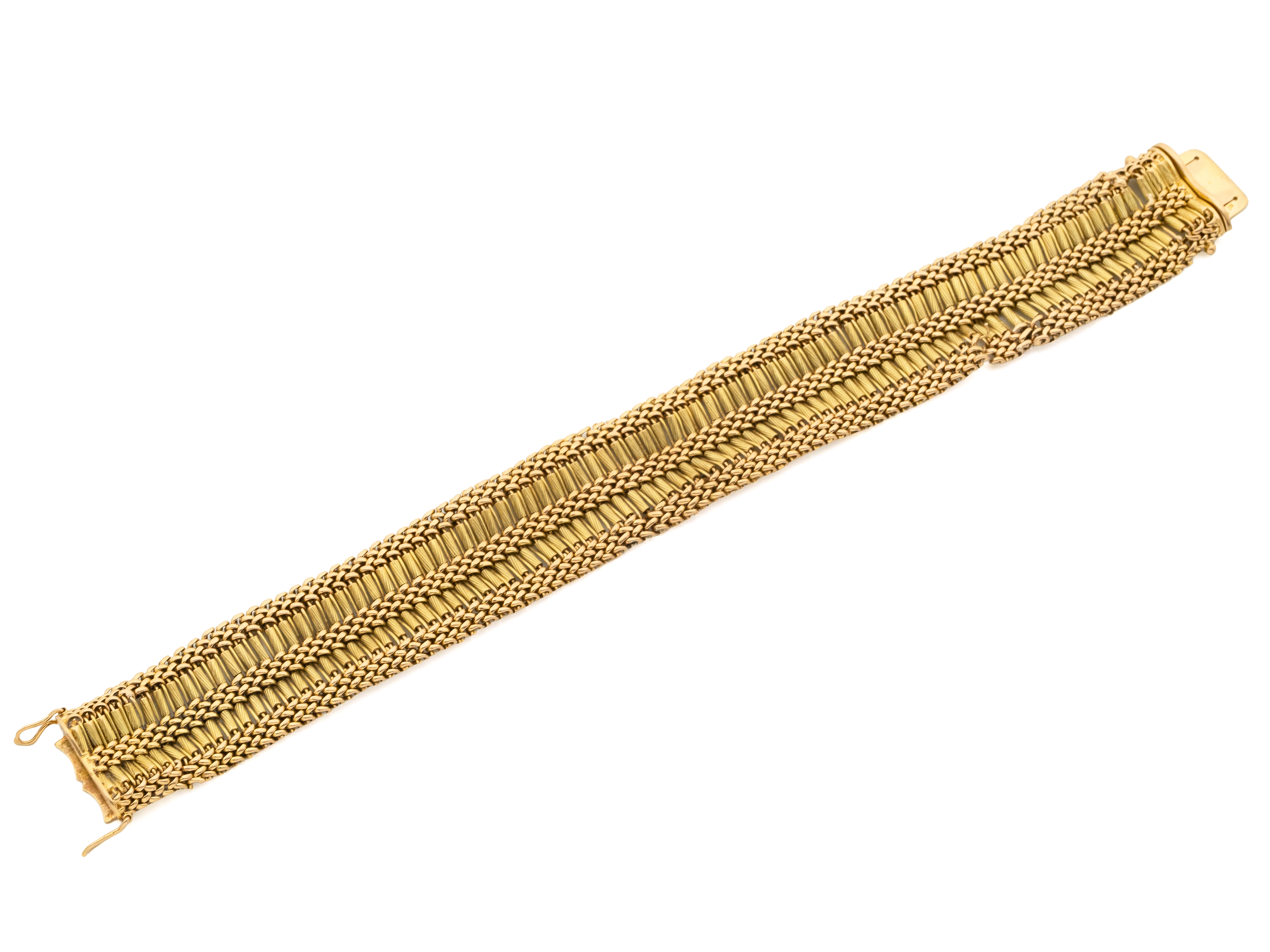 Lot n°221NV9133Bracelet articulé en or 750 millièmes, maillons stylisés, agrémenté d'un fermoir à cliquet avec double huit de sécurité. Travail français vers 1950. (en l'état, accidenté)