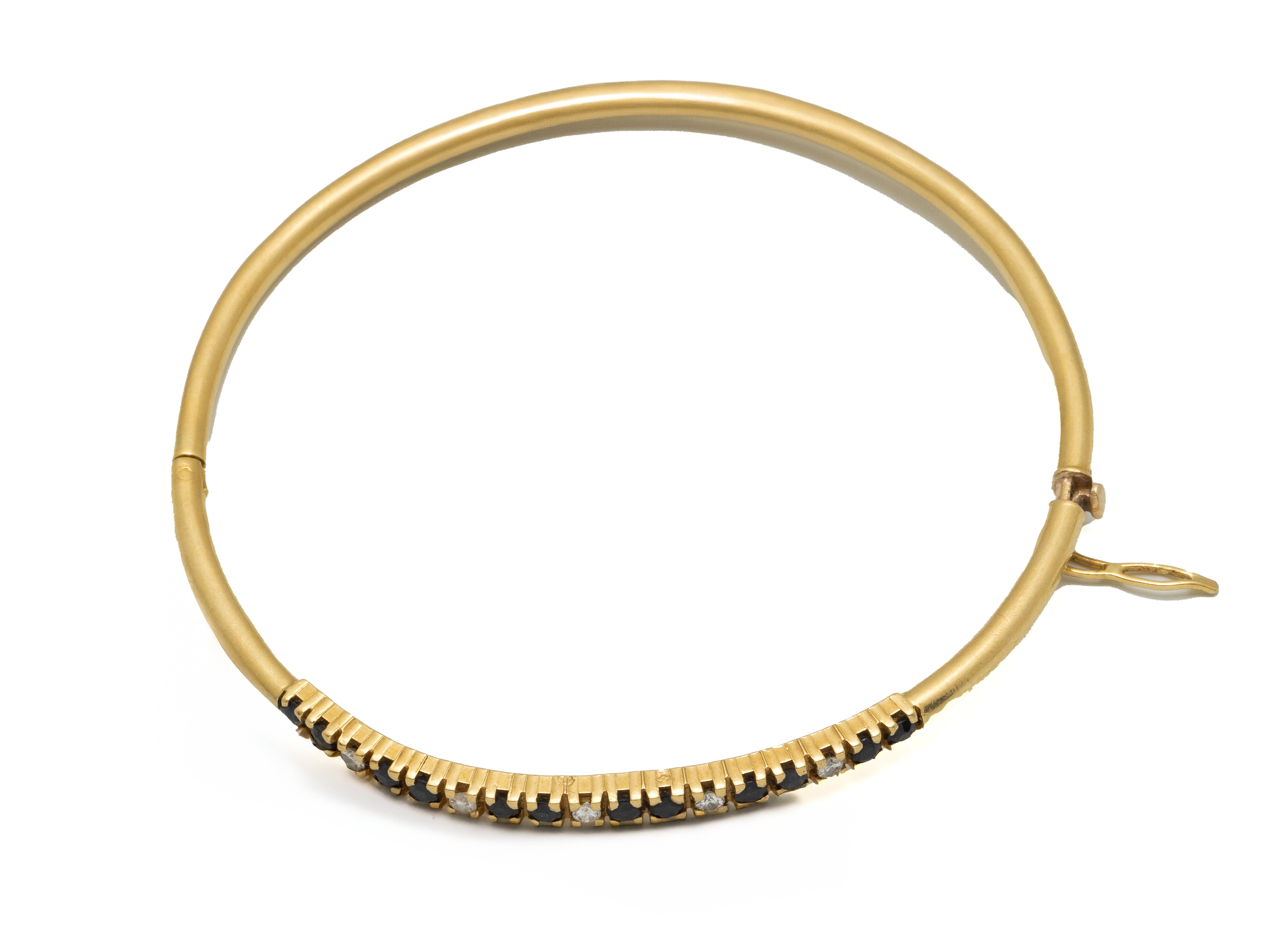 Lot n°225NV9137Bracelet jonc rigide ouvrant à charnière en or 750 millièmes, orné d'une ligne de saphirs ronds facettés alternés de diamants brillantés en serti griffe. Il est agrémenté d'un fermoir à cliquet avec huit de sécurité. (déformation)
