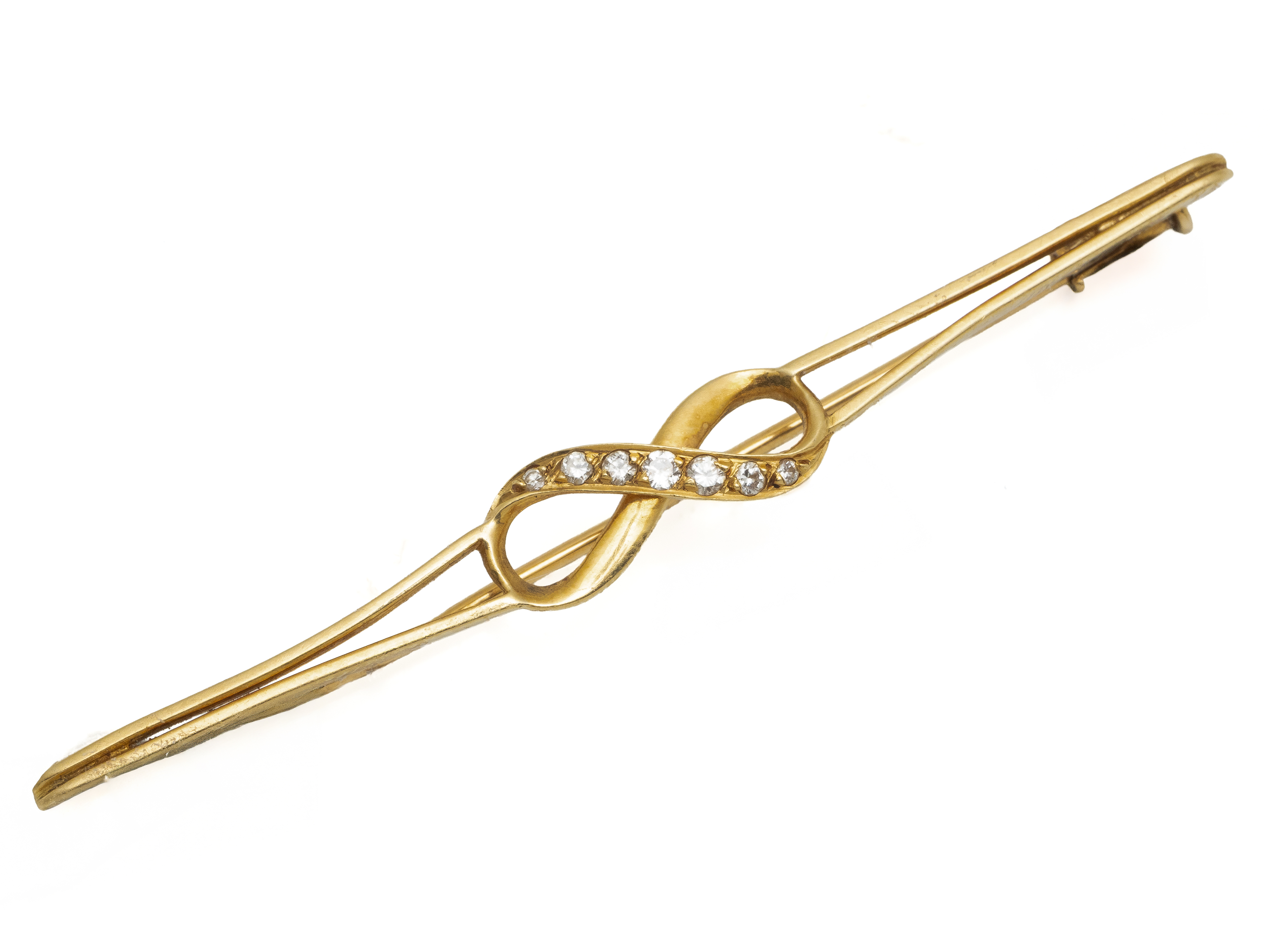 Lot n°227NV9139Broche barrette en or 750 millièmes, centrée d'un motif infini ponctué de diamants brillantés en serti grain. Travail français. (déformations)