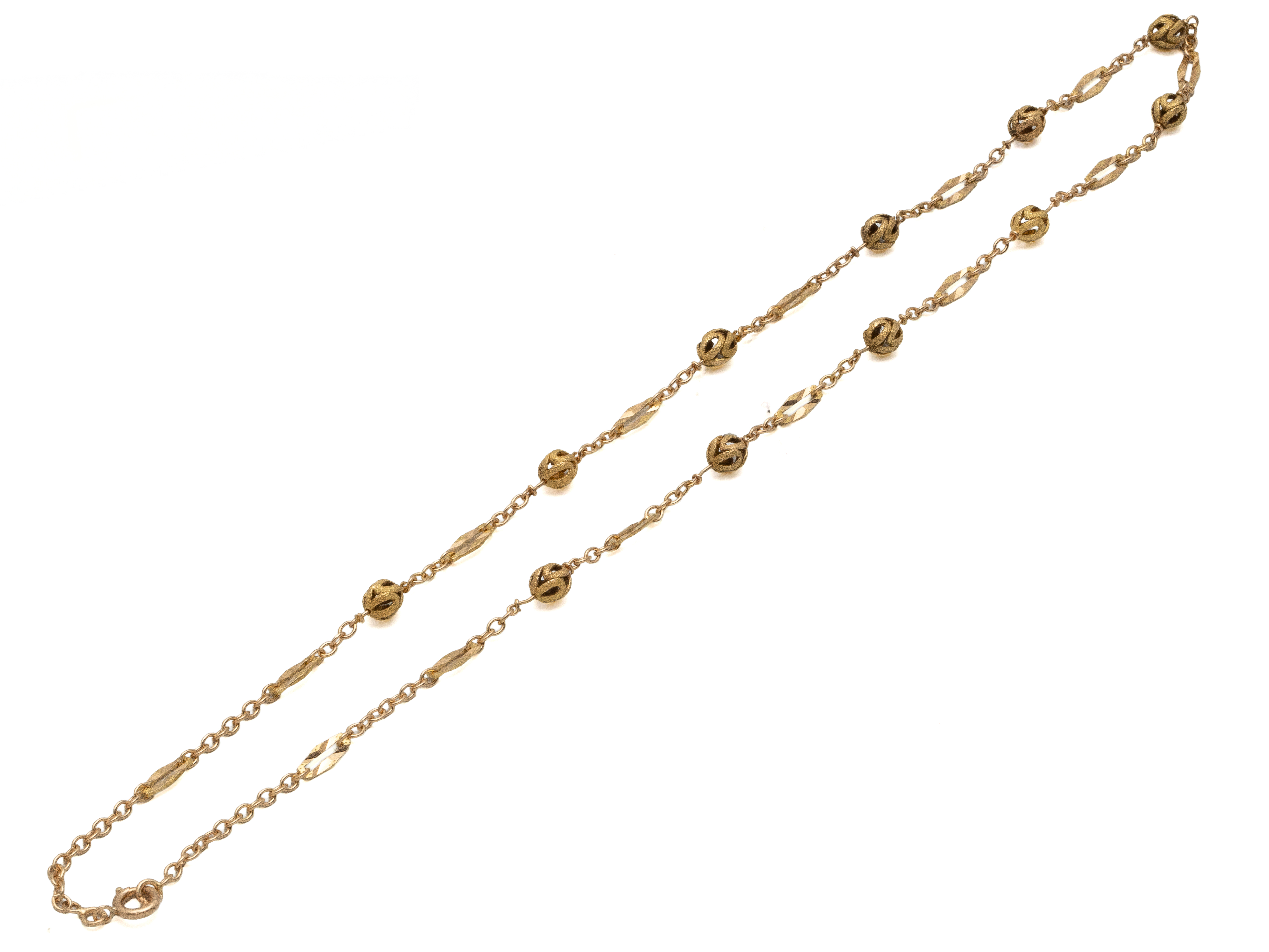 Lot n°230NV9142Collier articulé en or 750 millièmes décoré de maillons stylisés rehaussés de petites boules ajourées. Il est agrémenté d'un fermoir anneau ressort. Travail français.