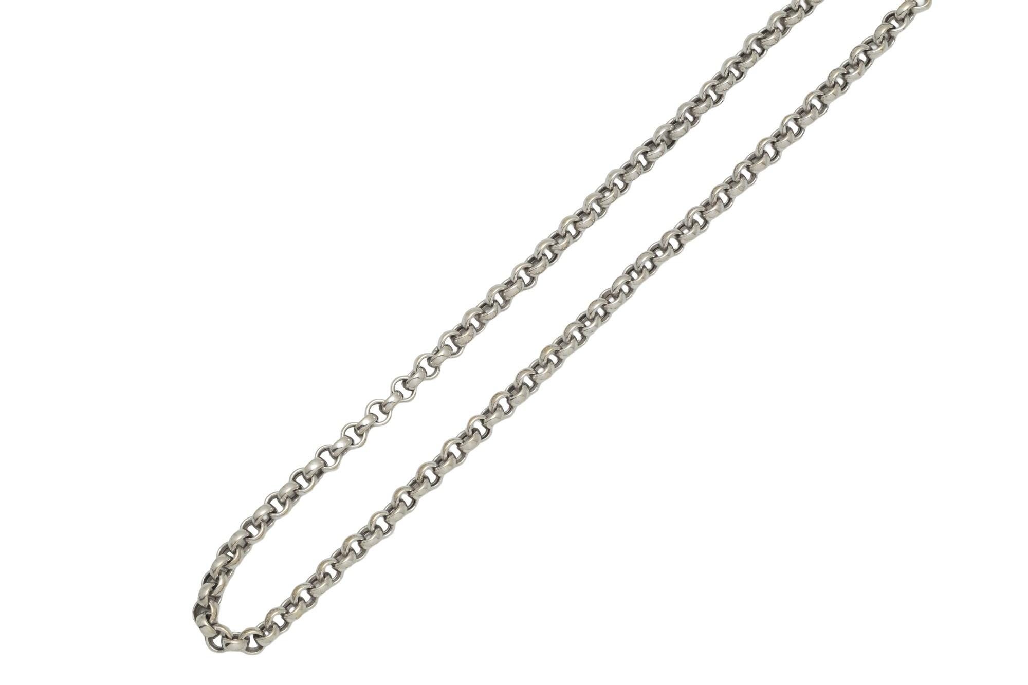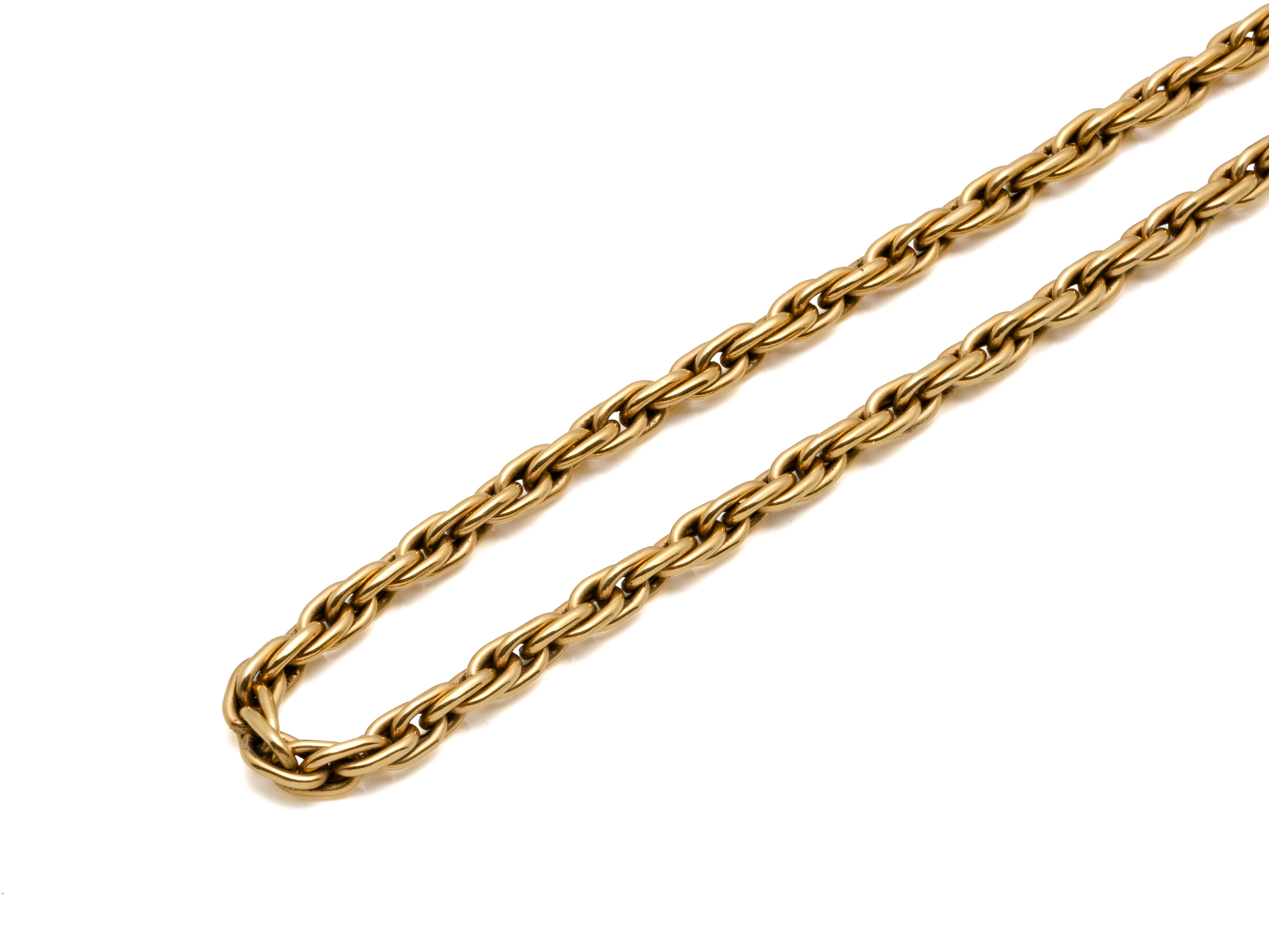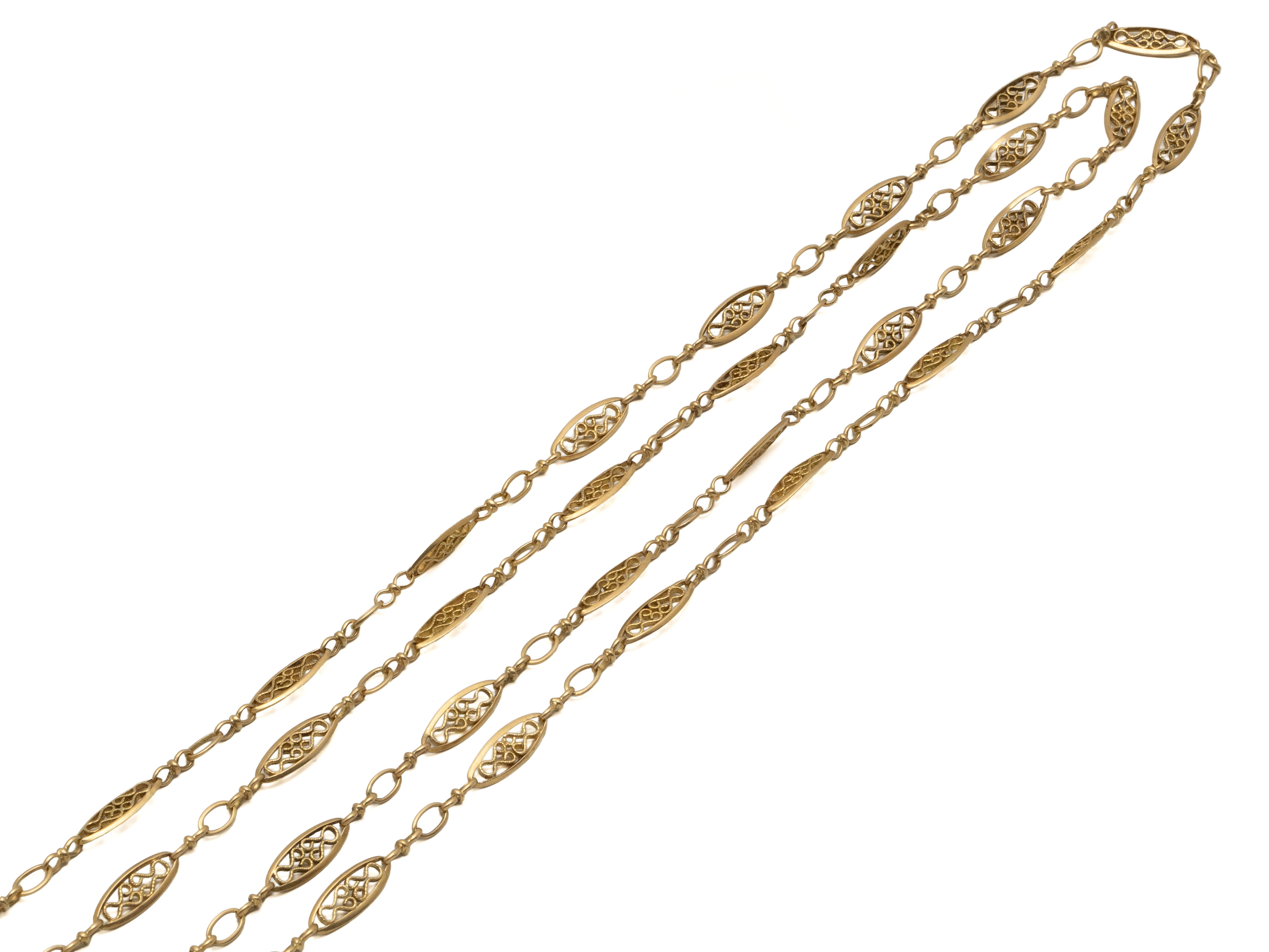Lot n°231NV9143Long sautoir en or 750 millièmes composé de maillons filigranés. Il est agrémenté d'un fermoir anneau ressort en métal. Travail français vers 1900.