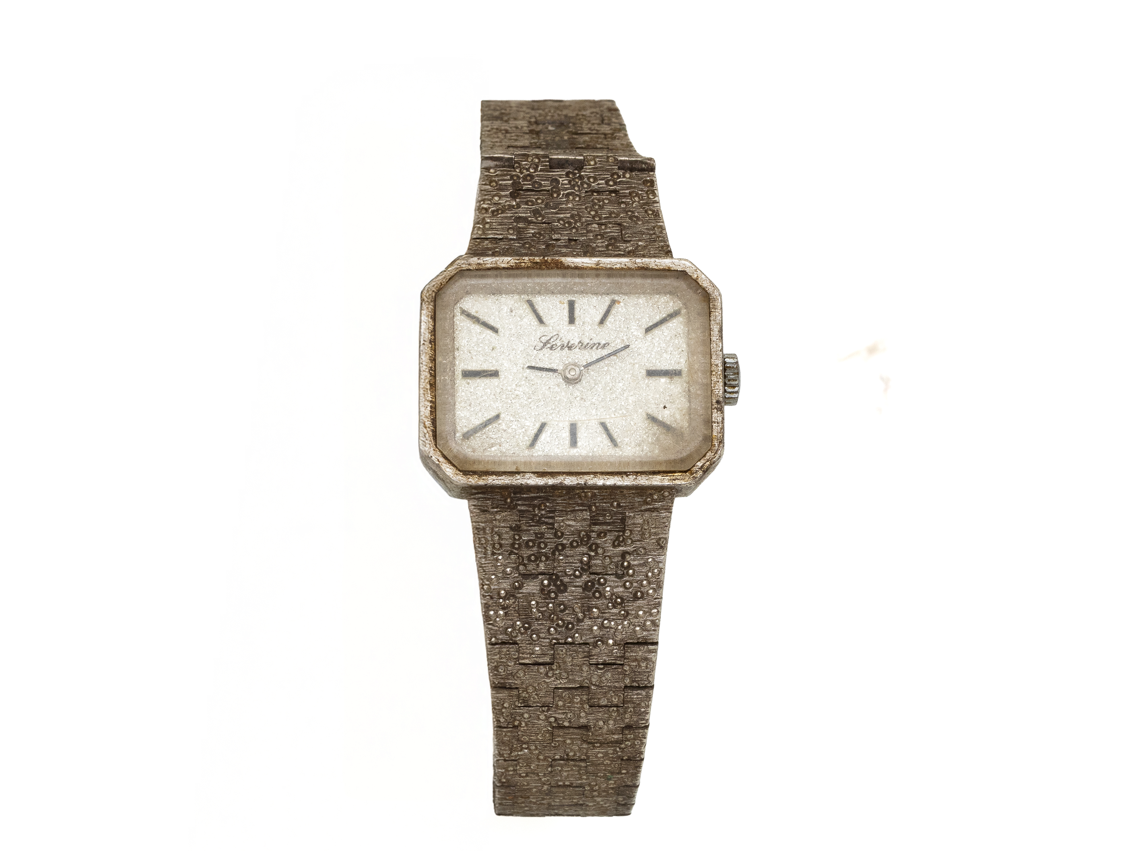 Lot n°232NV9144Montre bracelet de dame en argent 800 millièmes, boîtier de forme octogonale, cadran argenté taché avec index bâtons. Mouvement mécanique suisse. Bracelet souple en argent 800 millièmes, maillons articulés à décor d'écorce guilloché avec fermoir à cliquet. Vers 1970. (usures)