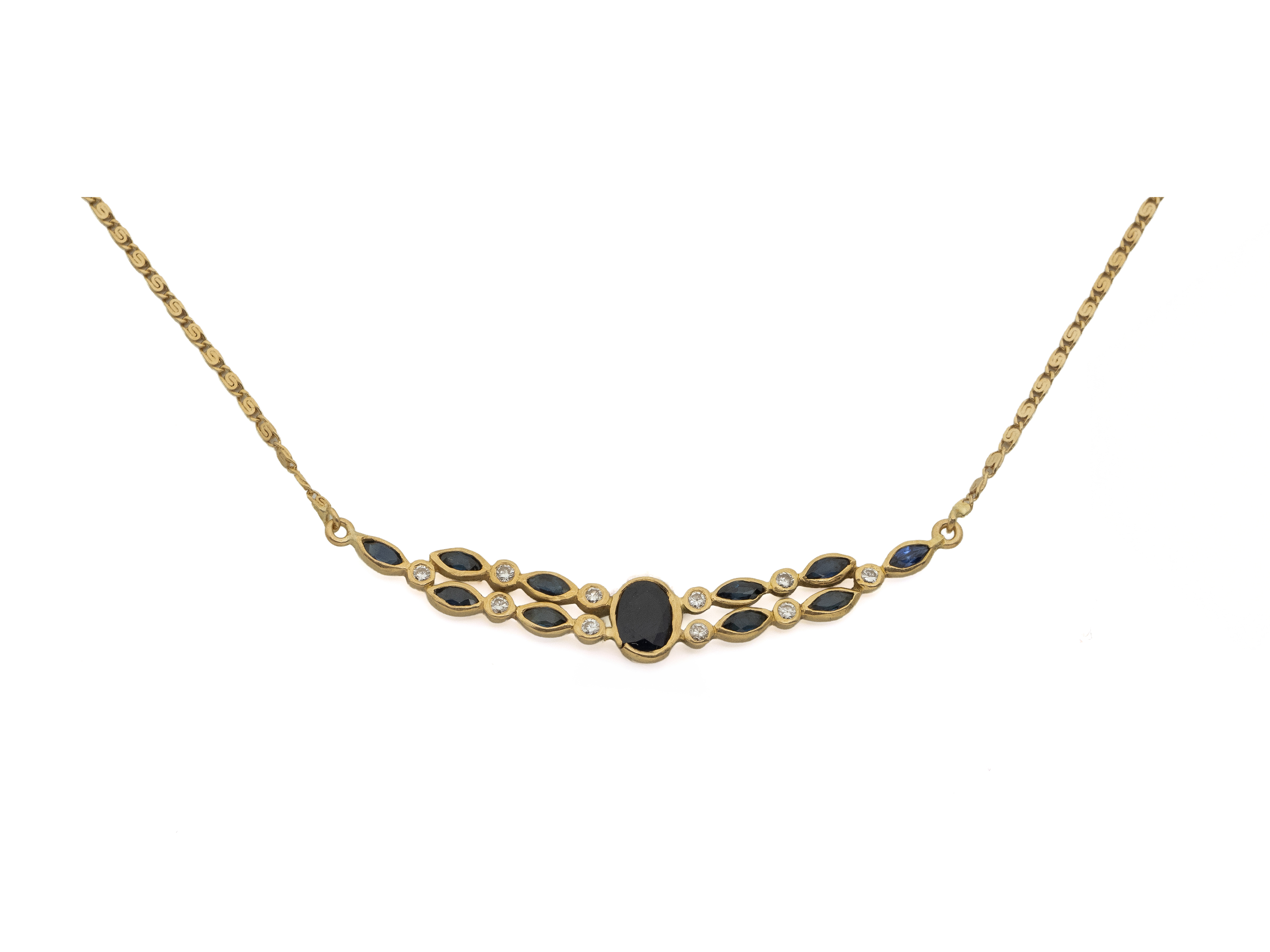 Lot n°236NV9148Collerette en or 750 millièmes, centrée d'un saphir ovale facetté en serti clos épaulé de petits diamants brillantés et de saphirs navettes. Elle est agrémentée d'un fermoir anneau ressort. Travail français.