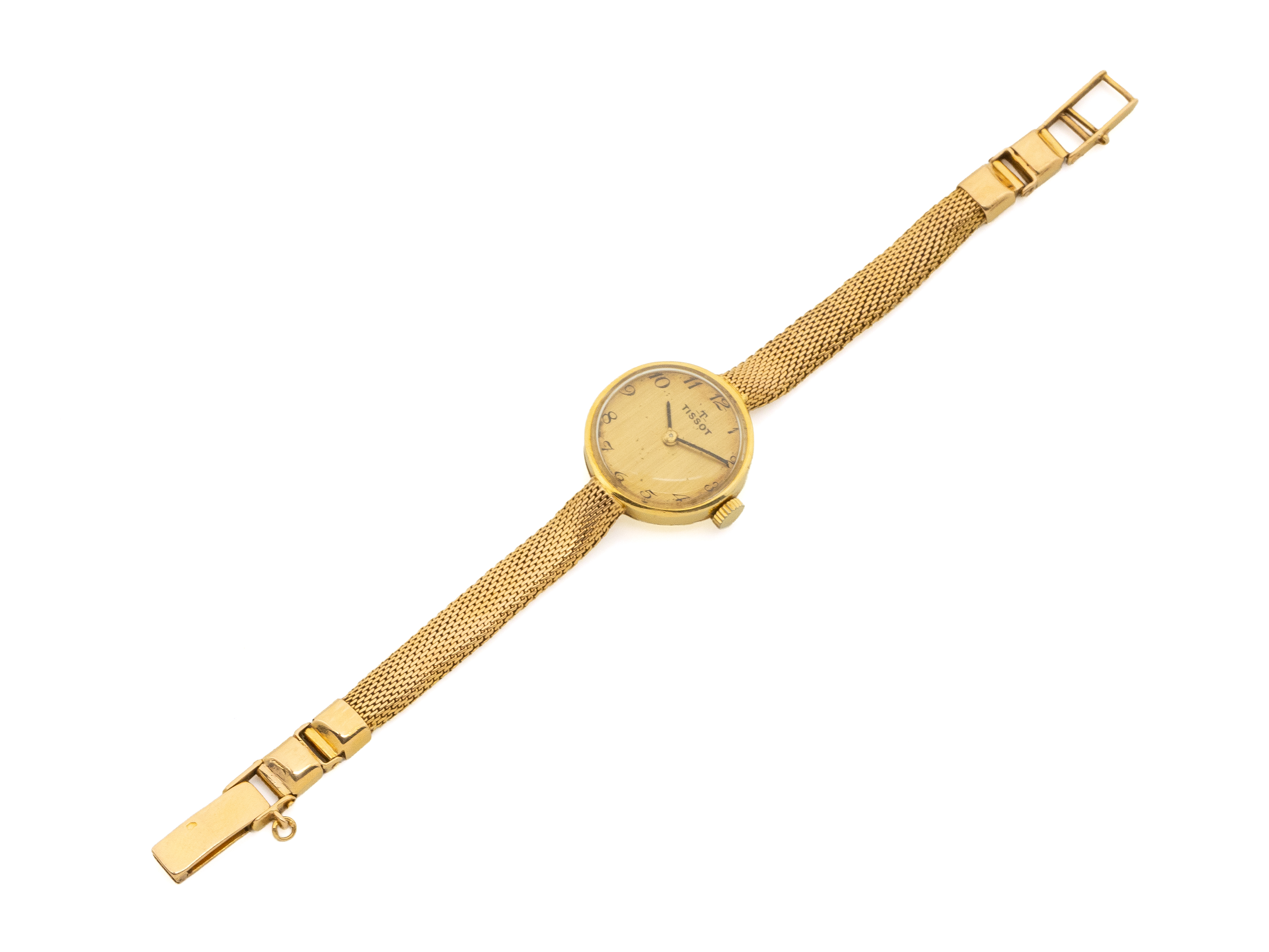 Lot n°203NV9023Montre bracelet de dame en or 750 millièmes, cadran ivoire rayonnant avec chiffres arabes en relief, lunette biseautée. Mouvement mécanique suisse. Bracelet rapporté en métal doré, maillons articulés avec fermoir extensible à cliquet. Travail français pour la boîte, vers 1940. (rayures, verre craquelé)