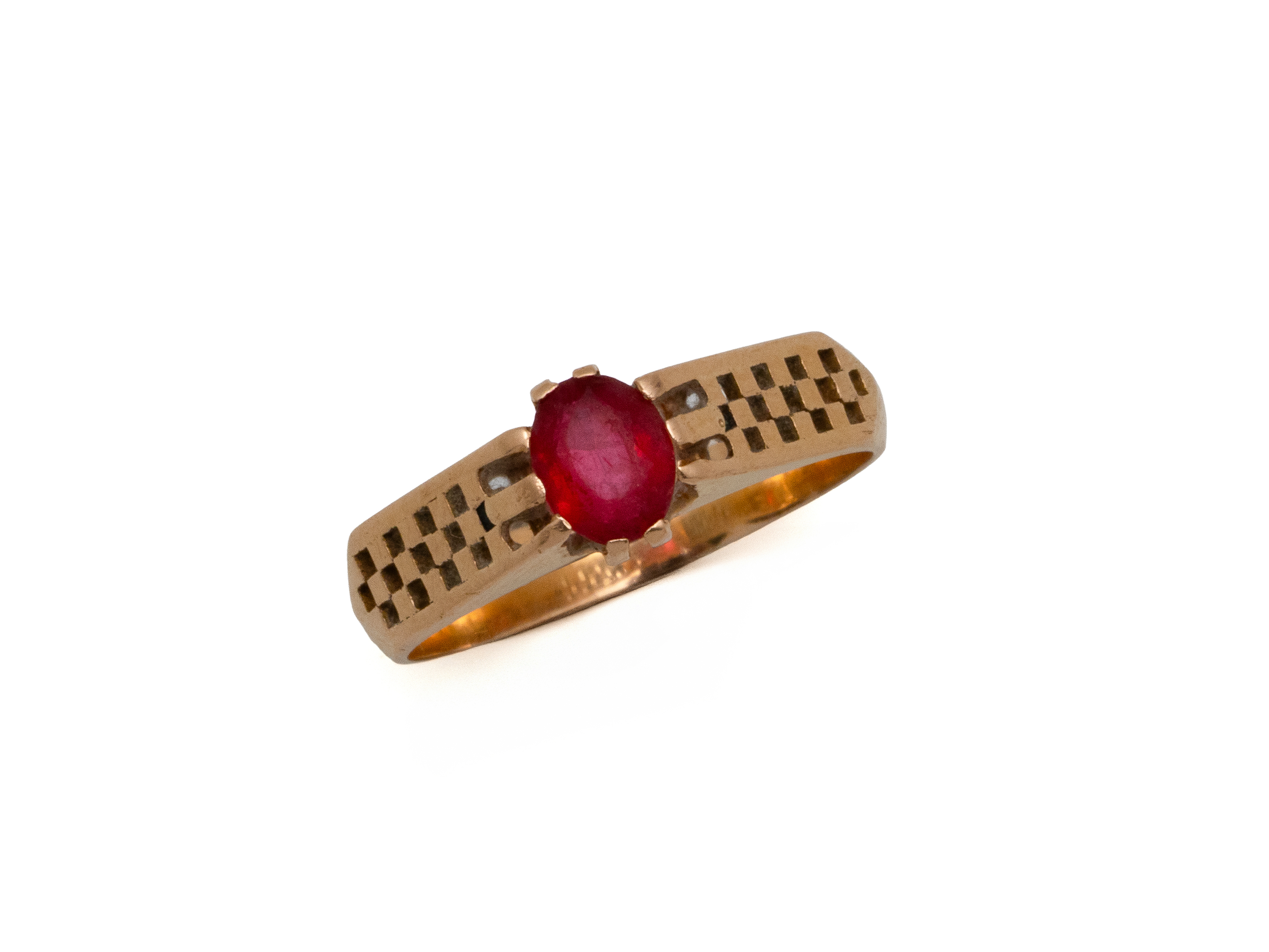 Lot n°295NV9169Bague chevalière d'enfant en or 750 millièmes, ornée d'une pierre verte épaulée de petit rubis facettés en serti grain. Travail français. (petit manque de matière sur la pierre verte)