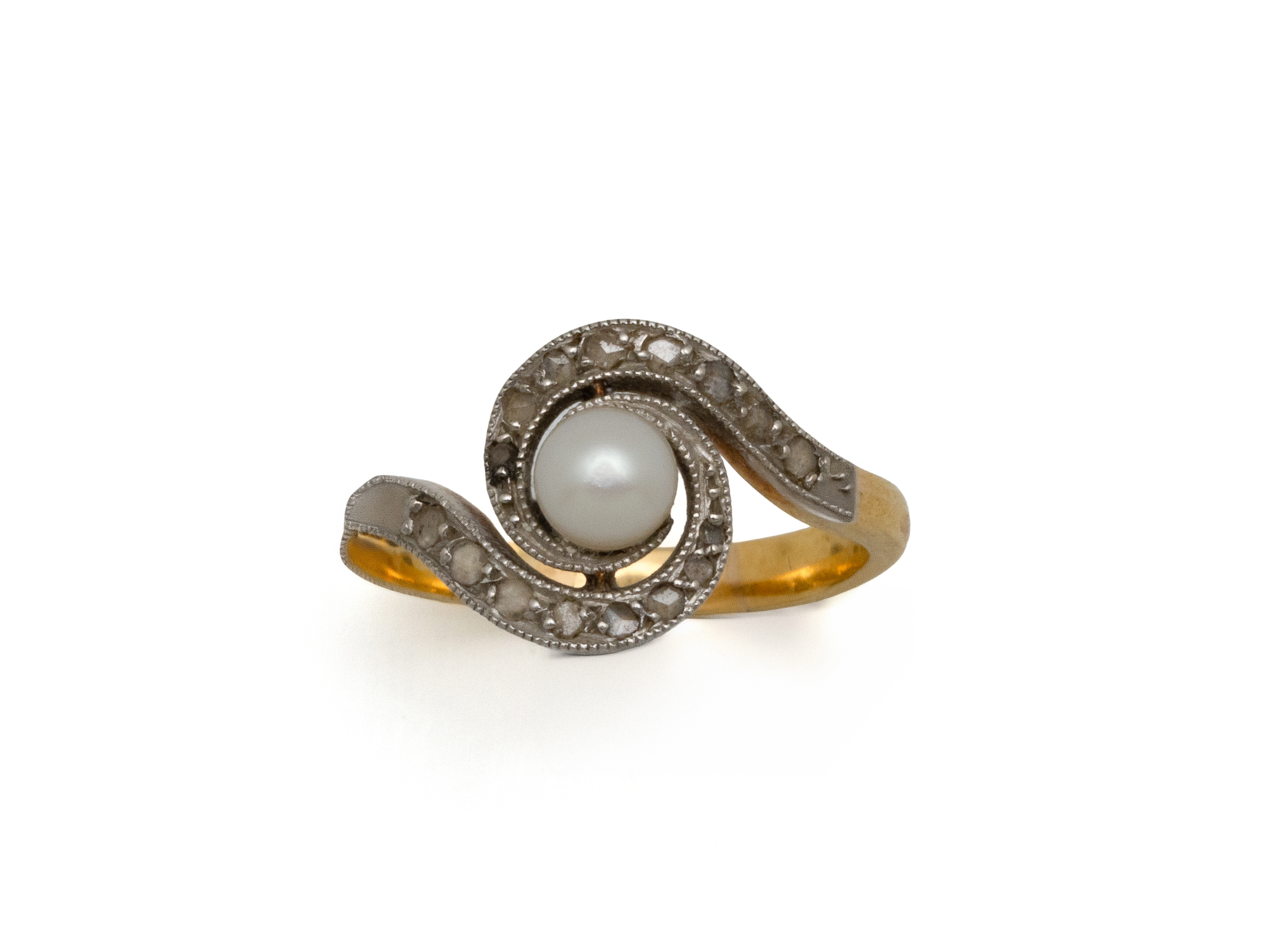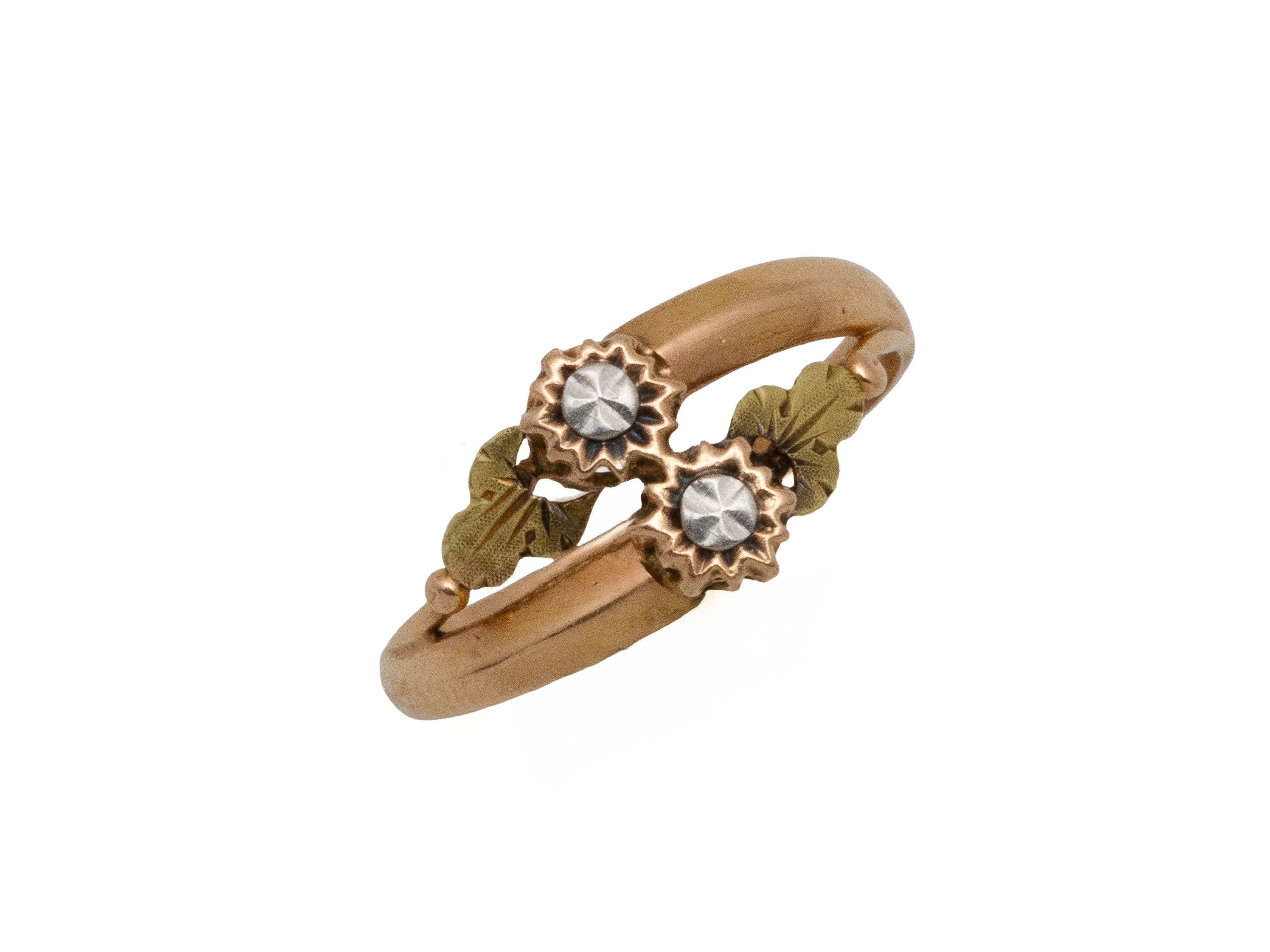 Lot n°31NV9167Petite bague toi et moi 3 tons d'or 750 millièmes, épaulée de motifs feuillagés. Travail français de la fin du XIX° siècle.