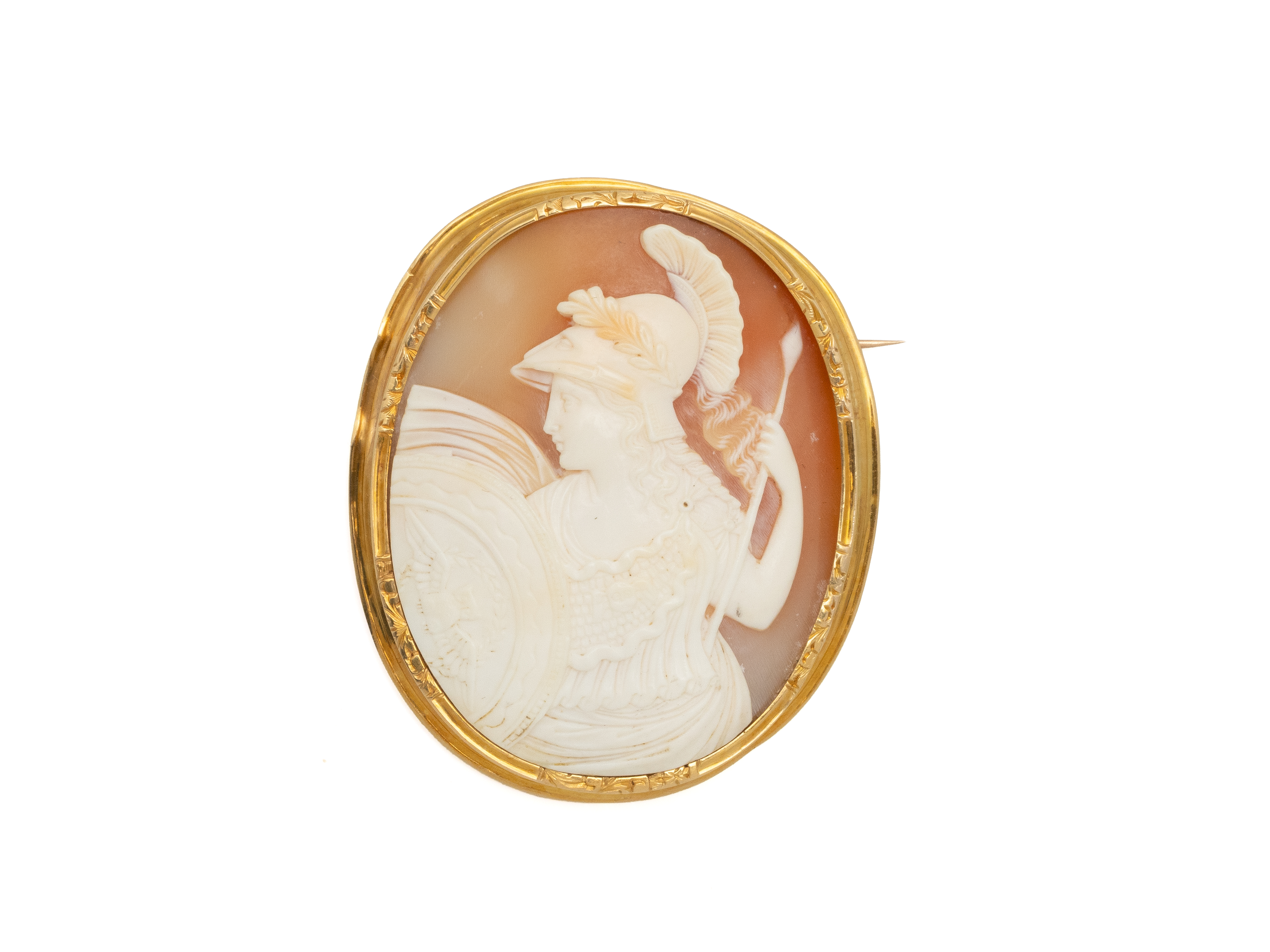Lot n°26NV9186Broche en or 750 millièmes, de forme ovale, ornée d'un camée coquille figurant Athena. La monture partiellement ciselée de rinceaux feuillagés. Travail français de la seconde moitié du XIX° siècle. (traces d'étain)